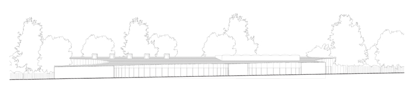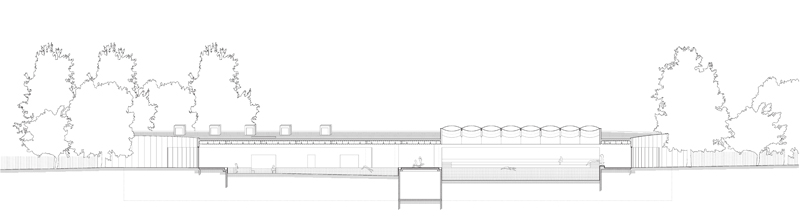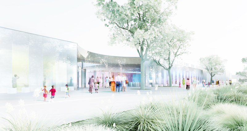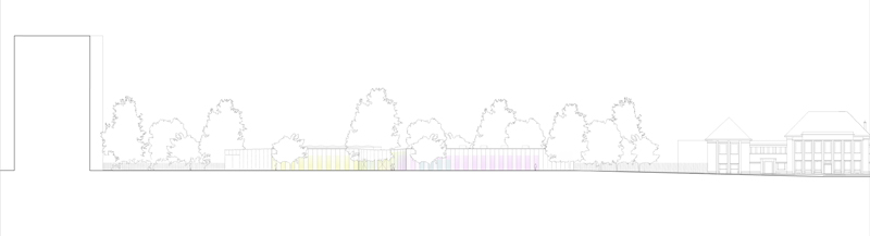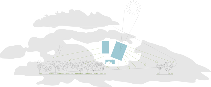 Les parois du bâtiment passent du blanc, au translucide et à la transparence – évocation de pureté et de clarté. Les arbres circonscrits s’y réfléchissent en anamorphose. La toiture s’incline vers le sud, la présence du bâtiment atténue progressivement alors qu’il tend vers les limites parcellaires. Ce plan incliné est traité comme une composition organisant des éléments techniques perçus depuis les immeubles les plus hauts de façon harmonieuse : cheminées solaires, nappes solaires thermiques planes, plafond transparent structurel gonflable hautement diffusant faisant entrer dans le bâtiment la lumière naturelle de la ville avec une parfaite homogénéité.