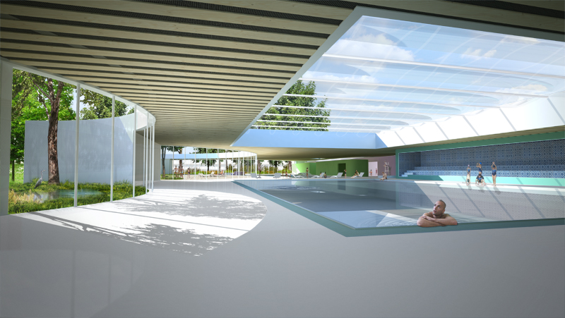 L’enveloppe, est conçue comme un volume protecteur définissant les limites d’un biotope garant d’une climatologie contrôlée dont les limites répondent à des exigences spécifiques, avec une façade urbaine translucide, protectrice, garante d’intimité au nord sur la place, et ouverte au sud sur des jardins-patios, espaces protégés, intimes, pudiques quand le corps devient un enjeu. Protégée des bruits et de l’agitation de la ville, la piscine s’ouvre sur des espaces calmes et arborés – évocation présente, omniprésente de la nature, filtrant le paysage de la ville. Dès lors le propos était de générer de la proximité entre l’eau et le végétal, entre extérieur et intérieur.