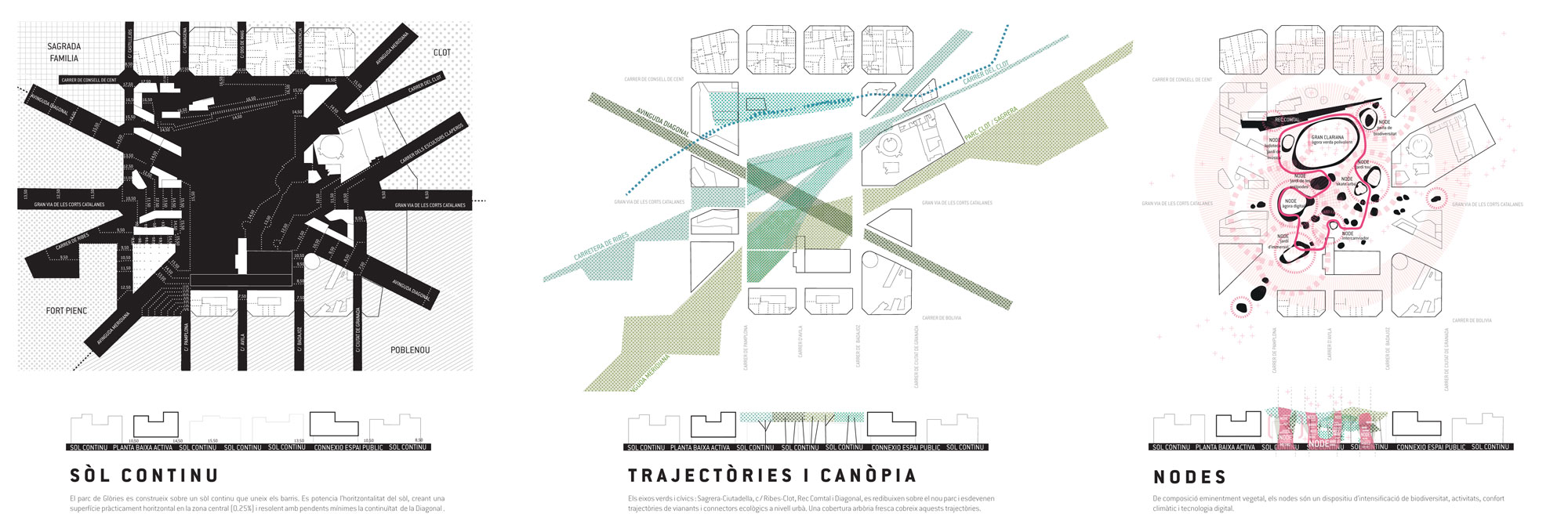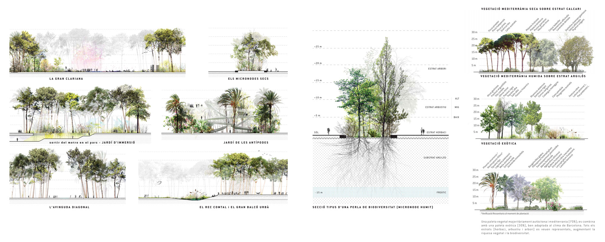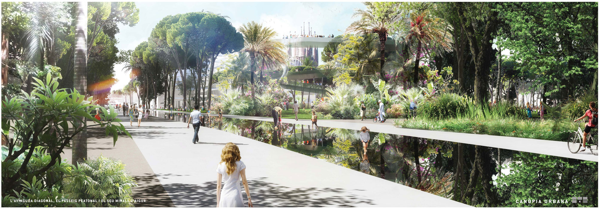 – Una canopia vegetal: que acompaña los ejes cívicos del este de la ciudad, generando la densidad vegetal, y constituyendo la continuidad ecológica entre Sagrera y Ciudadela. Esta cobertura vegetal se inscribe en el nivel de referencia de los tejados de la ciudad, y relaciona el nivel de la ciudad con el horizonte y los hitos metropolitanos (mar y montaña, Tibidabo, Sagrada Familia, etc.)