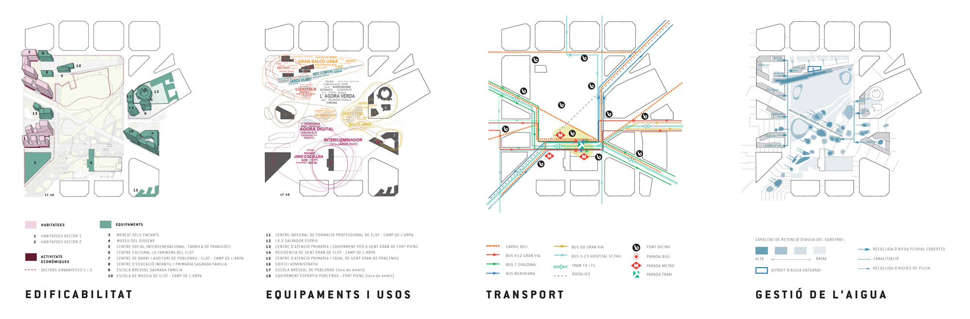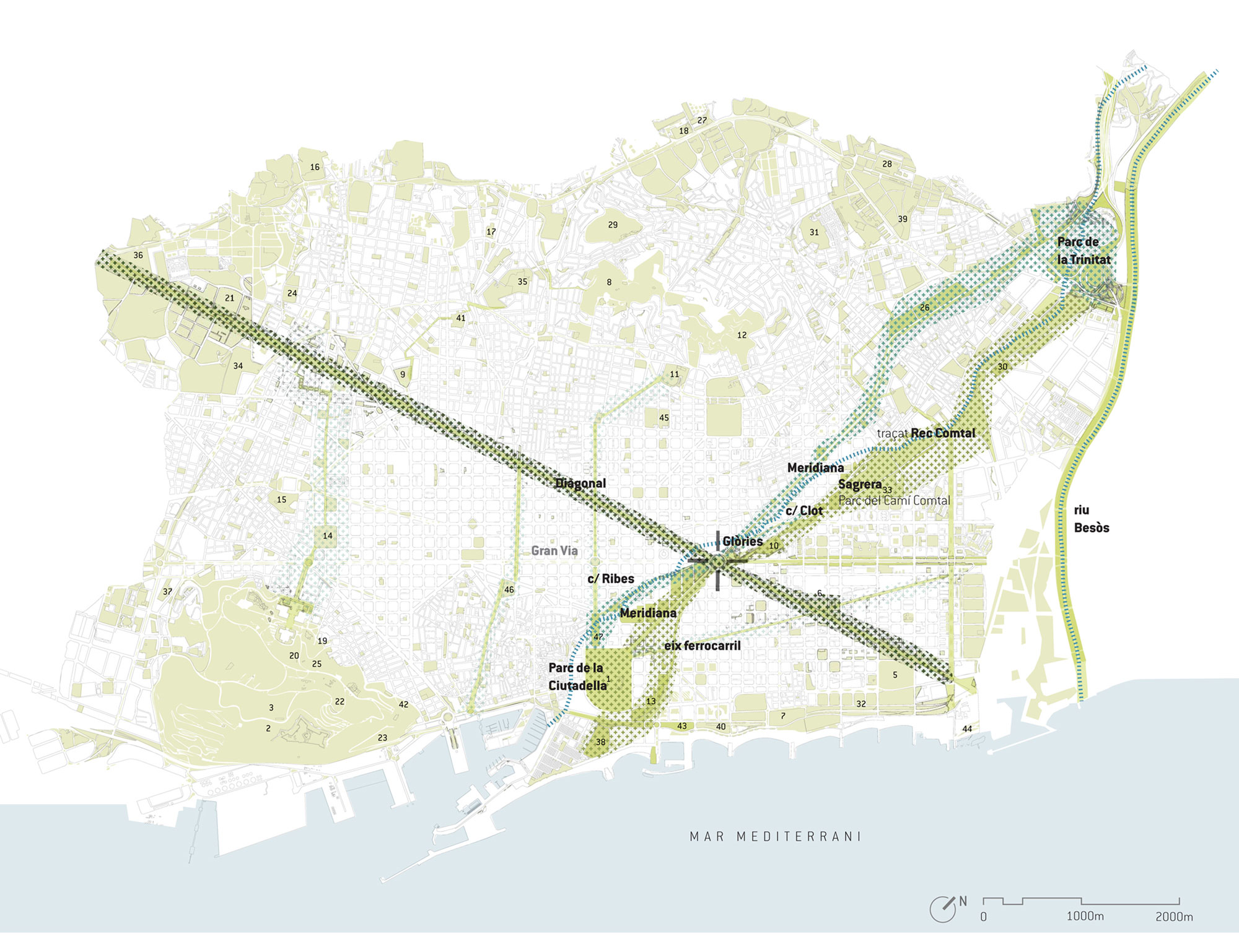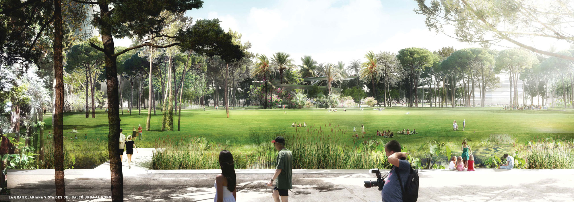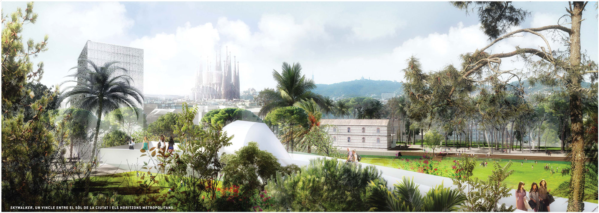 – Una canopia vegetal: que acompaña los ejes cívicos del este de la ciudad, generando la densidad vegetal, y constituyendo la continuidad ecológica entre Sagrera y Ciudadela. Esta cobertura vegetal se inscribe en el nivel de referencia de los tejados de la ciudad, y relaciona el nivel de la ciudad con el horizonte y los hitos metropolitanos (mar y montaña, Tibidabo, Sagrada Familia, etc.)