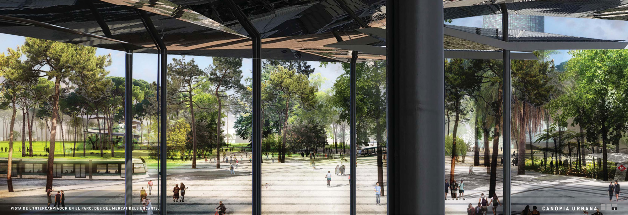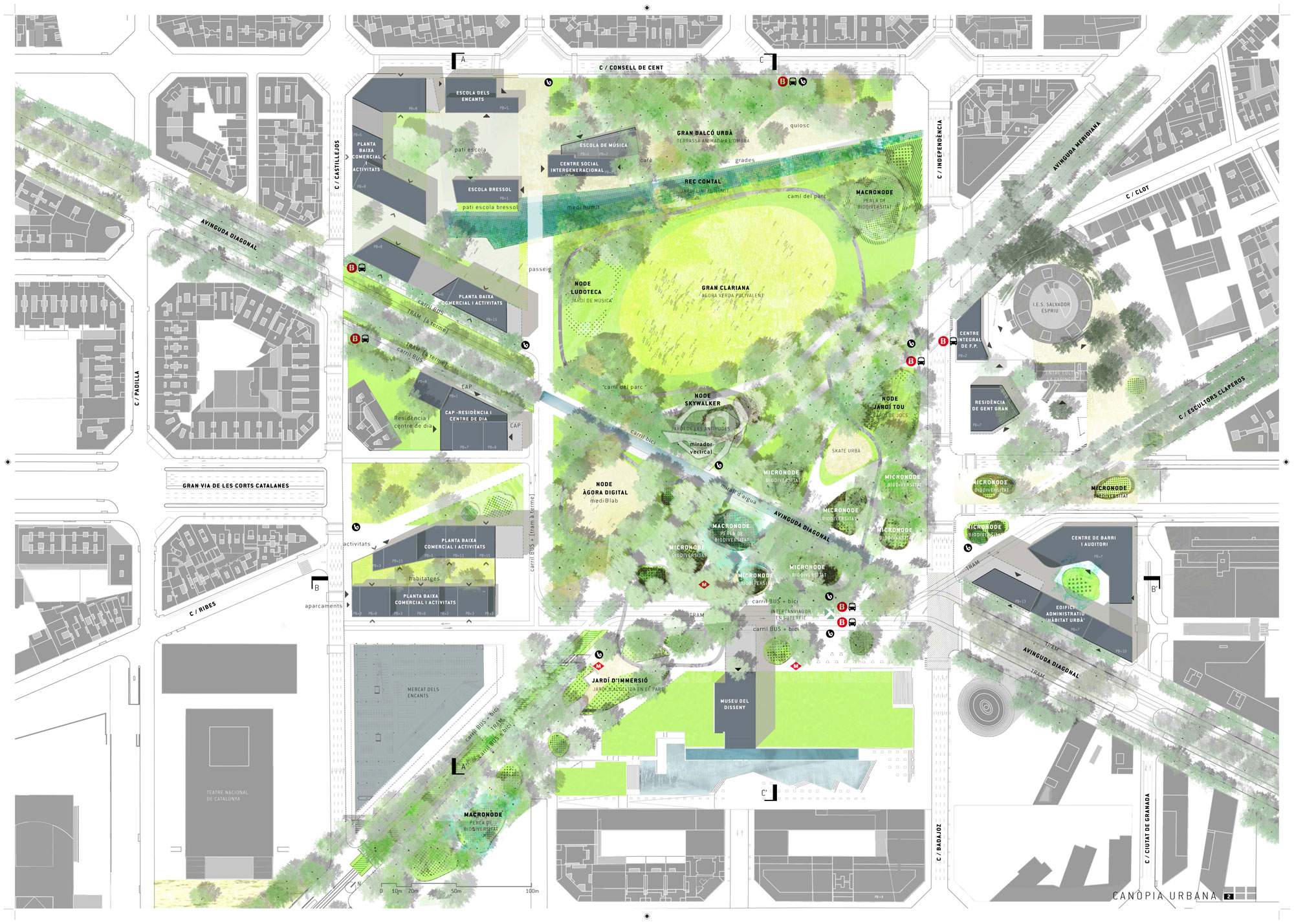 La centralidad física y geográfica de la Plaça de les Glòries no se había traducido hasta ahora en la centralidad urbana que había previsto Cerdà para esta zona de Barcelona. Situada en la intersección entre las tres principales avenidas de la ciudad, Glòries se encuentra hoy en la articulación entre el sistema urbano del ensanche Cerdà y el futuro eje verde que unirá los parques de Trinidad, Sagrera y Ciudadela. Glòries representa una oportunidad para la creación de un parque-plaza, que incluya nuevas dimensiones contemporáneas, como la biodiversidad y el confort climático, así como espacio para las prácticas recreativas cotidianas. El proyecto de ‘Canòpia Urbana’ prevé un espacio de aproximadamente 15 hectàreas para el uso cotidiano de los ciudadanos. Un espacio abierto a la ciudad, que reemplaza el tráfico vehicular privado por una movilidad más sostenible y ofrece a Barcelona un espacio urbano vegetal, extenso y confortable. Este nuevo espacio unitario y con carácter propio se construye a partir de tres estratos: