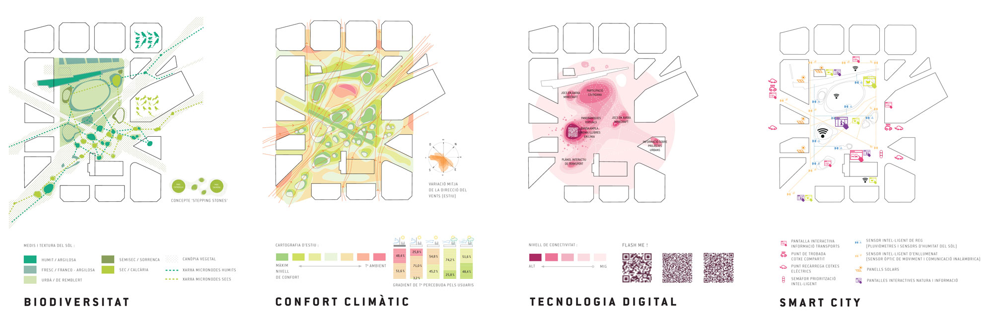 Los nodos constituyen el sistema de referencia del nuevo espacio. Los macronodos son espacios abiertos que pueden acoger múltiples actividades; mientras que los micronodos son pequeños espacios inaccesibles, y suponen un refugio indispensable para el desarrollo de la fauna y flora. La complejidad vertical de los nodos, constituidos por todos los estratos vegetales (herbáceo, arbustivo y arbóreo), permite la multiplicación de las condiciones (t°, humedad, luz, nutrientes..); y favorece el desarrollo de la biodiversidad. Partiendo de una huella limitada a nivel del suelo, los micronodos se densifican y adquieren mayor volumen conforme se aproximan al nivel de la canopia, hasta acabar fundiéndose con ésta. Desde el punto de vista de la sostenibilidad, los nodos contribuyen a una gestión hídrica eficiente. Se recupera el agua de lluvia del sitio y de las cubiertas de las nuevas edificaciones; y se plantea una vegetación de bajas necesidades hídricas y bien adaptada al clima (70% mediterránea, 30% exótica) La densidad vegetal de los nodos y el nuevo suelo fértil contribuyen a la regulación climática, aportando frescor y confort en verano. Se destina una gran superficie de césped practicable (2ha), para el consumo y disfrute de los ciudadanos.