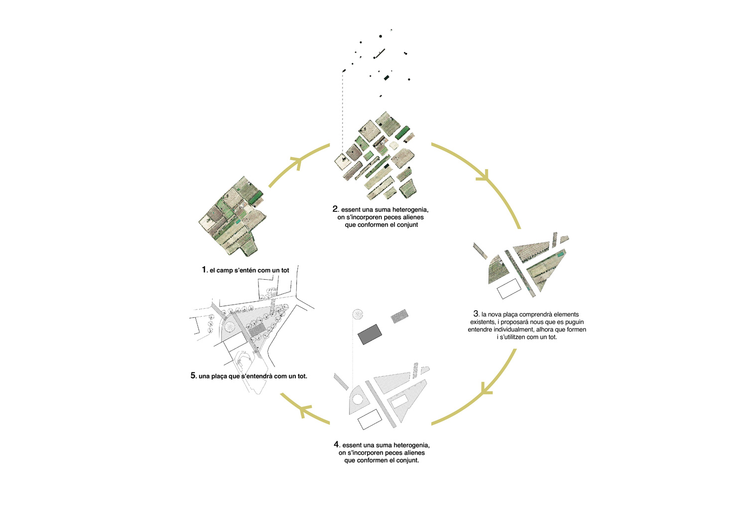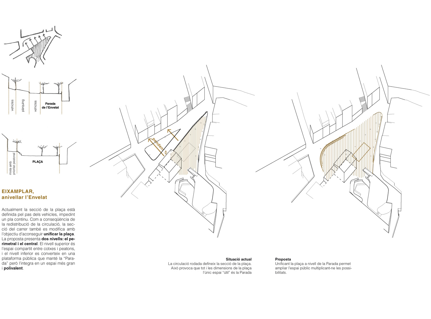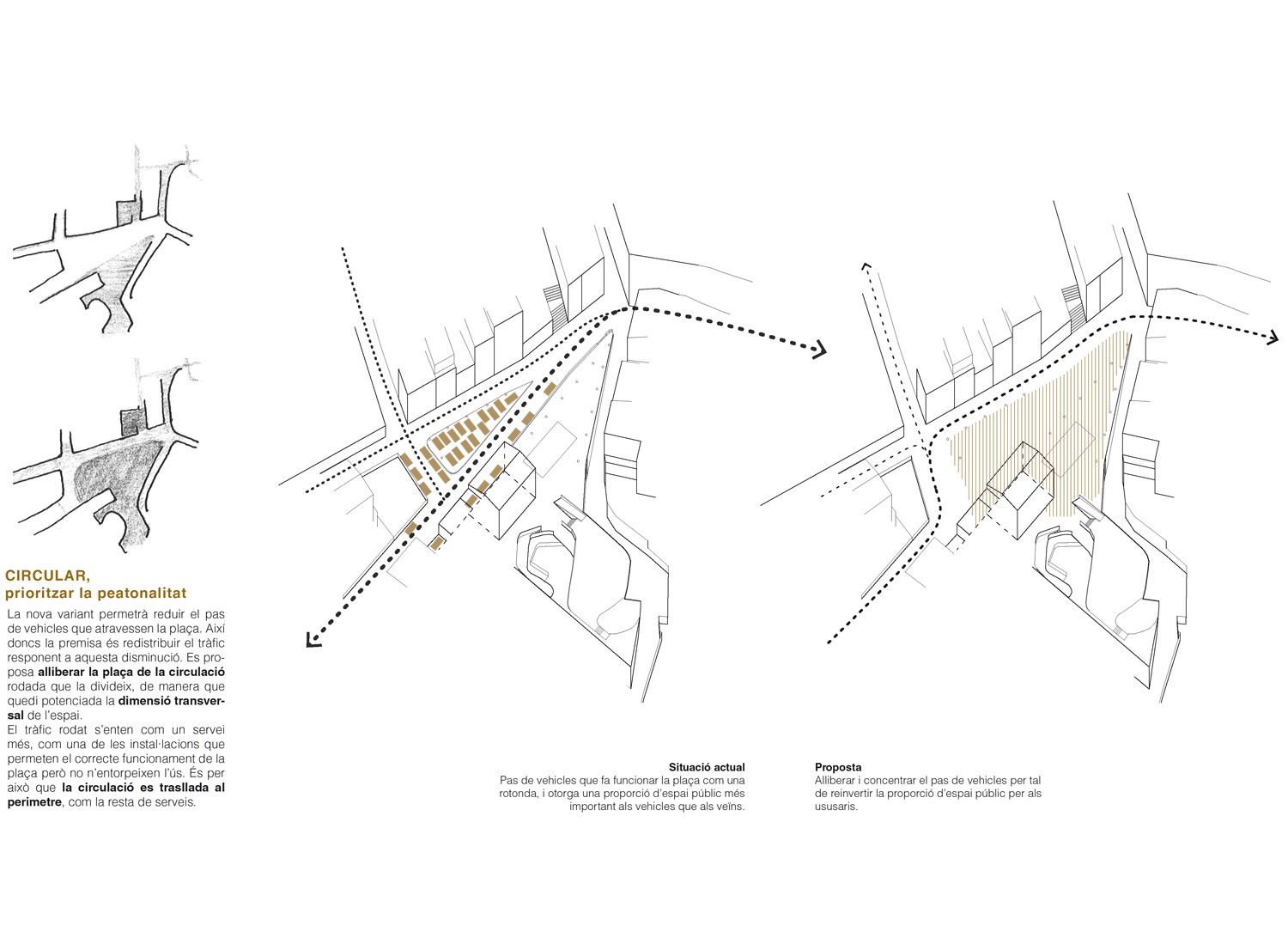 Es proposen una sèria d’estratègies que responen a intuïcions de les mancances i fortaleses de la plaça. Les premises principals són alliberar el màxim possible la plaça de vehicles, retornar l’espai als veïns; i no perdre els elements escencials que aporten confort i en configuren la seva identitat.