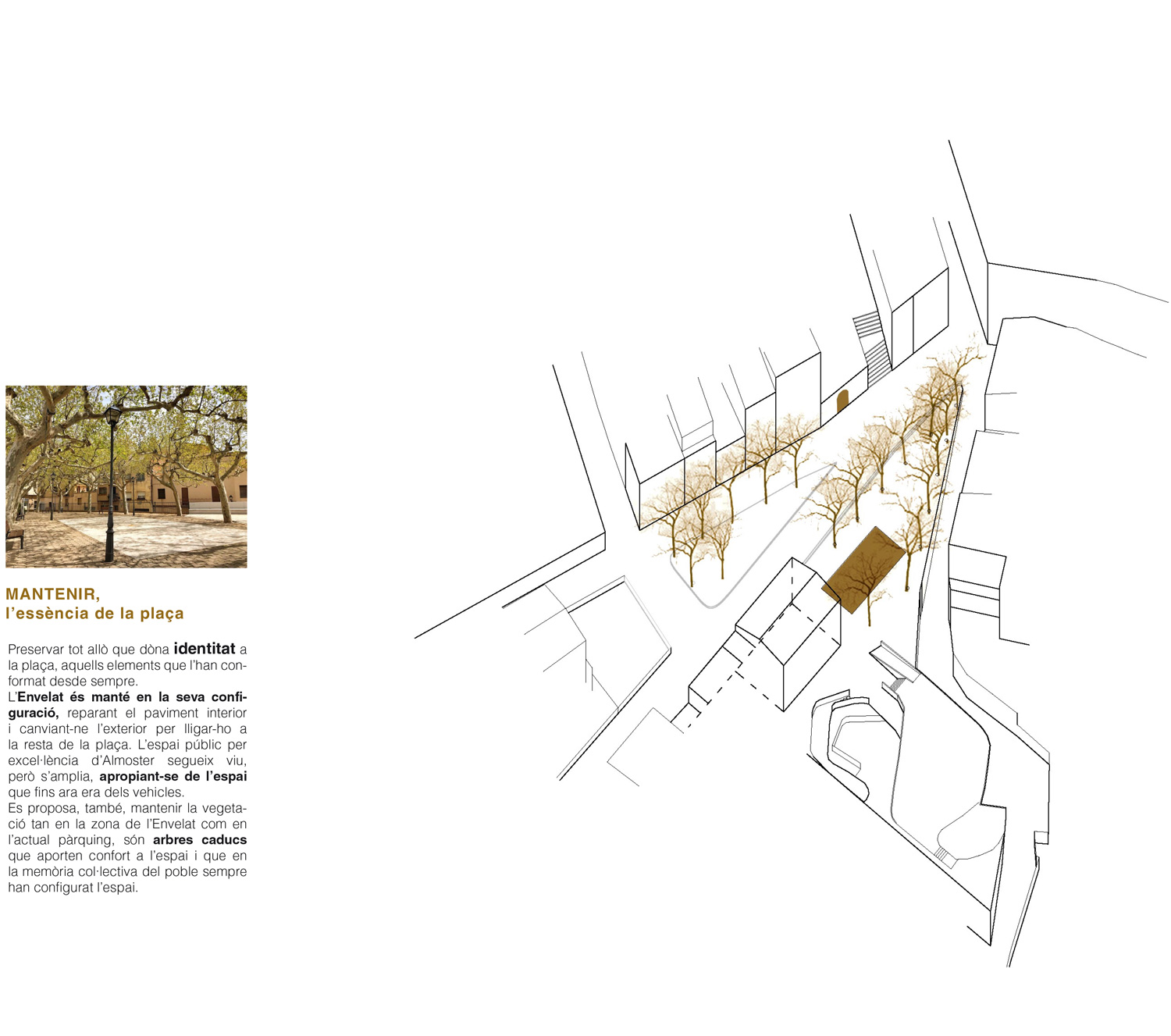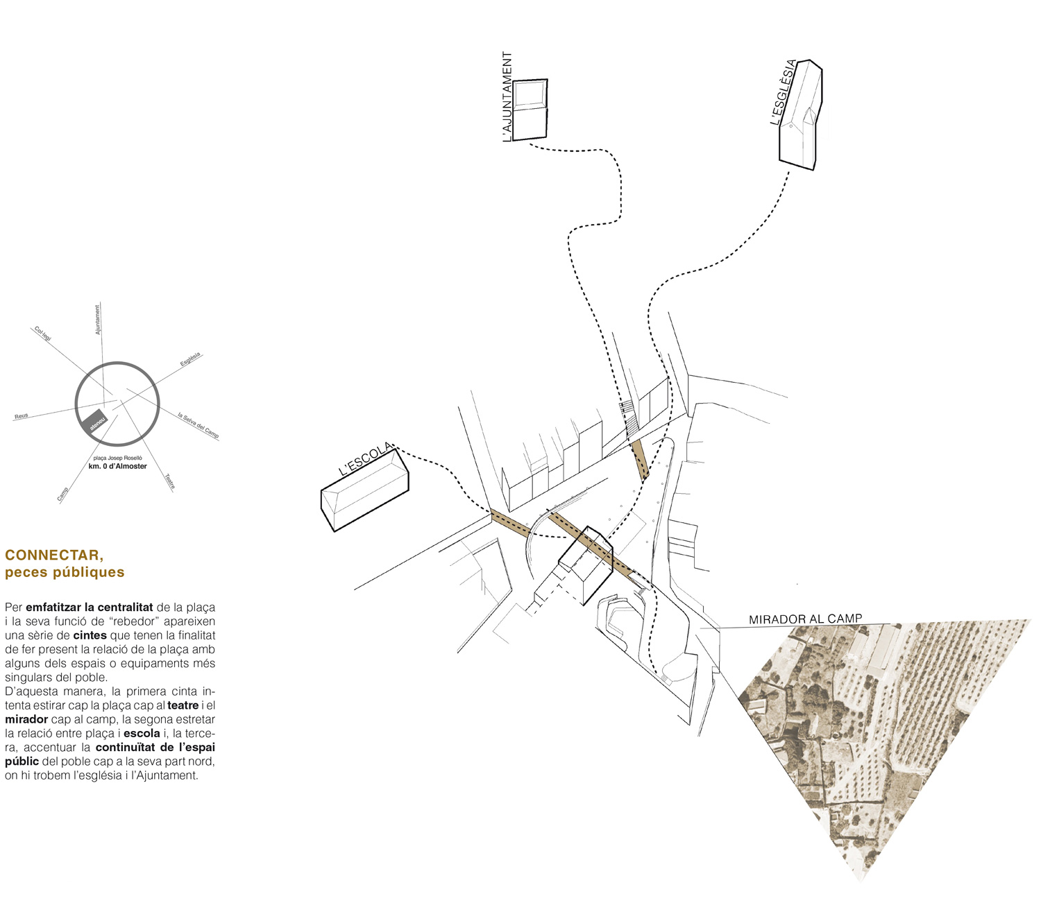 El projecte emmarca la remodelació de la plaça Josep Rosselló d’Almoster. La proposta entén la plaça Josep Rosselló com el VESTÍBUL del poble, el punt d’entrada i referència. L’espai públic per excelència d’Almoster. Actualment aquest paper de “plaça” està concentrat en l’espai de la parada i la resta funciona com a lloc de pas i d’estacionament de vehicles. L’aparició de la futura variant que connectarà per les afores del poble amb la Selva del Camp provocarà una notable reducció dels vehicles en aquest punt. Això, permet retornar aquest espai als veïns en forma d’espai públic de qualitat.