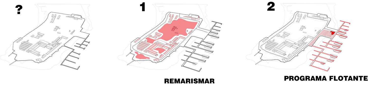 Para situar los barcos necesarios para satisfacer las necesidades programáticas planteadas es necesario alargar los pantalanes flotantes hacia las zonas de mayor calado, así en lugar de construir un nuevo puerto deportivo se amplía el perímetro de los pantalanes existentes en un 189,2% y un 41,6% permitiendo el amarre de un considerable número de barcos mayor al existente.