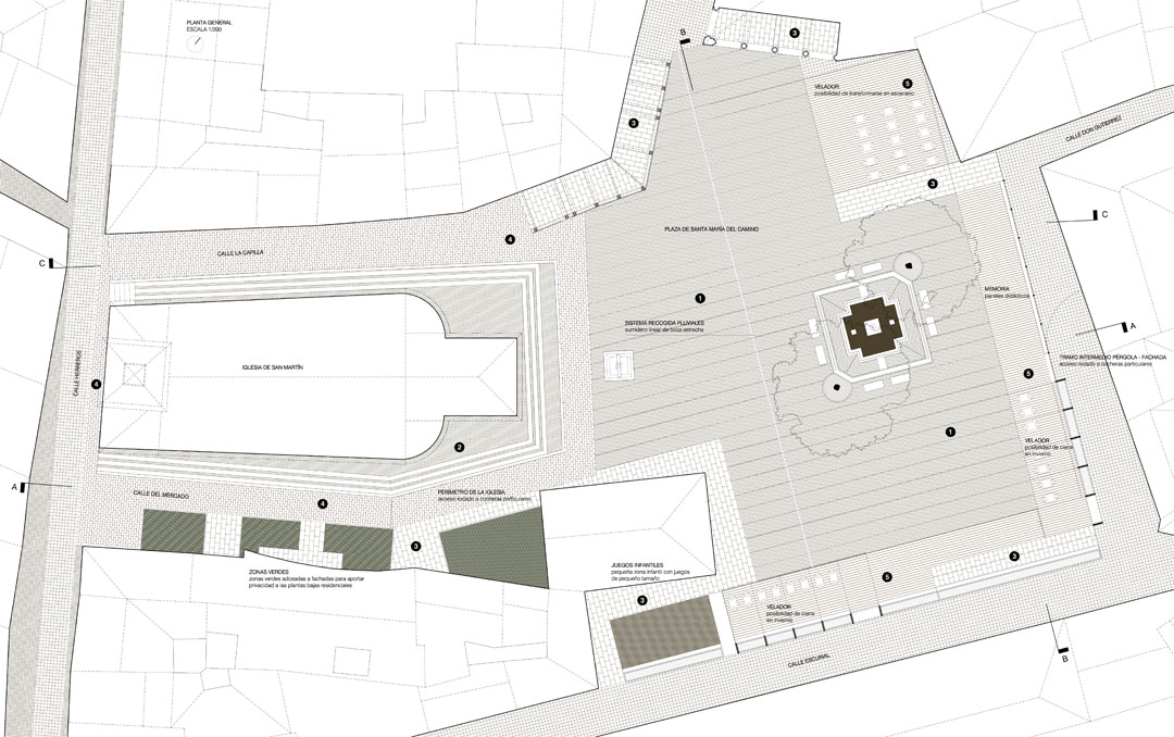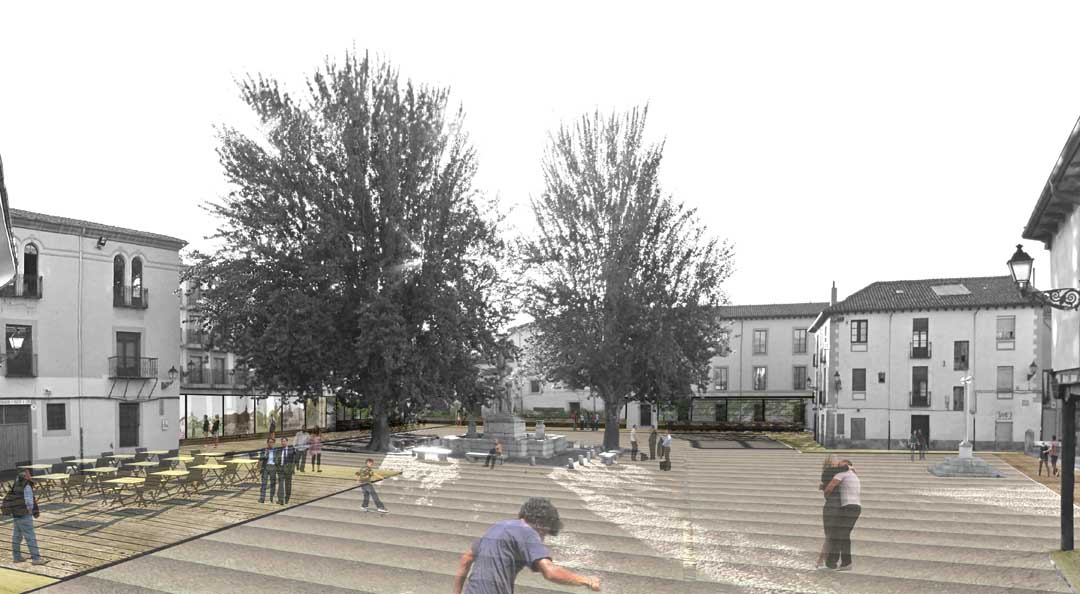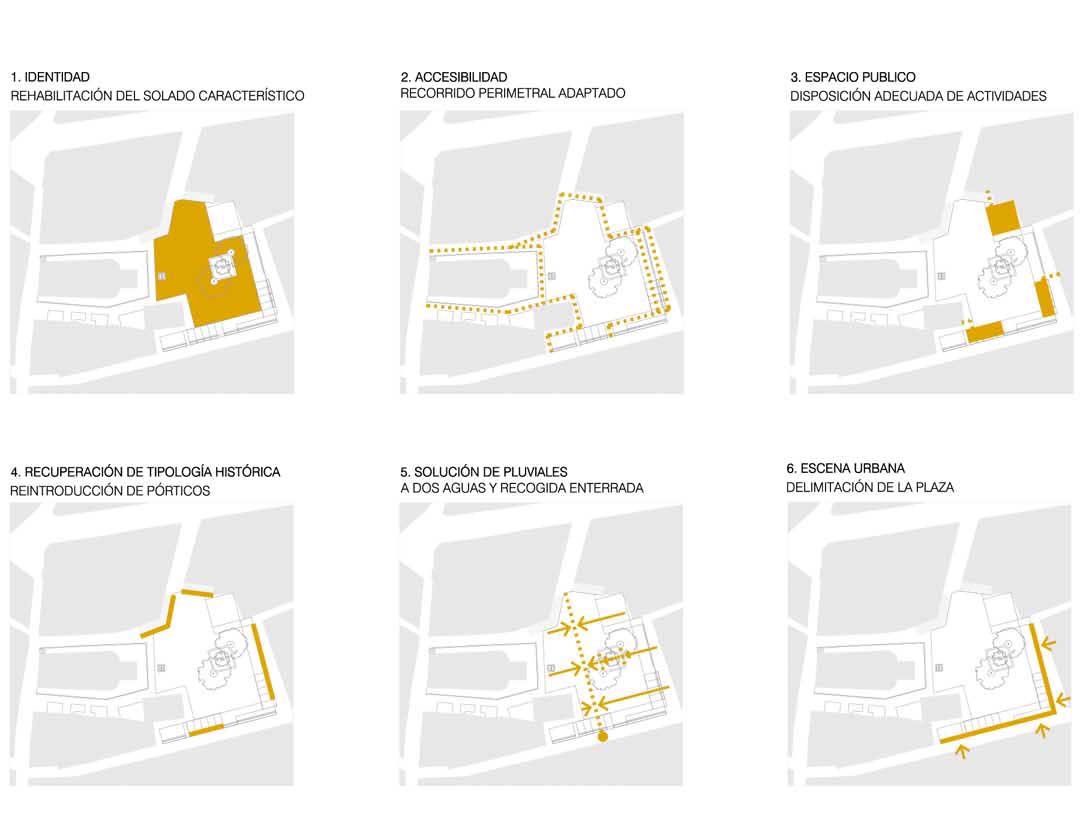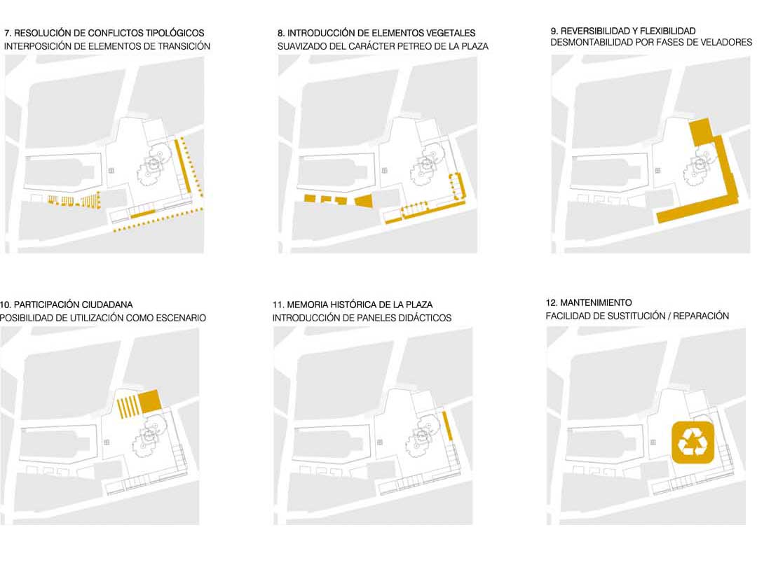 Two key concepts: Value the characteristic elements of the square in terms of heritage, specially the rolling stone pavement and the arcades through both reinterpretation and recovery of the original typology. And, the spatial delimitation of the square, currently deluded in scale and typology conflicts in its north-east sector. We establish twelve strategies of action: