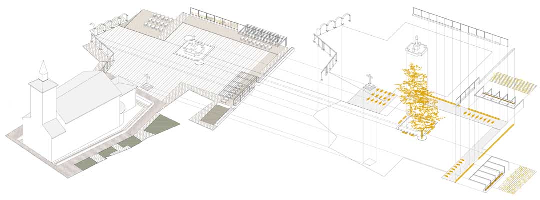 – Recovery of historic typologies : Recovery of existing arcades, adding modern arcades in the north and east parts of the square to enclose it. The aim is to recover the original character of the square by not affecting the existing buildings.