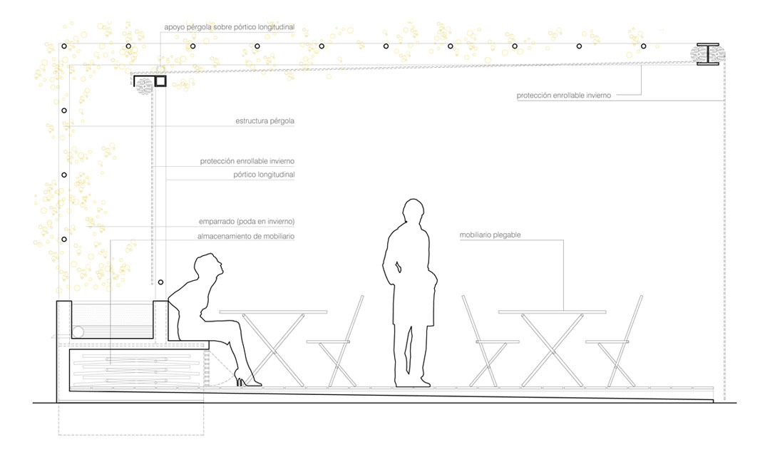 – Public space : We propose a set of terraces that can be used by the nearby restaurants and cafés. The furniture can be stored within the proposed elements, so they can be used independently.