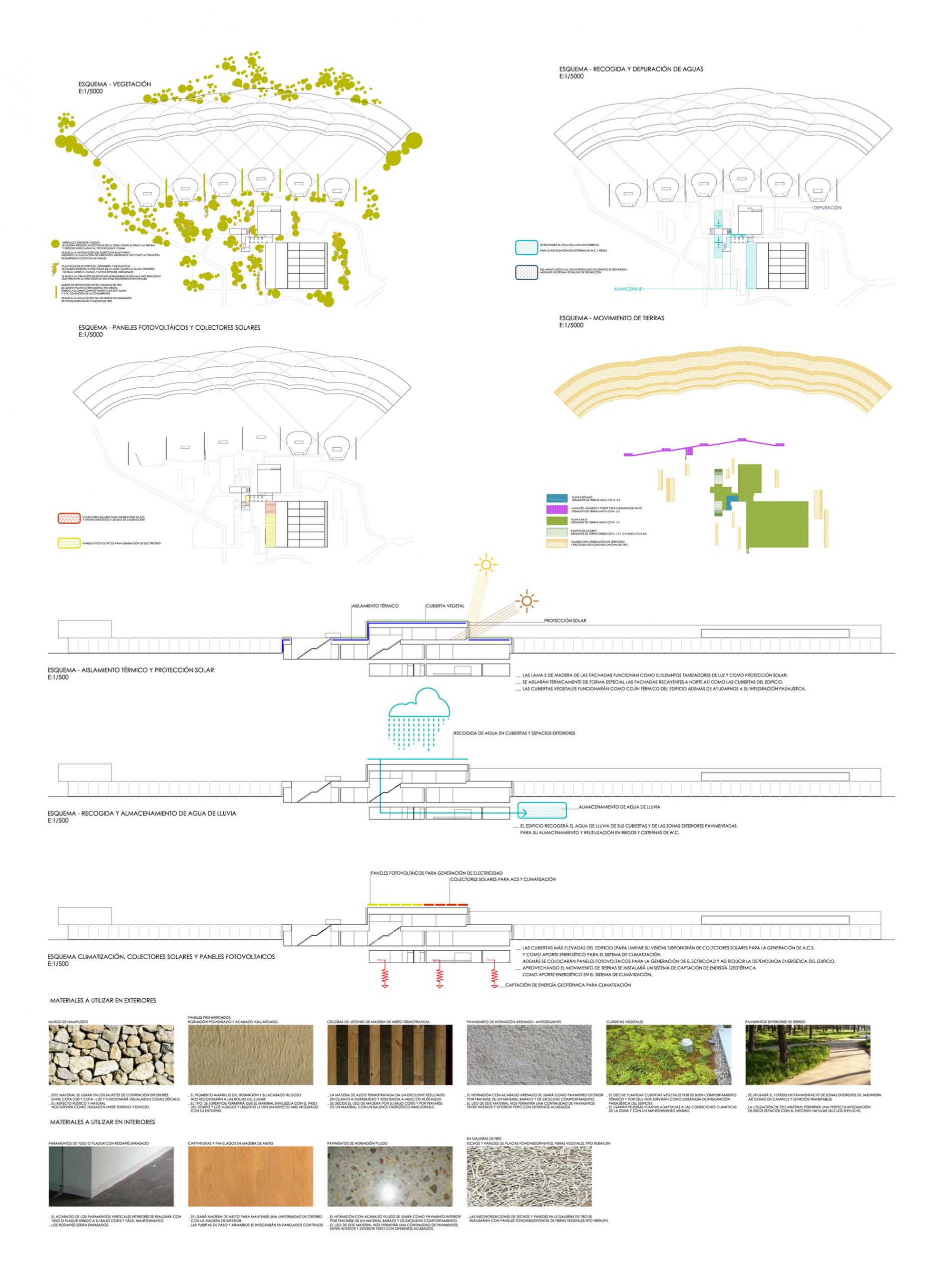 También se toma la decisión de rehundir el edificio en el terreno de forma que se reduzca su altura total y se cree la sensación de construcción anclada al suelo formando parte de él. De este modo también se reduce el impacto visual que el edificio tendrá en el entorno. Por último se hace una particular y esmerada elección de los materiales a utilizar tanto en el exterior del edificio como en el interior. Con la elección de los materiales se pretende un triple objetivo: Por un lado seguir contribuyendo a la integración y reducción del impacto visual del edificio. Por otro lado se pretende que los materiales sean de bajo costo y mantenimiento. Y por último que presenten un equilibrio ecológico entre gasto energético para su fabricación, mantenimiento y durabilidad lo más adecuado posible.