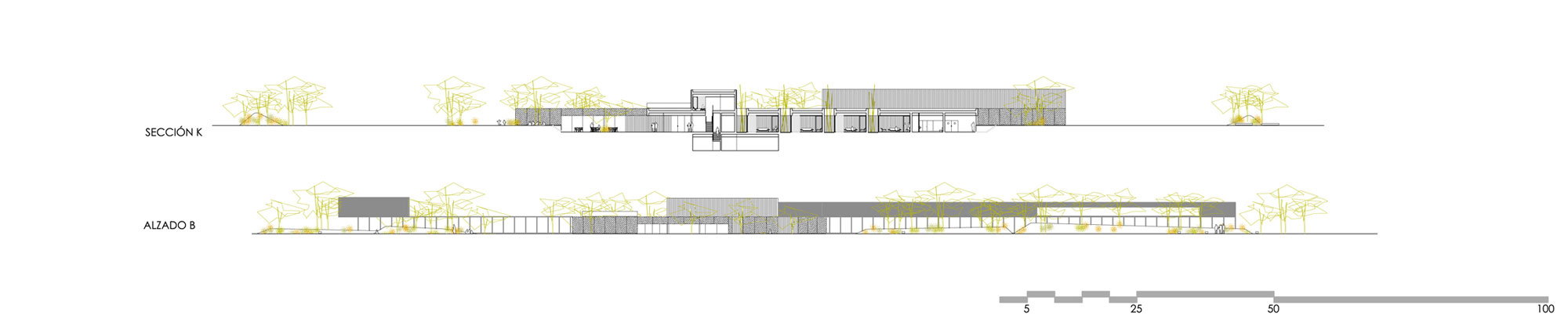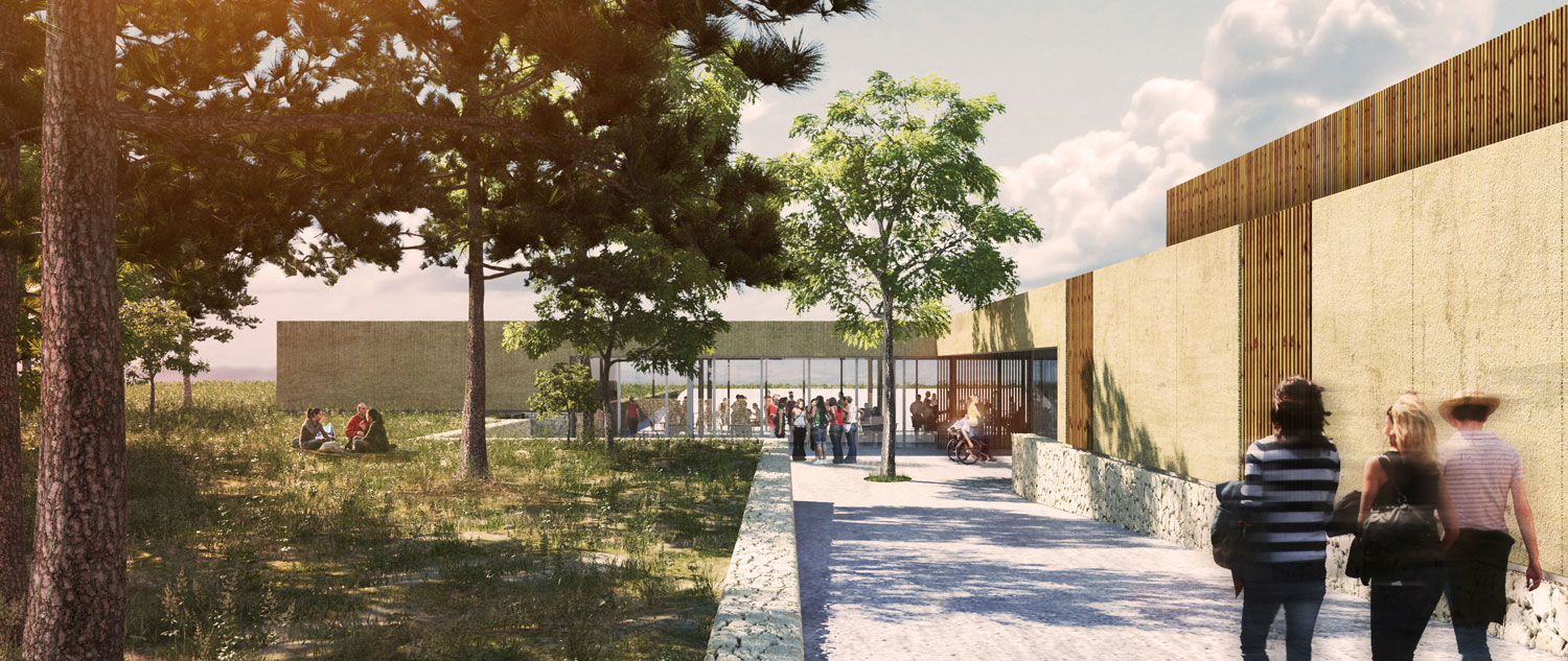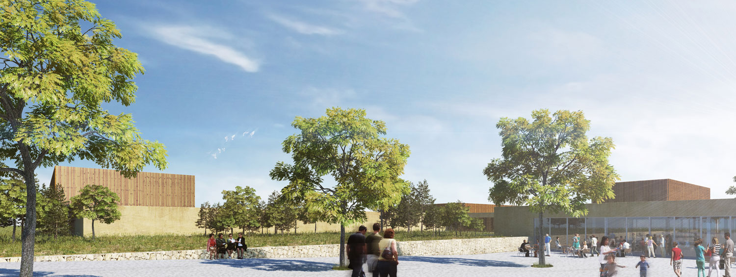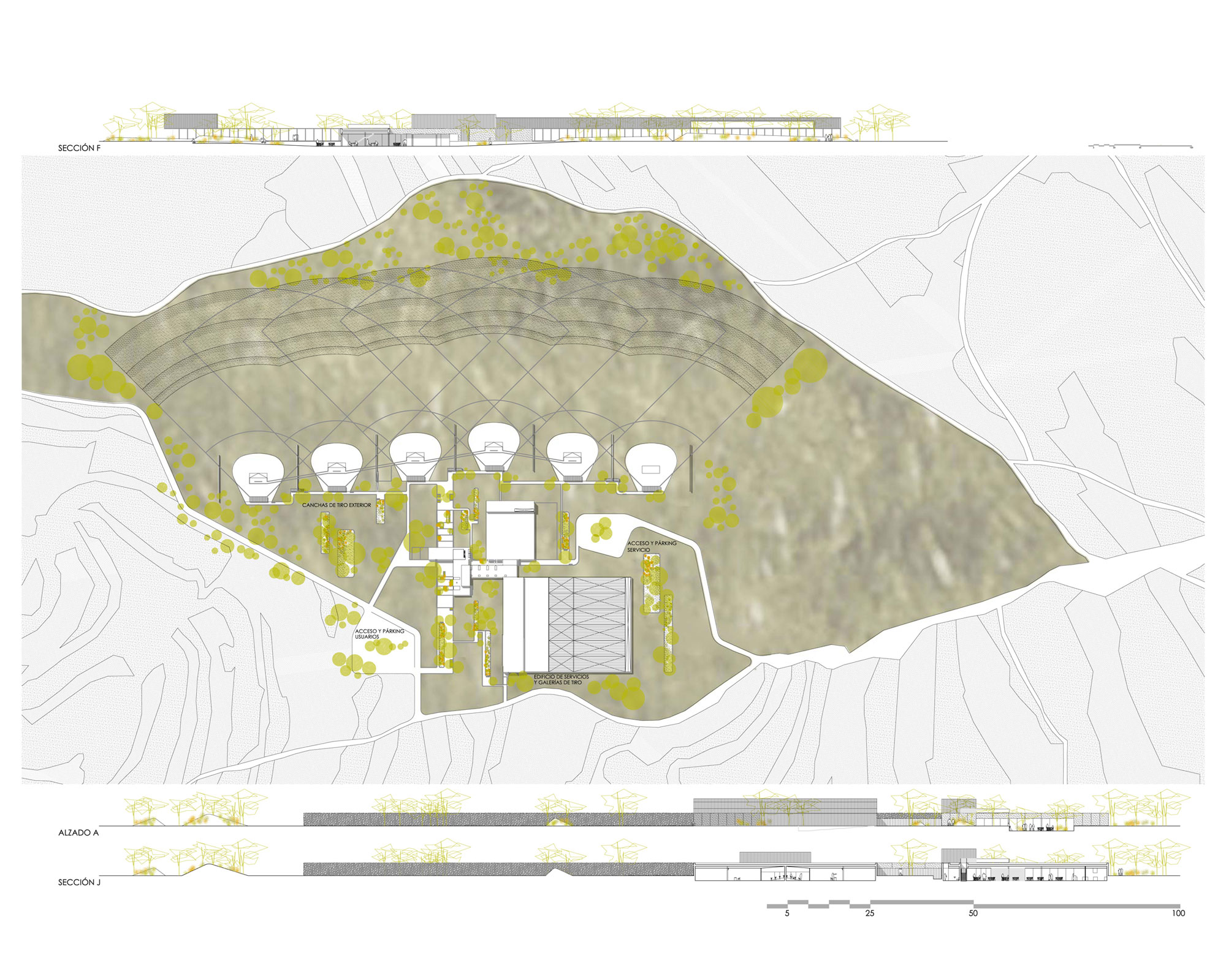 Esto se intenta conseguir mediante tres importantes decisiones encaminadas a facilitar la integración del edificio en la zona de campos de cultivo y monte bajo en la que se instalará. La primera de ellas es el esponjamiento del edificio. De esta manera permitimos que el bosque existente y los nuevos árboles a plantar aparezcan en los espacios e intersticios que se crean entre los diferentes volúmenes del edificio como resultado de hacer el edificio lo menos denso posible. Los árboles que aparecerán entre los diferentes volúmenes que conformarán el edificio contribuirán a la integración de este en el paisaje al funcionar como elementos que desdibujen su rotunda imagen.
