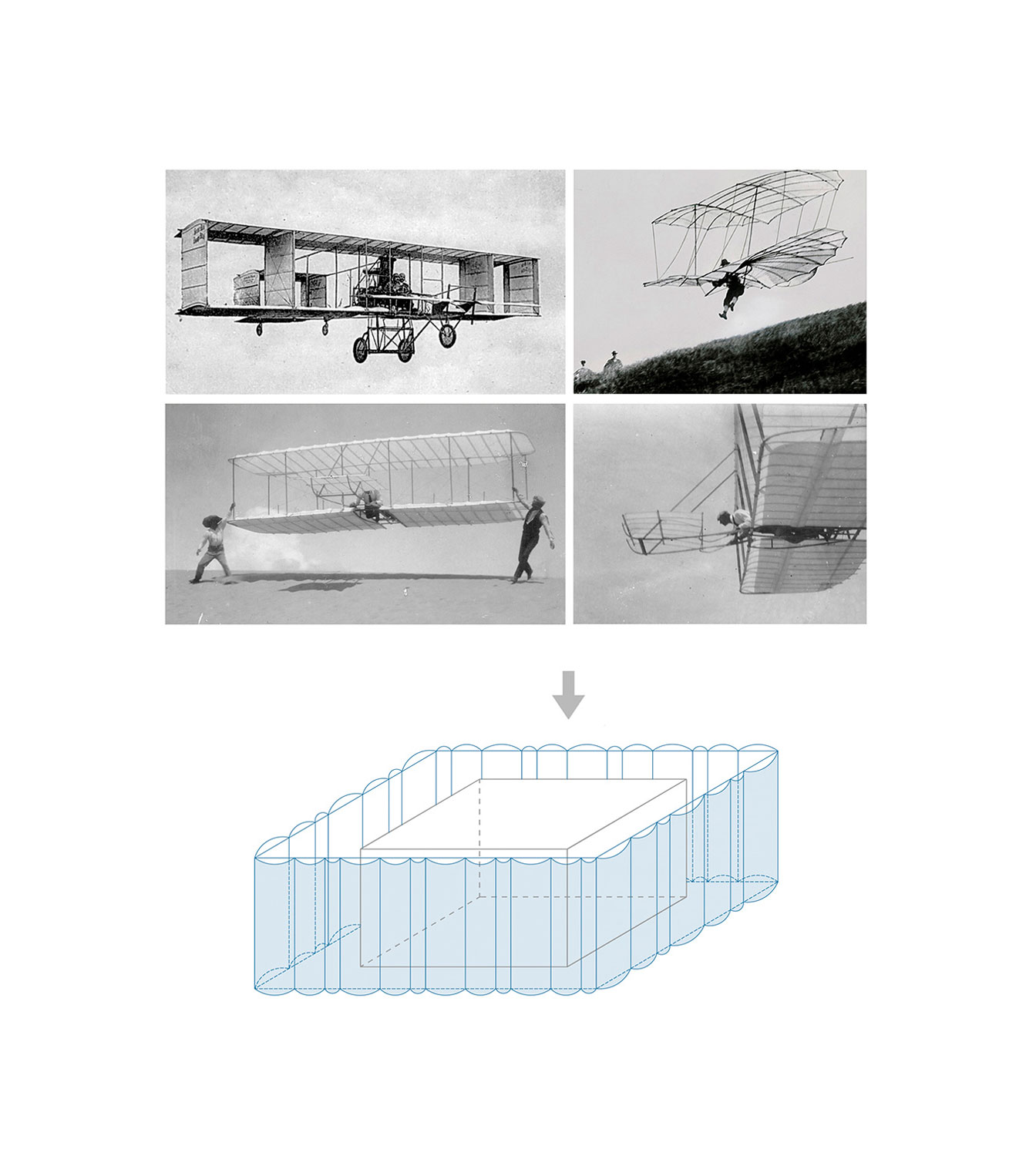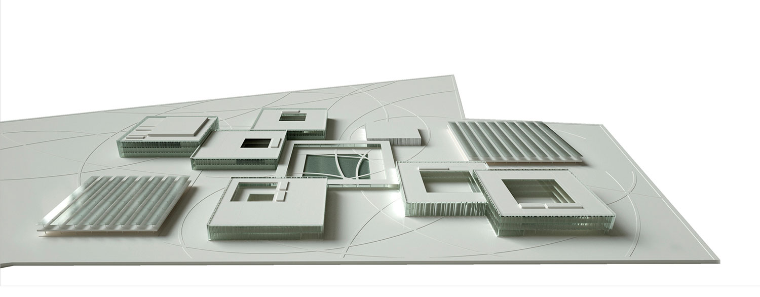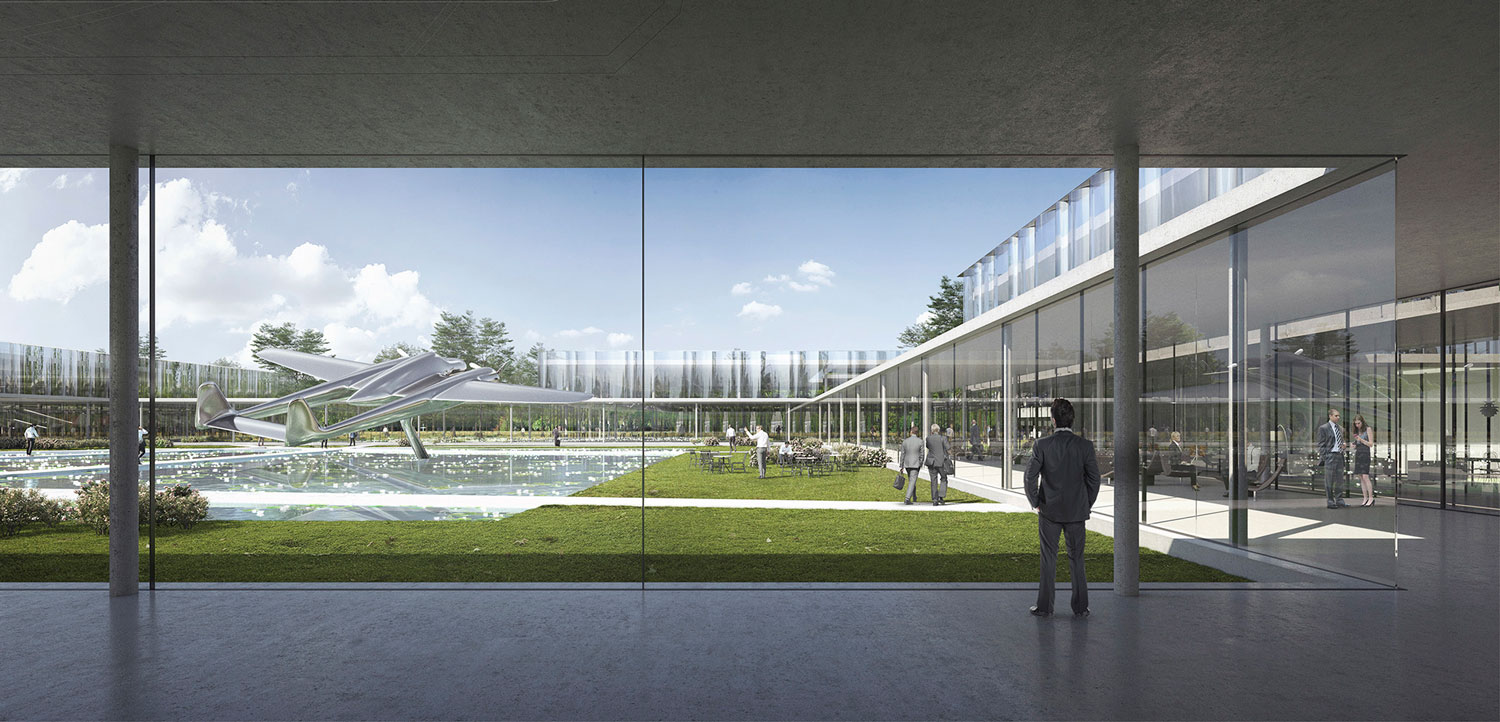 Without clear traces or urban alignments, the project had to be installed in the first phase and to expand in a second one. And this system of grouping, without references responded according to that environment. The campus distributes office buildings, warehouses and rest areas (cafeteria, sports etc…) around a central element as a cloister. A common gallery space surrounding a green area for recreation and resting. Although the rooms of controllers and computer equipment had to be under very strict conditions of isolation and without natural light, the campus material should express the idea of being in an open and transparent environment. That is why the circulations of these programs are placed along the perimeter, leaving these «black boxes» in the interior. The envelopes are therefore designed by curved glass and padding in historical reference to the configurations of the first curved aircraft wings.