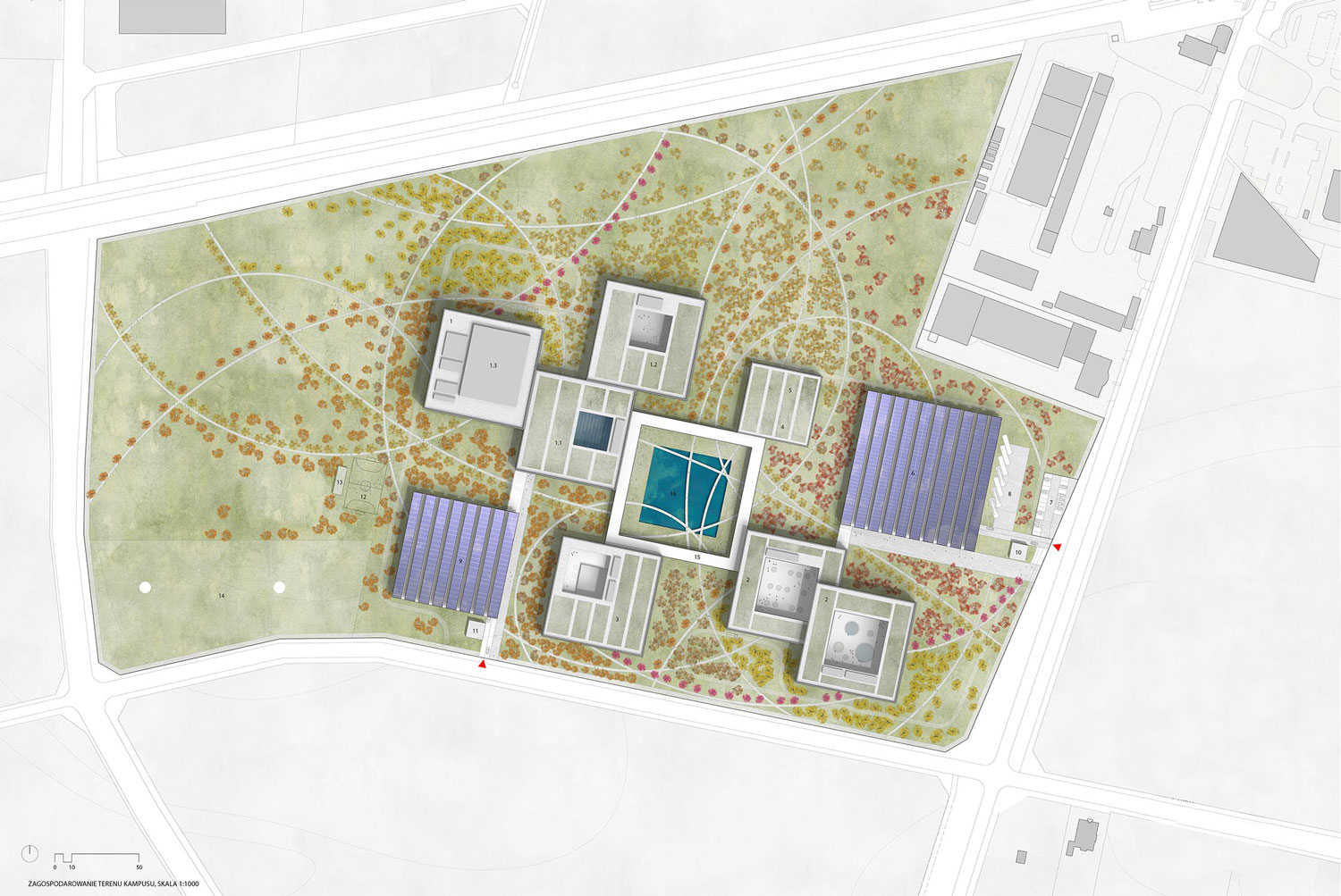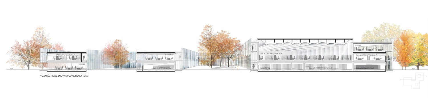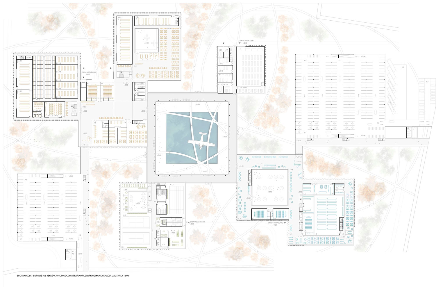 The headquarters of the Air Traffic Control of Poland is responsible for controlling the country’s air traffic, setting the control guidelines for Polish airports. The project, therefore, required an in-depth functional analysis due to the particular work conditions demanded by the organisation. Air traffic controllers must develop their work in a specific space, in conditions of absolute concentration and with high levels of control access. Programmatically, we had to take on the challenge of designing a campus that would combine office spaces, leisure and entertainment, parking and warehouses, each with different levels of security and access control. A clear and categorical answer in terms of distributions and program location turns specially crucial. The situation on the outskirts of Warsaw, in a formless plot and without an urban consolidation around, drove us to develop a project situated on the territory in a «chaotic» way.