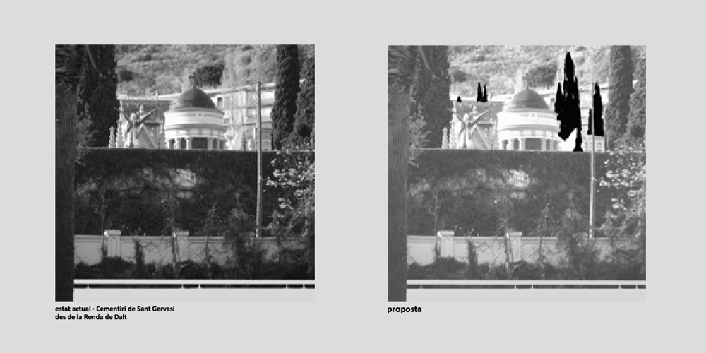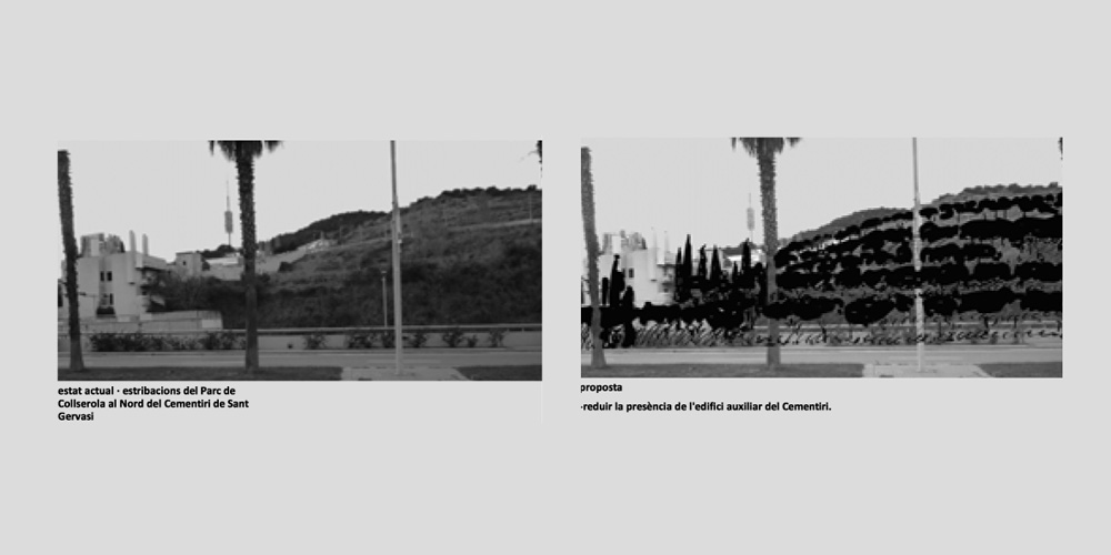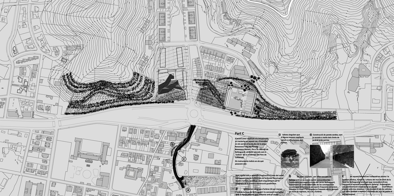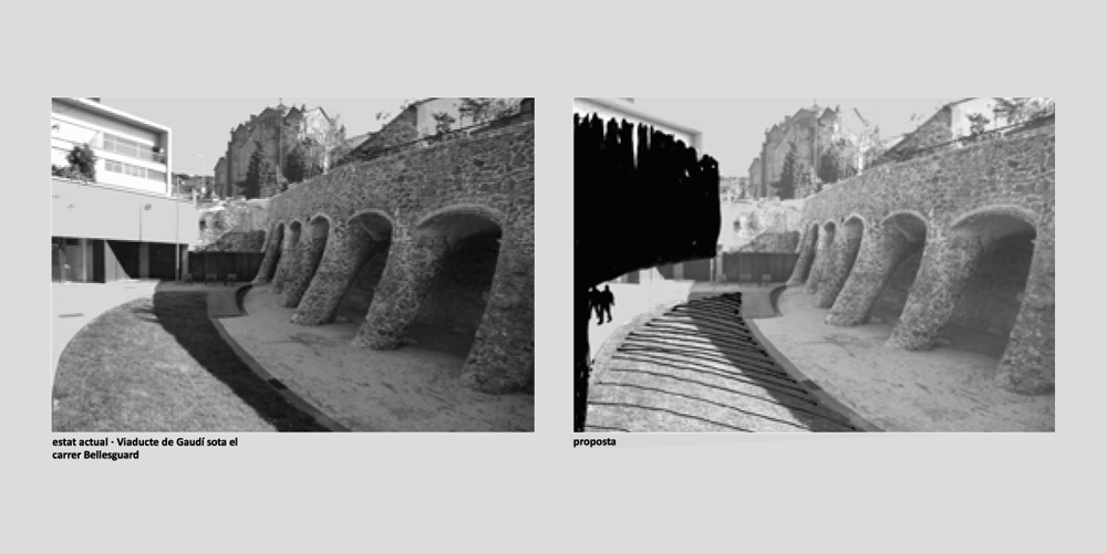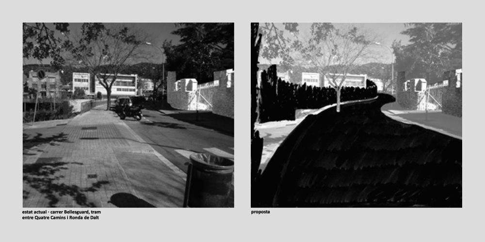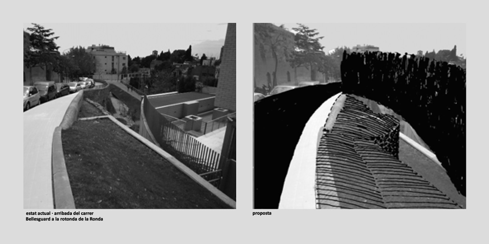 Tanto desde el punto de vista de la información recogida a las sesiones informativas de los Servicios Técnicos Municipales o de asociaciones vecinales, como de nuestro propio análisis de la situación actual de la Porta de Bellesguard, nos parece que, a falta de una programa o de unos objetivos a cumplir, mucho más que facilitar y dotar de servicios el acceso a la carretera de les Aigües, se trataba de extender las caracteristicas naturales del Parc de Collserola hasta la franja de la ciudad que está en contacto con él, al Norte de la Ronda de Dalt, y continuadamente con el mismo criterio, aplicar atributos naturales propio del Parque, con el tratamiento de las calles de acceso al otro lado de la Ronda de Dalt. Hemos dividido el proyecto en dos partes, la situada al Norte de la Ronda, y la situada al Sur en contacto con Barcelona. La conexión peatonal entre las dos partes, si bien por coste y por necesidades se descarga el uso de pasos peatonales elevados, parece que ha de ser por la por la rotonda de Bellesguard, que conecta al mismo nivel las dos partes.
