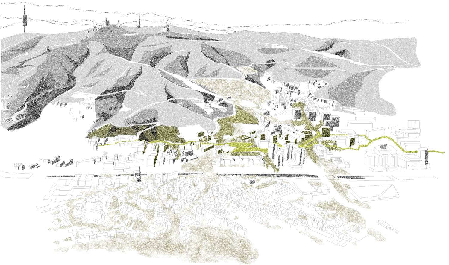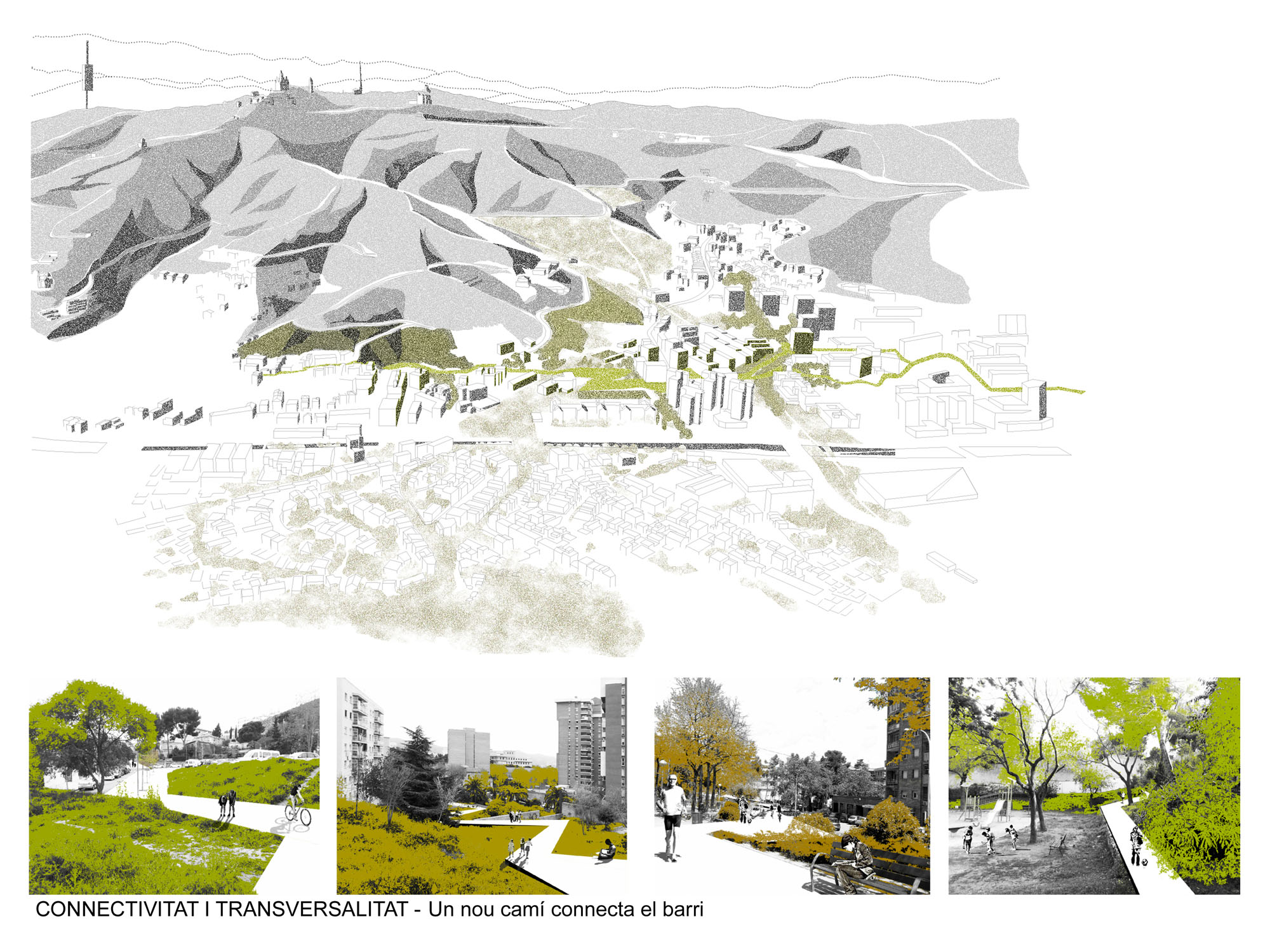 Cal reconèixer l’estructura física del barri per a potenciar-ne la seva connectivitat. Donada la seva ubicació al voltant de torrents, sempre ha estat difícil la relació transversal, paral·lela al passeig de la Vall d’Hebró. El tancament del recinte hospitalari l’ha fet encara més difícil. Proposem obrir camins per a vianants que supleixin aquesta manca, fent més amigable la relació entre barris. Els camins que posen en relació la ciutat amb el parc han de ser escassos per a no fomentar l’accés a aquest. El futur tram del Camí de les Aigües haurà de recollir aquests camins completant els circuits per a vianants. Només es proposen dos accessos al parc; un a través de la nova passera i connectant amb el camí de la font del bacallà, i l’altre sobre la font del roure, obrin un petit túnel sota la rebassada a l’altura de la font de la tenebrosa. La premissa per a tota l’actuació consisteix en dotar de permeabilitat el sòl i el subsòl del territori. L’aigua és bàsica per al desenvolupament de la vida, i en aquesta actuació ha de trobar el seu lloc, l`hem de mantenir, guardar i posar-la a disposició del verd. No ens podem permetre fer-la fora, i evacuar-la lluny del nostre abast. Per això disposarem de diferents tècniques de recuperació de l’aigua, tant superficial (cunetes, canals, basses,..) com en profunditat (cunetes drenants, paviments permeables, parterres filtrants,..)
