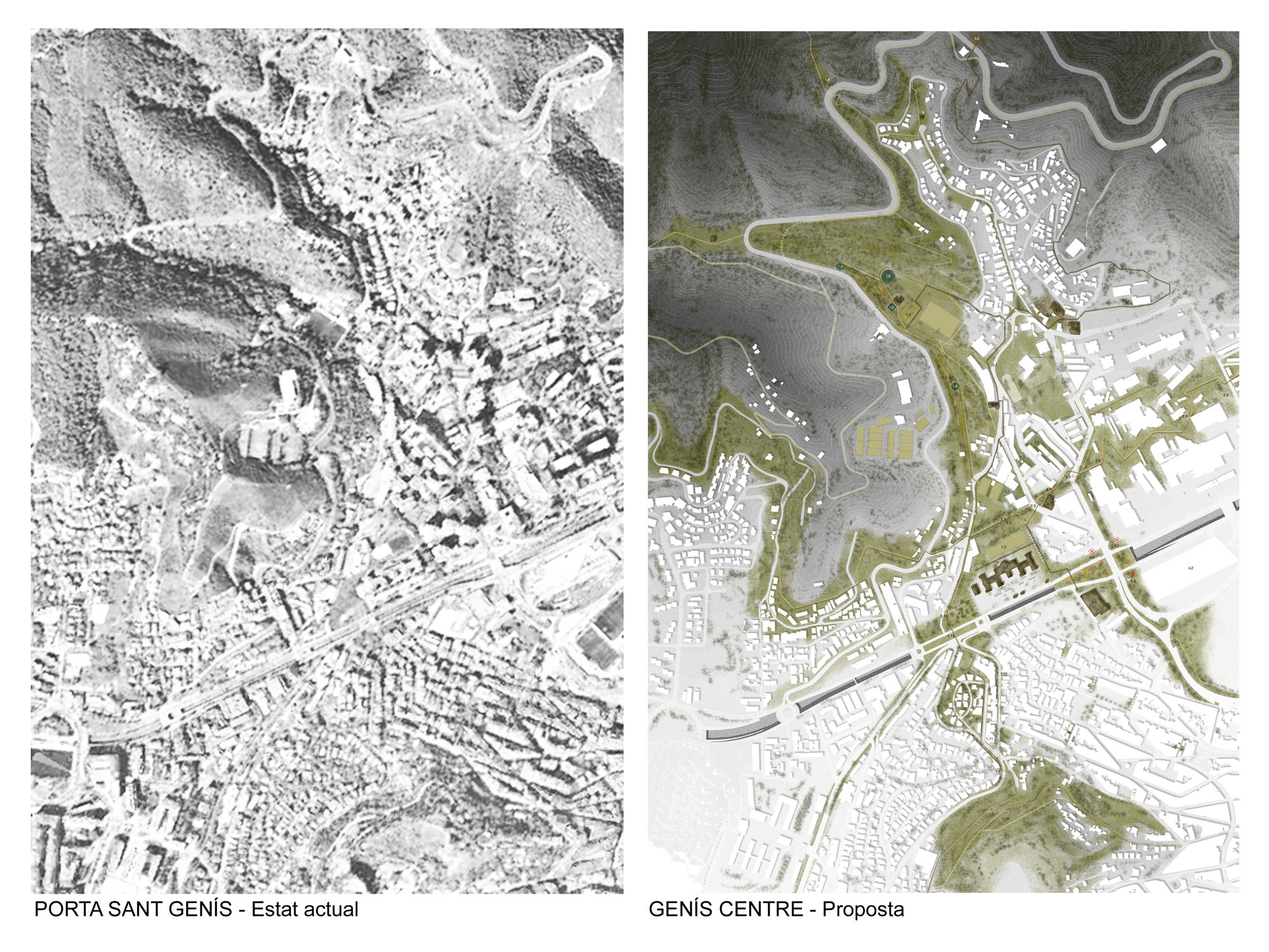 El Parc de Collserola entra a la ciutat per la porta de Sant Genís, i ho fa amb la frescor, la humitat i els dolls d’aigua. L’aigua i el sòl produeixen l’horta, fan florir els colors i créixer l’ombra dels arbres. Cal potenciar tant els camins d’aigua a la vista; basses, canals i sèquies de reg per hortes i jardins interiors; com els que no es veuen; l’aigua ecològica: aigua subterrània que omple el subsòl i permet vegetació frondosa. Hem de preveure camins permeables i camins aquàtics plantats amb espècies higròfites: joncs, iris, litriums, bogues, alocs, ranuncles. En els recorreguts d’aigua i verd el freixe (Fraxinus angustifolia) serà el referent, l’indicador del camí, tot acompanyat d’oms (Ulmus resista), trobarà els lledoners (Celtis australis) i deixarà algun roure (Quercus pubescens) de la muntanya. El continuum naturale de la serralada de Collserola compta amb la vegetació autòctona que entra a la ciutat, i que s’utilitza a les zones verdes. El freixe (Fraxinus angustiolia) , serà l’espècie referent per a l’actuació, tot i que no l’única espècie: Roures, lledoners, oms, castanyers, avellaners, … es proposen per acompanyar, incloent les seves diferents tipologies: un sòl peu (perímetres 20-25), diferents peus o arbustius.