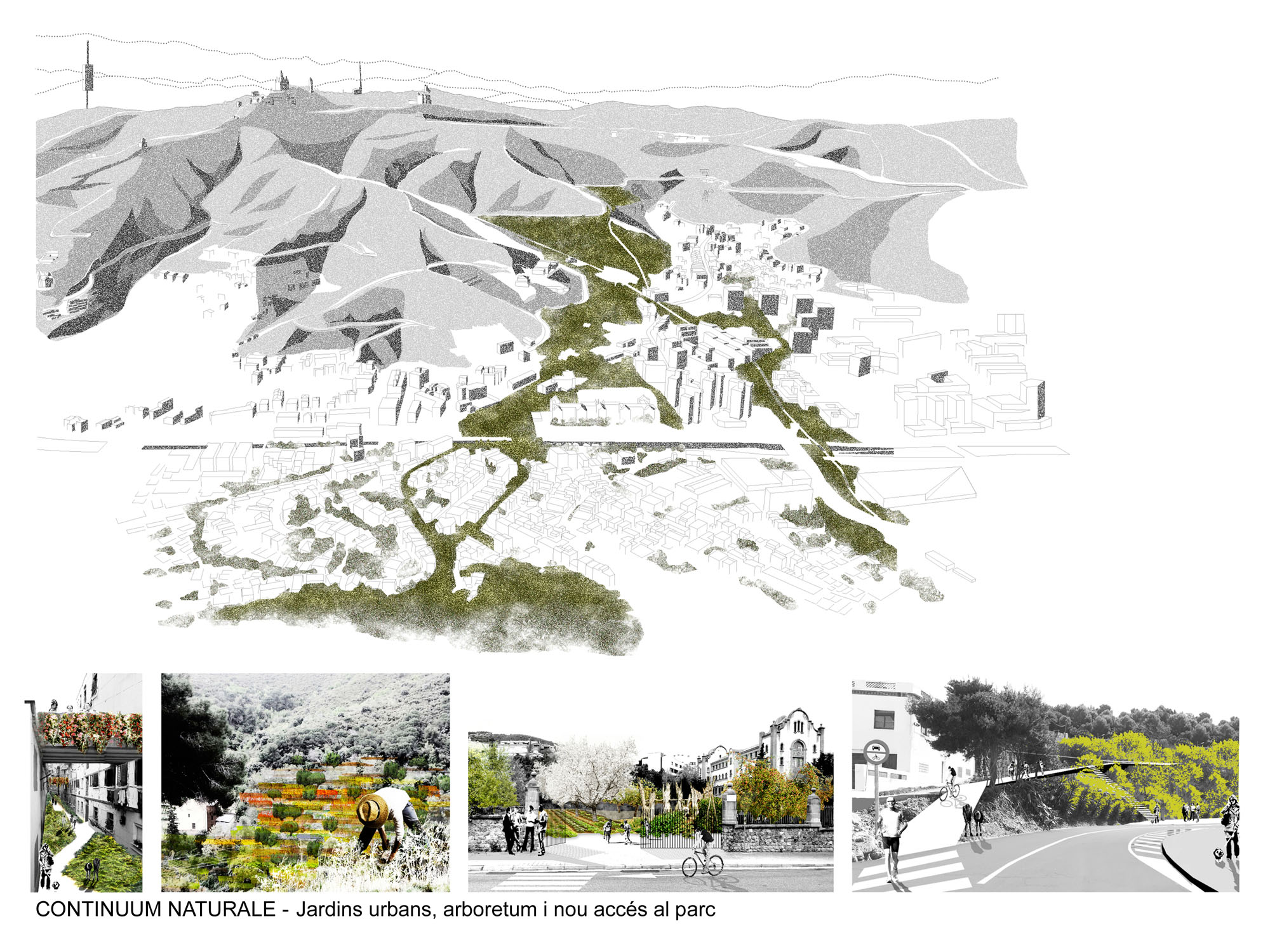 L’ordenació dels horts, tant necessària, tindrà com a base reguladora el sistema de reg, canals, comportes i sèquies. Igualment, els patis interiors d’edificis i dels masos antics i emblemàtics poden ser distribuïts i ordenats pel funcionament dels sistemes de reg per gravetat. La conjunció natural i antròpica es resol amb una zona d’estada convertida en arboretum al costat del Patronat Ribas. No és una col·lecció d’espècies exòtiques, proposem una col.lecció d’espècies hortícoles i fructícoles de varietats antigues, en perill d’extinció, un arboretum que recuperi la memòria històrica agrícola de la zona, un equipament científic que ajudi a recuperar olors, gustos i colors de fruites i verdures, un espai on els propis estudiants puguin ajudar als estudis botànics i científics d’aquest banc de recuperació genètica. Els corredors verds així recreats suposen una nova via de connexió entre les espècies existents, entre zona urbana, zona agrícola i zona natural. La recuperació d’amfibis i l’increment d’hàbitats per ocells es pot aconseguir fàcilment amb les actuacions proposades. D’altra banda per evitar l’entrada de senglars a horts i carrers, la disposició de paviments dissuasoris ajudarà al control d’aquests.