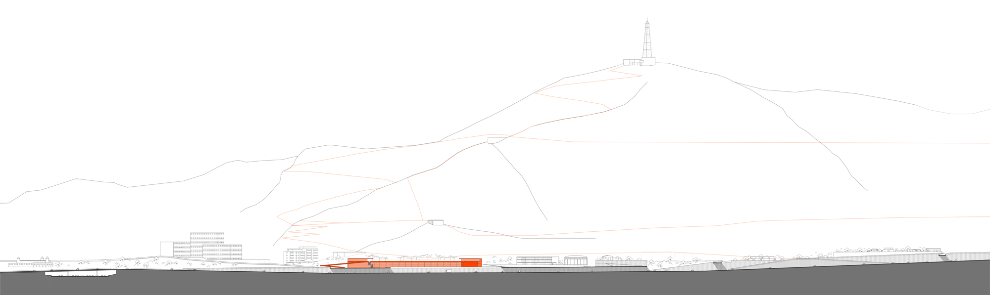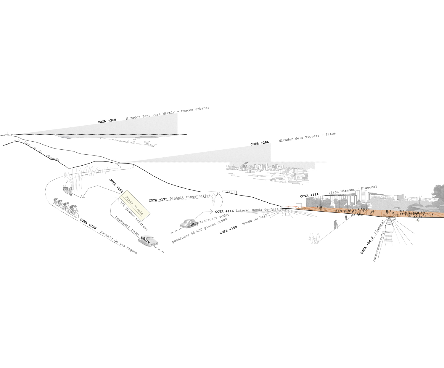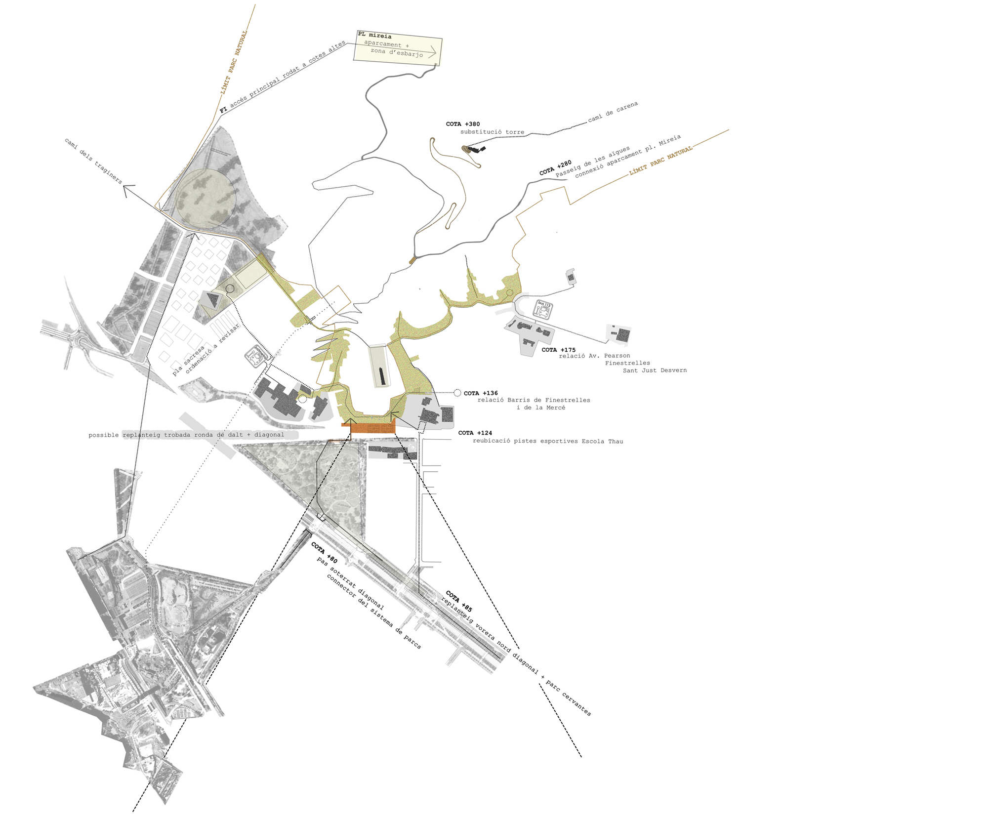 Las montañas no son tan solo elementos orográficos neutros, accidentes determinados por su dinámica de placas. Son más que eso. Las montañas abrigan los pueblos y ciudades, los configuran, les dan carácter e identidad, a la vez que, en alcanzarlas, se convierten en atalayas privilegiadas que nos abren nuevos horizontales y redimensionan medidas y relaciones habituales. Hace falta ser sensibles con ellas ya que una actuación desafortunada del hombre puede hacer perder su valor. Por eso, queremos que nuestra actuación sea mínima. Queremos dejar la montaña tranquila, recuperar el perfil orográfico original y definir con sensibilidad los límites con el tejido urbano de la ciudad. “No hacer nada con urgencia”. A veces, en la vida de una ciudad amenazada por decisiones que pueden perjudicarle, es necesario no hacer nada con urgencia. Este escrito de Jaime Lerner en la publicación reeditada por el IAAC, Acupuntura Urbana, reafirma, en este caso, nuestra decisión genérica en la parte menos antropizada de la montaña donde solamente planteamos un mínimo acondicionamiento de caminos existentes de relación transversal a media vertiente. Más que una puerta, creemos que se ha de replantear una bisagra o cremallera entre la naturalidad de la montaña y la artificialidad de la ciudad, y hace falta hacerlo con mucho tacto teniendo en cuenta la sección transversal. Proponemos un recorrido secuencia de peatones entre la calle de Santa Rosa, del barrio de Finestrelles y la calle de Ardena, del barrio de la Mercé. Este recorrido se plantea como una suma de espacios a través de un camino que pasaría por el lado meridional del hotel Abba Garden, salvando un pequeño torrente con una pasarela para conectar aproximadamente a la cota 135m, coincidiendo con la cubierta de los depósitos de agua.