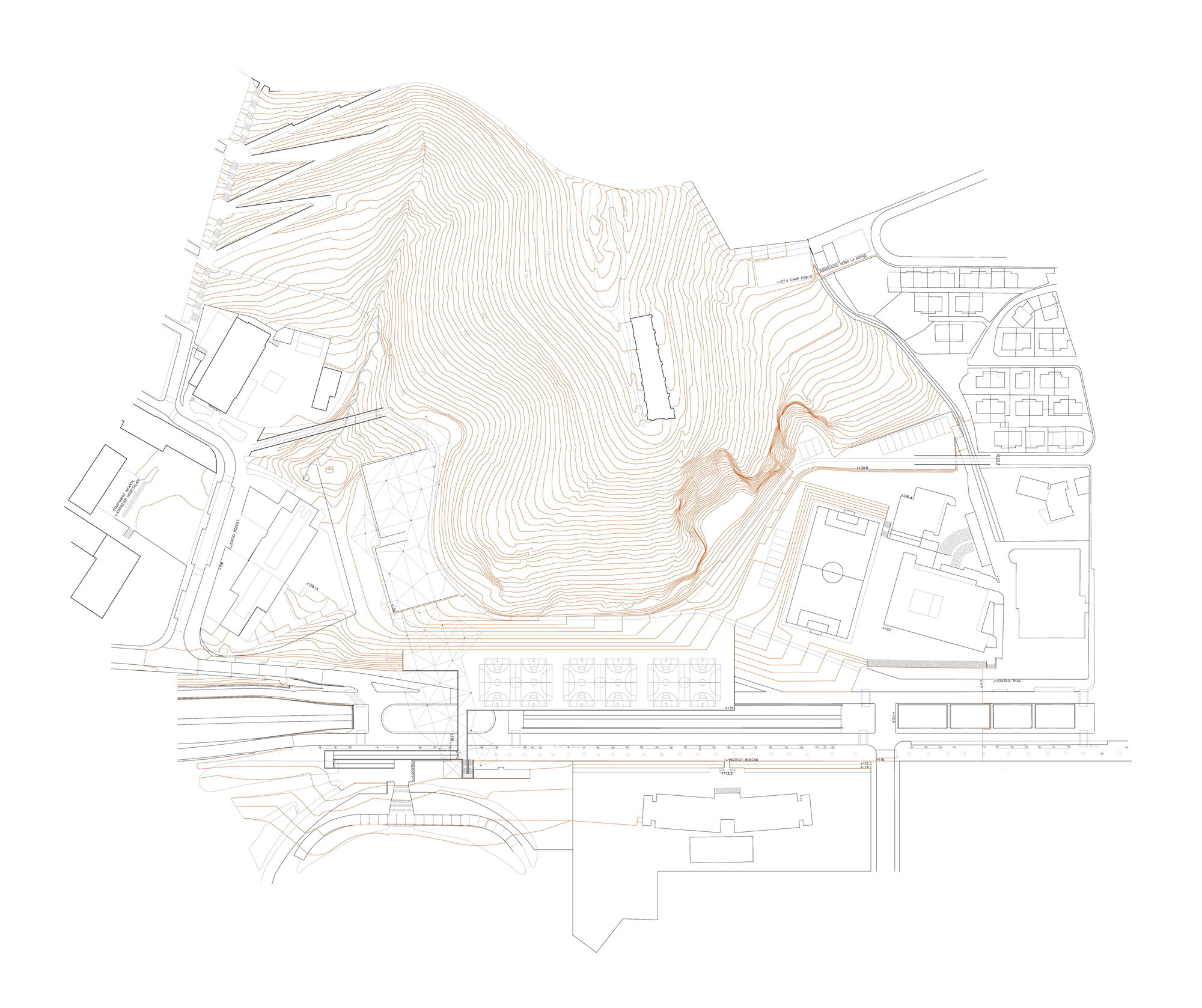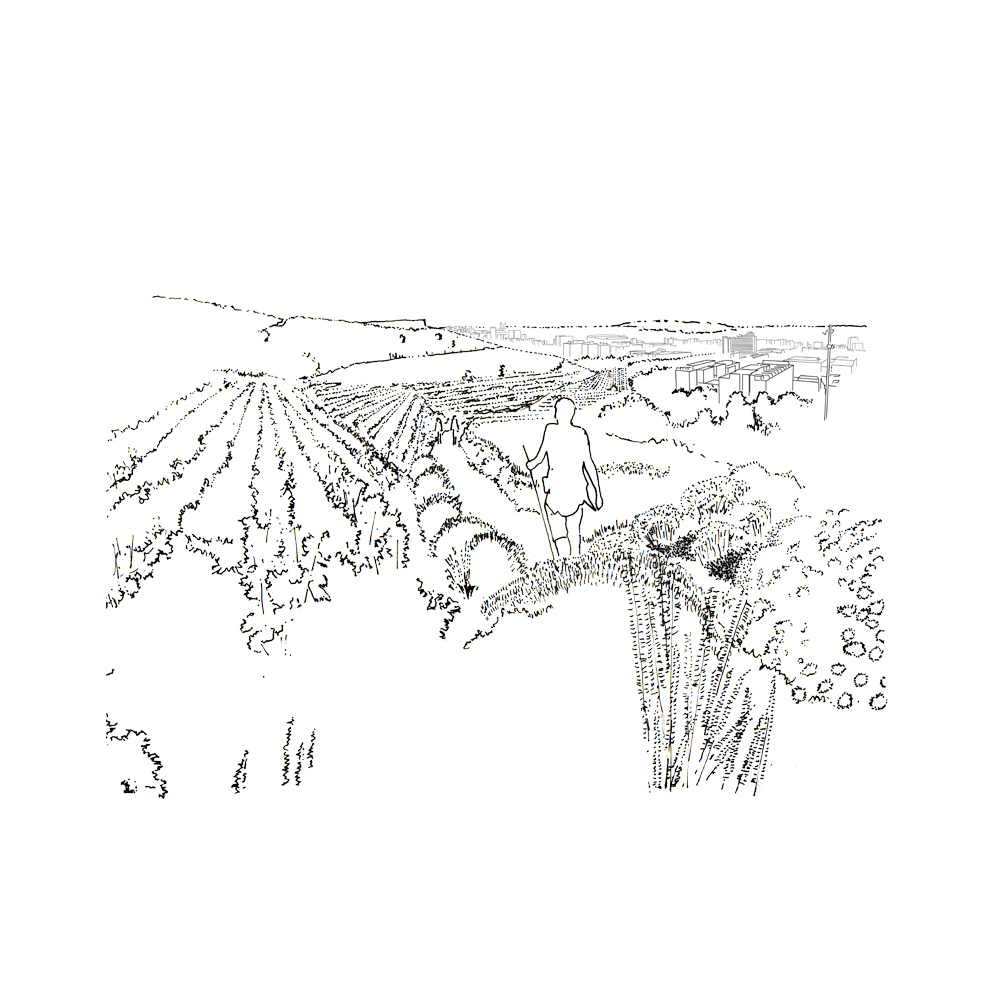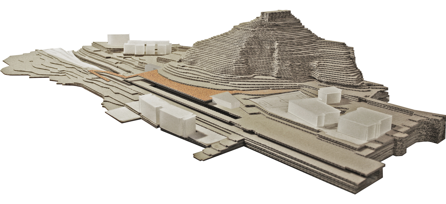 Las montañas no son tan solo elementos orográficos neutros, accidentes determinados por su dinámica de placas. Son más que eso. Las montañas abrigan los pueblos y ciudades, los configuran, les dan carácter e identidad, a la vez que, en alcanzarlas, se convierten en atalayas privilegiadas que nos abren nuevos horizontales y redimensionan medidas y relaciones habituales. Hace falta ser sensibles con ellas ya que una actuación desafortunada del hombre puede hacer perder su valor. Por eso, queremos que nuestra actuación sea mínima. Queremos dejar la montaña tranquila, recuperar el perfil orográfico original y definir con sensibilidad los límites con el tejido urbano de la ciudad. “No hacer nada con urgencia”. A veces, en la vida de una ciudad amenazada por decisiones que pueden perjudicarle, es necesario no hacer nada con urgencia. Este escrito de Jaime Lerner en la publicación reeditada por el IAAC, Acupuntura Urbana, reafirma, en este caso, nuestra decisión genérica en la parte menos antropizada de la montaña donde solamente planteamos un mínimo acondicionamiento de caminos existentes de relación transversal a media vertiente. Más que una puerta, creemos que se ha de replantear una bisagra o cremallera entre la naturalidad de la montaña y la artificialidad de la ciudad, y hace falta hacerlo con mucho tacto teniendo en cuenta la sección transversal. Proponemos un recorrido secuencia de peatones entre la calle de Santa Rosa, del barrio de Finestrelles y la calle de Ardena, del barrio de la Mercé. Este recorrido se plantea como una suma de espacios a través de un camino que pasaría por el lado meridional del hotel Abba Garden, salvando un pequeño torrente con una pasarela para conectar aproximadamente a la cota 135m, coincidiendo con la cubierta de los depósitos de agua.