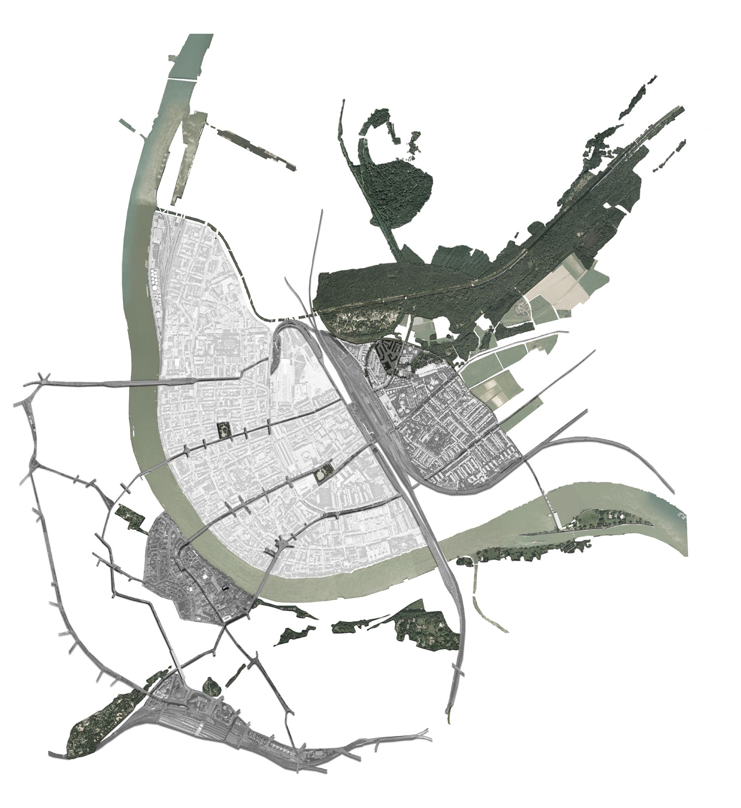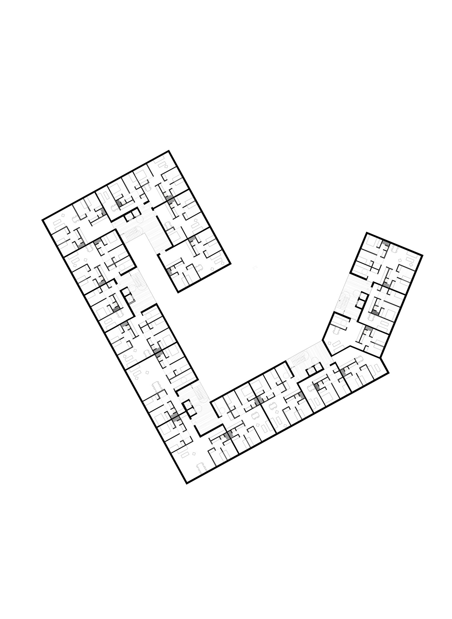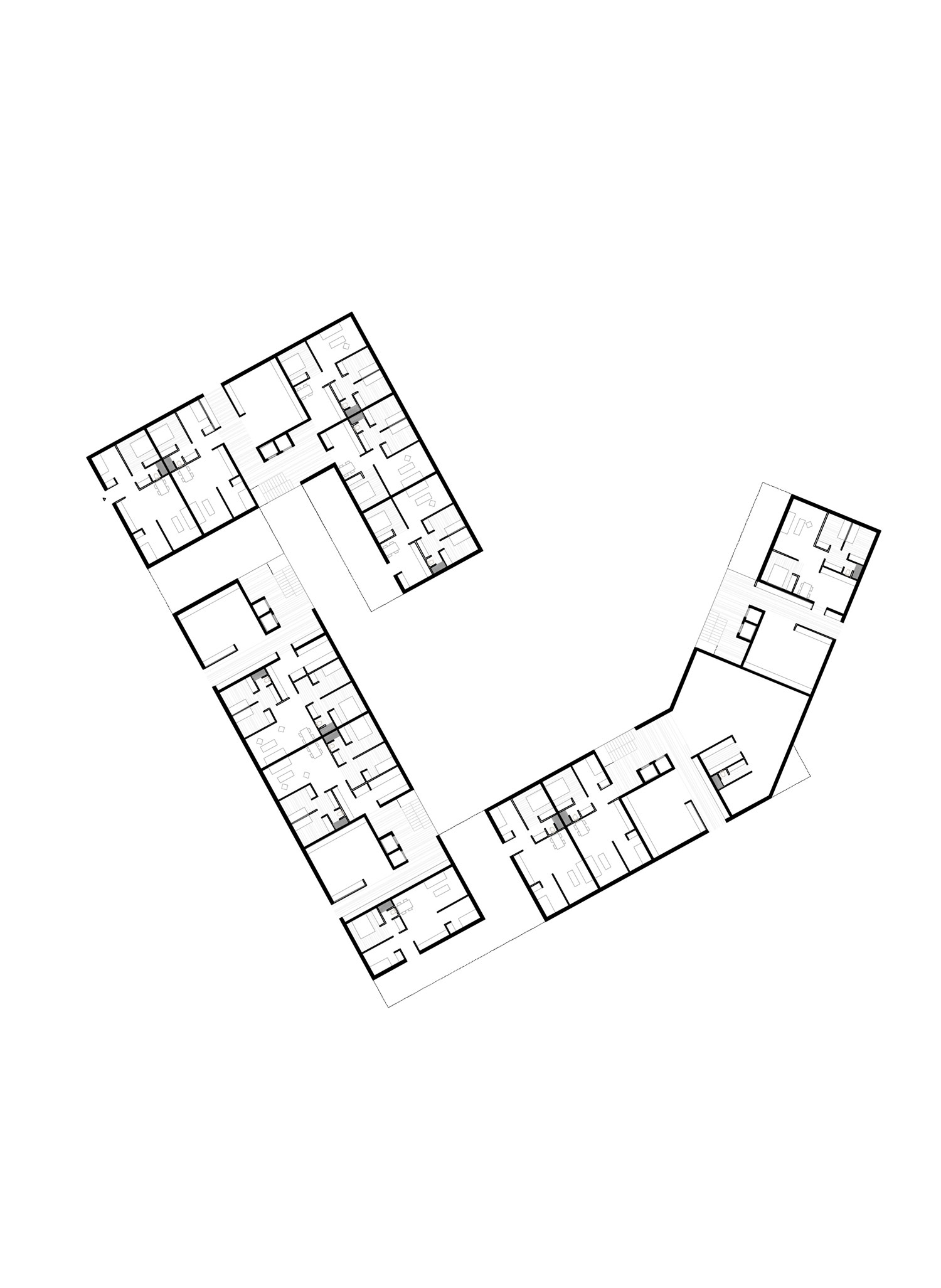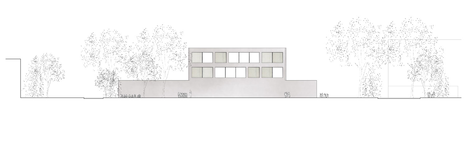 Un claro en el bosque, aquél espacio donde nos agrupamos, donde a la vez de cobijarnos y protegernos transmitimos nuestros conocimientos de generación en generación. El proyecto pretende hacer una lectura del entorno apropiándose del lugar, de su medio natural y de su trama urbana. El conjunto coloniza el lugar a través de la geometría, una huella en planta que reconoce la heterogeneidad de direcciones que impregnan el lugar, dejando a su vez que el “Langen Erlen” acabe formando parte de la fachada propuesta para la calle Schorenweg. Construir ciudad, tejido, a través de las edificaciones pero a la vez construir vacíos, plazas, claros, que dispongan los espacios necesarios para sus relaciones sociales y funcionales.