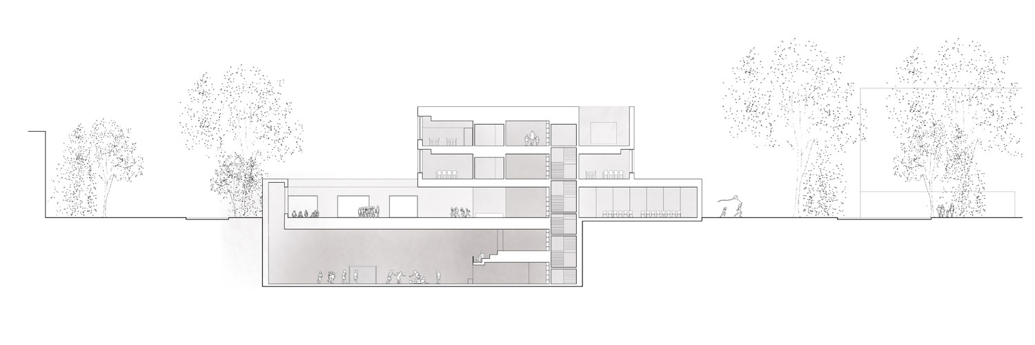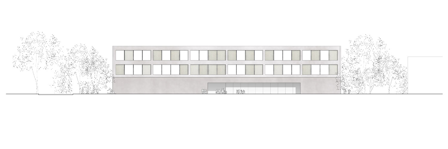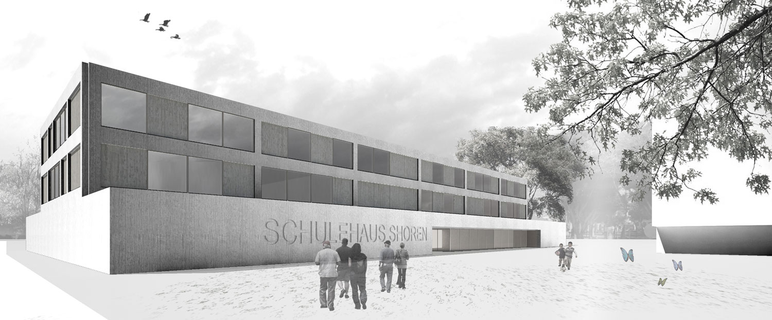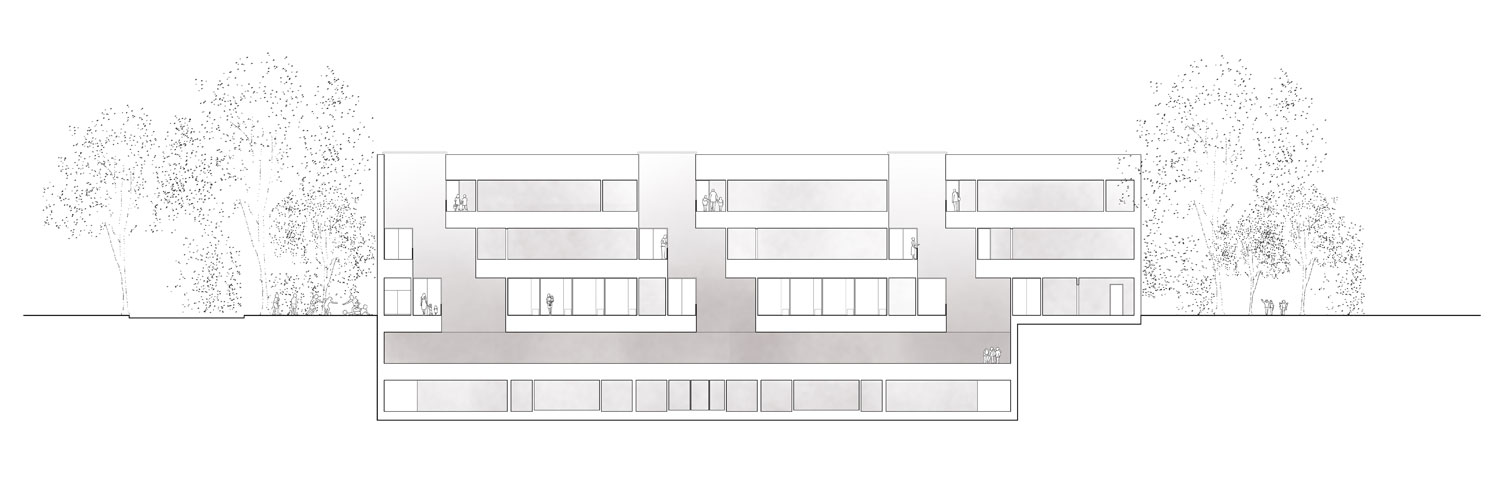 El bloque lineal reconoce una escala más colectiva que urbana y permite ventilar e iluminar los núcleos de comunicación. Tan solo cinco núcleos de comunicación vertical organizan todos los accesos. El cambio de orientación del bloque para alinearse con la fachada del noroeste permite generar conjuntamente con la escuela un paso público que conecta la calle Schorenweg y la Fasanenstrasse. Pero también se abre a la calle Schorenweg hacia la escuela y su acceso principal, que a modo de plaza permite el salto de la vegetación existente al otro lado, donde los bloques aislados conviven con la misma. La escuela se dispone alineándose con la calle In den Schorenmatten. Una volumetría más compacta que encierra en sí misma los patios y lucernarios que su uso precisa para su funcionalidad pero que también permiten su estructuración interior. Su posición permite que, en contraposición a las manzanas residenciales, esté rodeado por tres plazas, tres vacíos urbanos que relacionan uso y espacio público. Su acceso se produce a través de la plaza situada en la calle Schorenweg. Así el vestíbulo previo es la propia plaza, donde la vegetación acompaña al usuario hacia su interior.