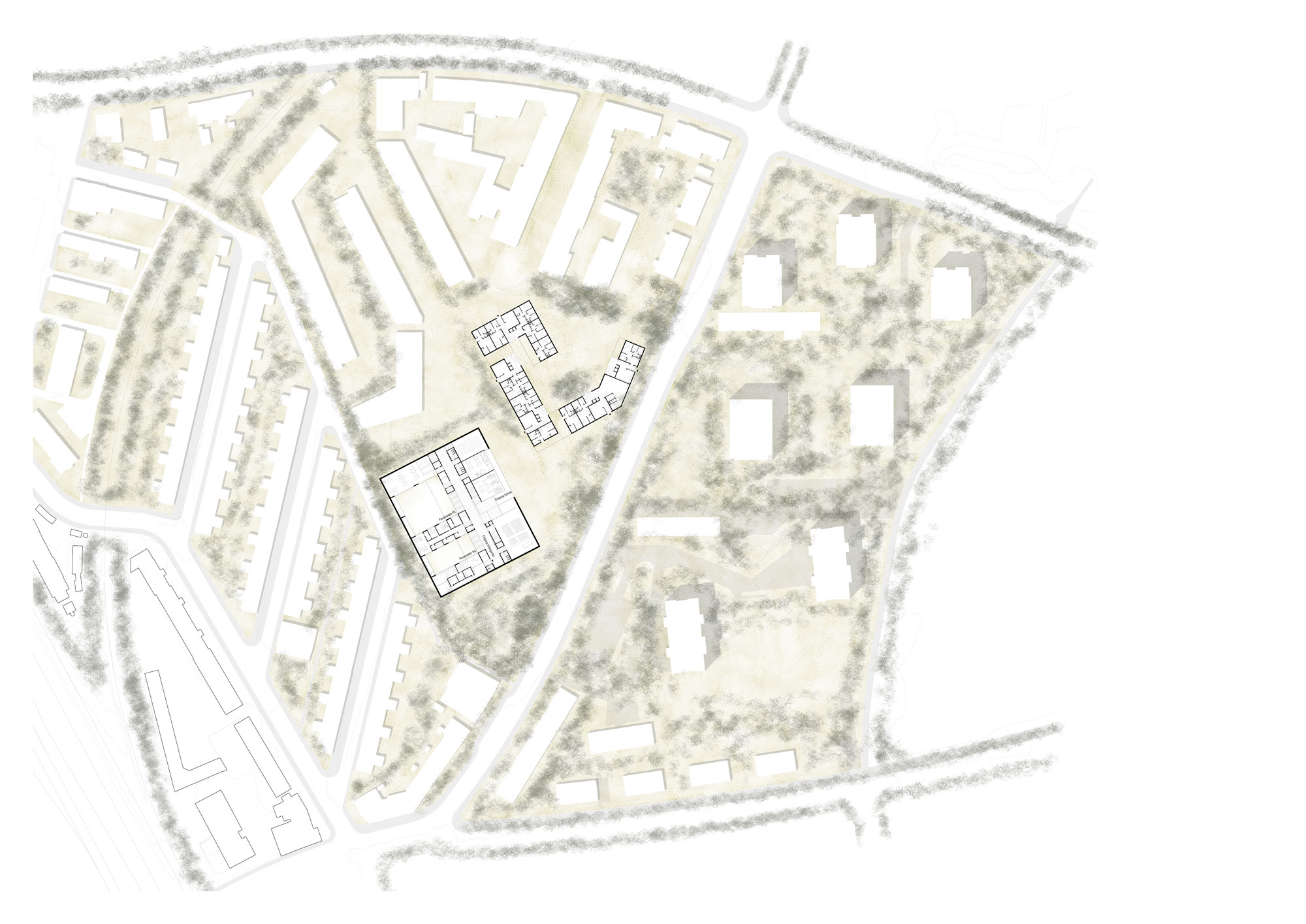 La propuesta procura conectar la trama existente creando dos manzanas que se relacionan con la escuela a través de tres pequeñas plazas urbanas. La escuela sirve de articulación y de punto central de dichas plazas. El edificio residencial se dispone cerrando la manzana que limita con las calles Schorenweg y Fasanenstrasse. Reconoce y busca similitudes con la superficie que ocupan las manzanas residenciales que, todo y ser físicamente franqueables, son visualmente recintos cerrados. Se conforma mediante una volumetría lineal que encierra en sí misma, proporcionando un patio interior que se adapta al existente del sector noreste, a la vez que dos pasos en planta baja permiten la transición entre el espacio público y comunitario.
