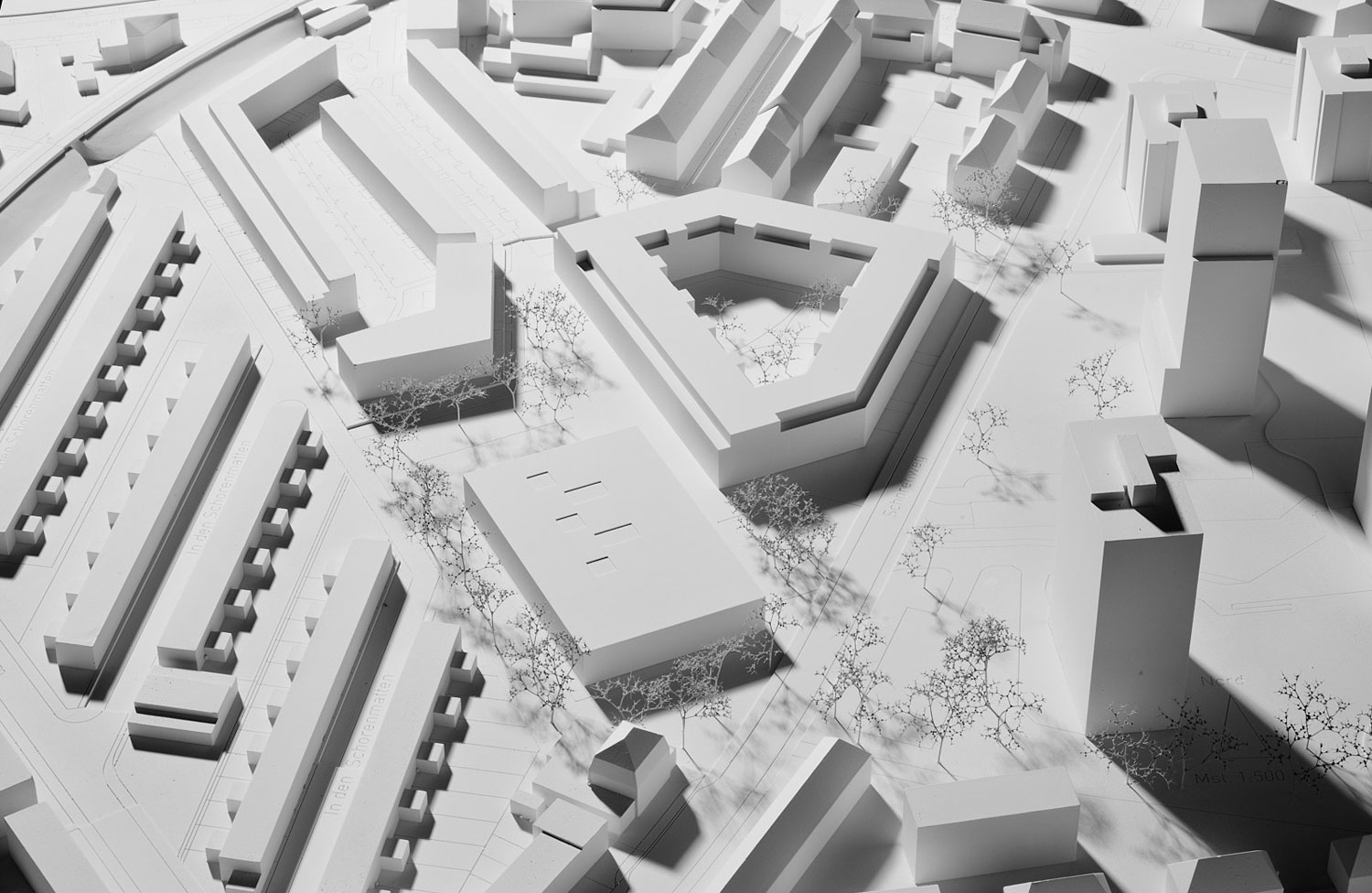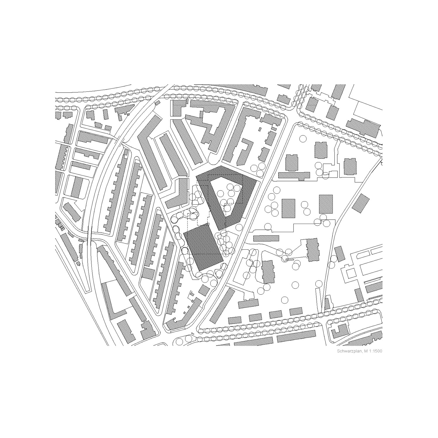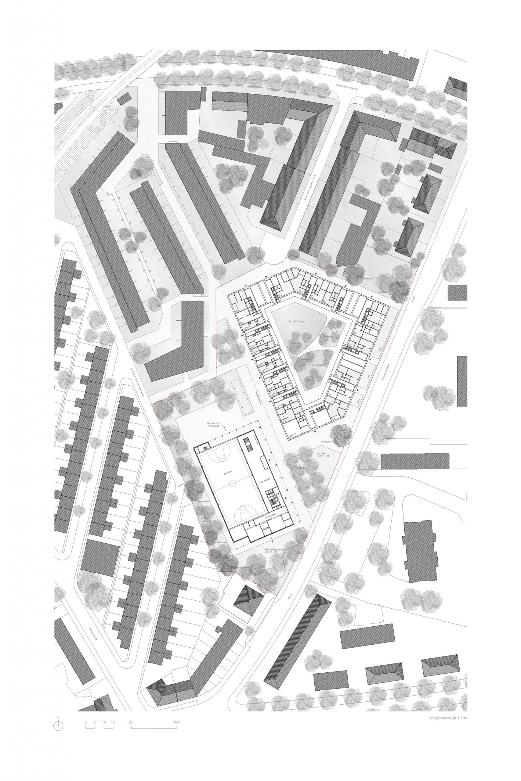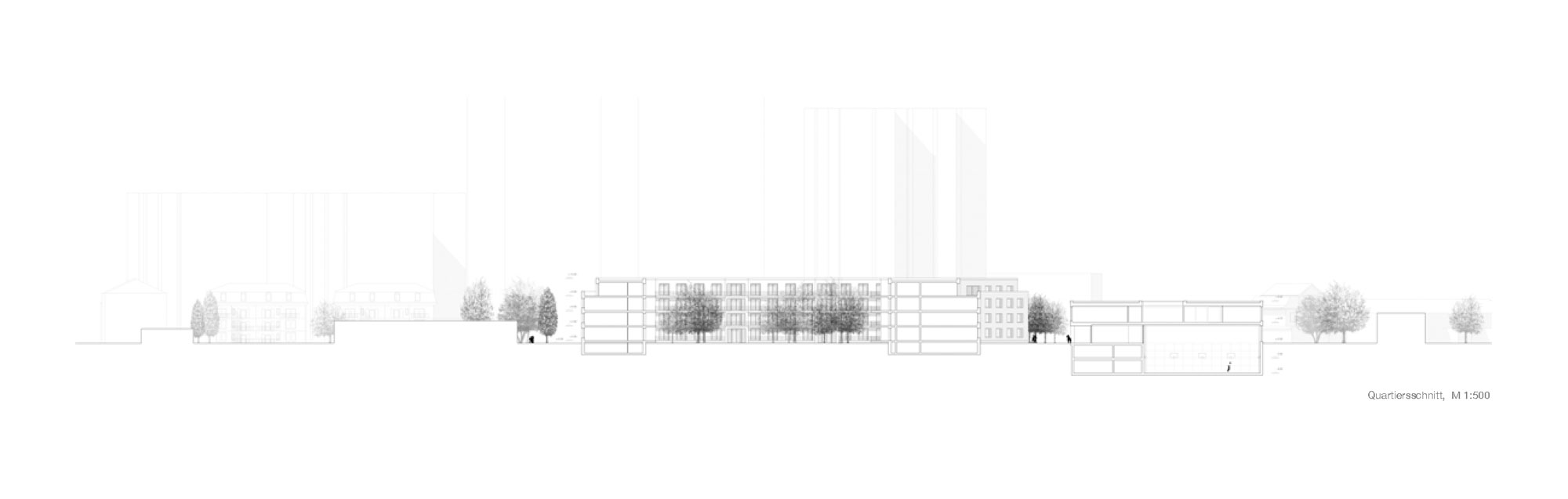 Das Projekt nutzt das vorgegebene Programm, um das Schoren-Quartier neu zu interpretieren. Der Wohnungsbau ergänzt die städtischen Strukturen und erzeugt mit dem Blockrand eine Verdichtung, die dem Quartier urbanen Charakter verleiht. Der zweite Arealteil wird durch die Schule besetzt, welche sich von den Quartiersbausteinen der Nachbarschaft absetzt und sich als öffentliches Haus im neuen Zentrum etabliert. Der grosse, lagernde Baukörper der Schule bildet das horizontale Gegenüber zu den vertikalen Wohntürmen im Osten und markiert mit seinem Vorplatz den zentralen Ort am Schorenweg. Über den städtischen Zwischenraum von Schule und Wohnblock wird das Quartier in die Tiefe erschlossen, wo sich der Pausenhof als vielfältig nutzbarer Freiraum öffnet. Längs der Schule und zum Schulhof orientiert, bietet das öffentliche Schulhaus gedeckte Aussenbereiche, die das Haus und den Stadtraum miteinander verweben.