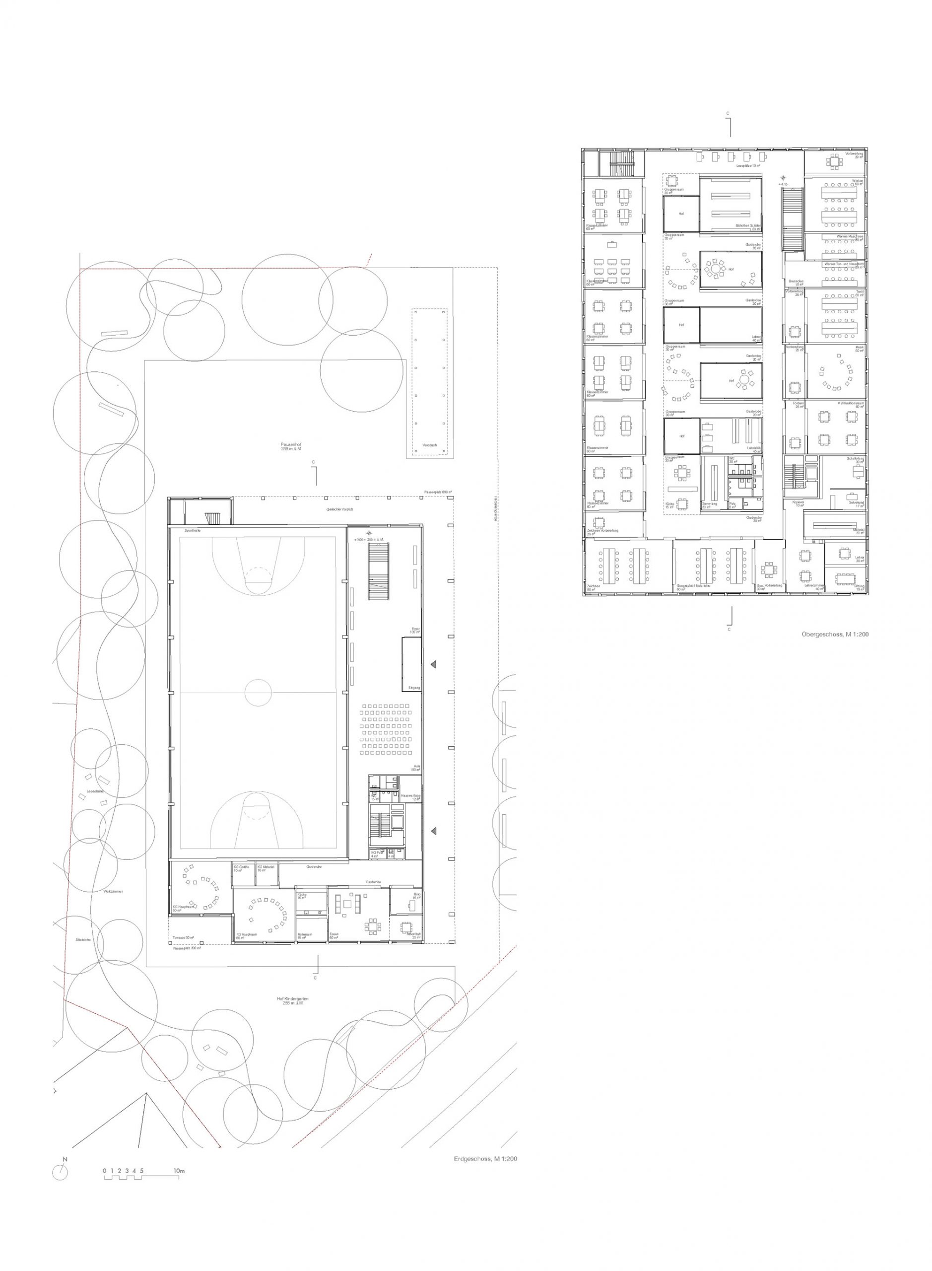 Das Schulhaus, mit den öffentlichen Freiflächen nach aussen und der Blockrand, mit seinem privaten Wohnhof gegen innen, komplettieren die Planungen und die bestehenden Stadtstrukturen auf subtile aber selbstbewusste Weise. Wohnhaus und Schule beziehen sich aufeinander, bestechen aber in Ihrer Typologie und durch die klar formulierten Aussenräume als eigenständige Häuser. Der neu entstandene Ort stärkt den Charakter des Schoren und gibt dem Quartier die Chance aus dem‚ Dornröschenschlaf? zu erwachen.