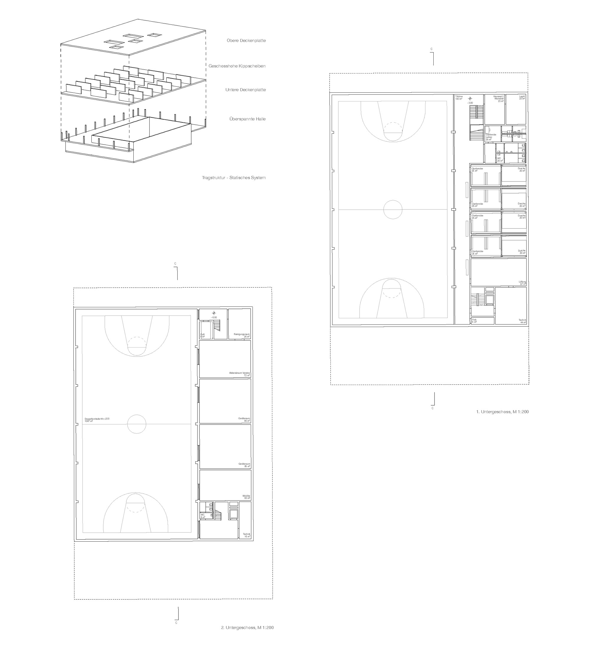 Der öffentliche Charakter des Schulhauses wird im Innern weitergeführt. Die grosse Raumeinheit von Foyer und Aula ermöglicht vielfältige Nutzungsszenarien für Schüler und Quartiersbewohner. Der direkte Bezug zur Sporthalle schafft spannende Raumerlebnisse und bietet sogar den Durchblick zu den Aussenräumen im Süden. Kindergarten und Tagesstrukturen komplettieren das Raumgefüge auf Eingangsebene. Über die grosszügige Treppenanlage öffnet sich im Obergeschoss die weite Lernlandschaft, die durch die Bezüge nach aussen und zu den innen liegenden Höfen (Aussenklassenzimmer) einen transparent-fröhlichen Charakter erhält.