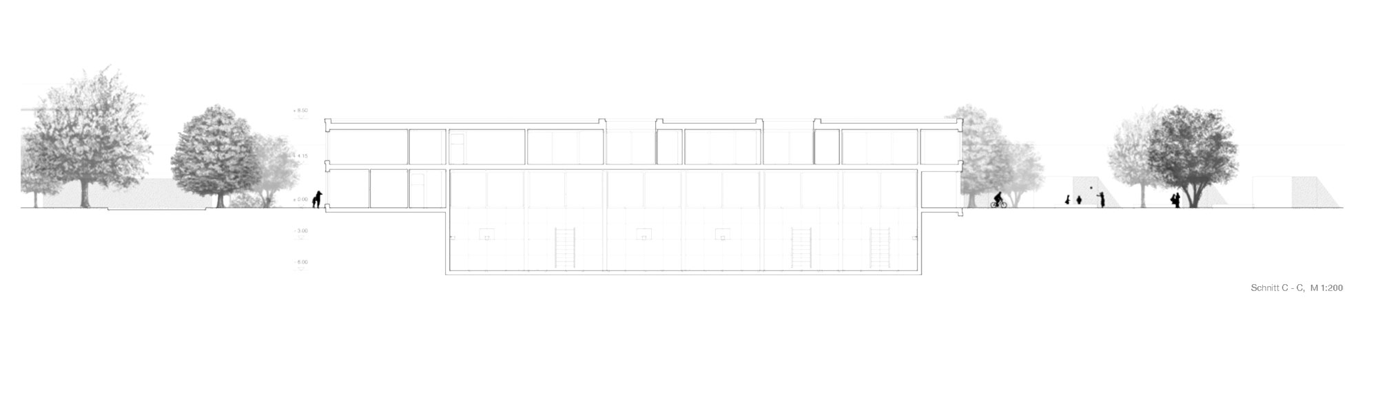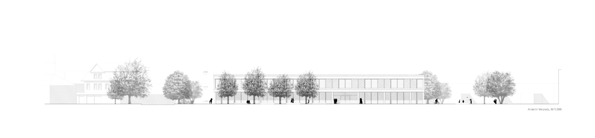 Das Konzept folgt der Anforderung einer Schule ‚im Grünen? Einerseits blicken die Kinder in die Baumkronen der Linden auf dem Quartierplatz, andererseits umgarnt ein Baumhain die Schule zum Quartier im Süden. Die präzise Setzung des Gebäudes definiert vielfältige Aussenräume: Die intimen Nischen des Baumhains für den Rückzug, sowie die grossen Flächen der Pausenhöfe für Spiel und Bewegung. Der Quartiersplatz vor der Schule öffnet sich zum Strassenraum des Schorenwegs und bietet für Schule und Quartier hohe Aufenthaltsqualität. Gleichzeitig formulieren die Linden in ihrer Rasteranordnung die klare Adresse der Schule, auch im Hinblick auf die Quartiersnutzung von Aula, Foyer und Sporthalle. Der Wohnhof bietet den Bewohnern innerhalb des Blockes einen grosszügigen aber privaten Bezug zum Grün. Abwechselnd dichte Bepflanzung und offene Flächen werden entsprechend bespielt. Die von der Allgemeinheit genutzten Mehrzweckräume im Parterre erhalten ihr Pendant im gemeinschaftlich genutzten Teil des «Schorenhofs».