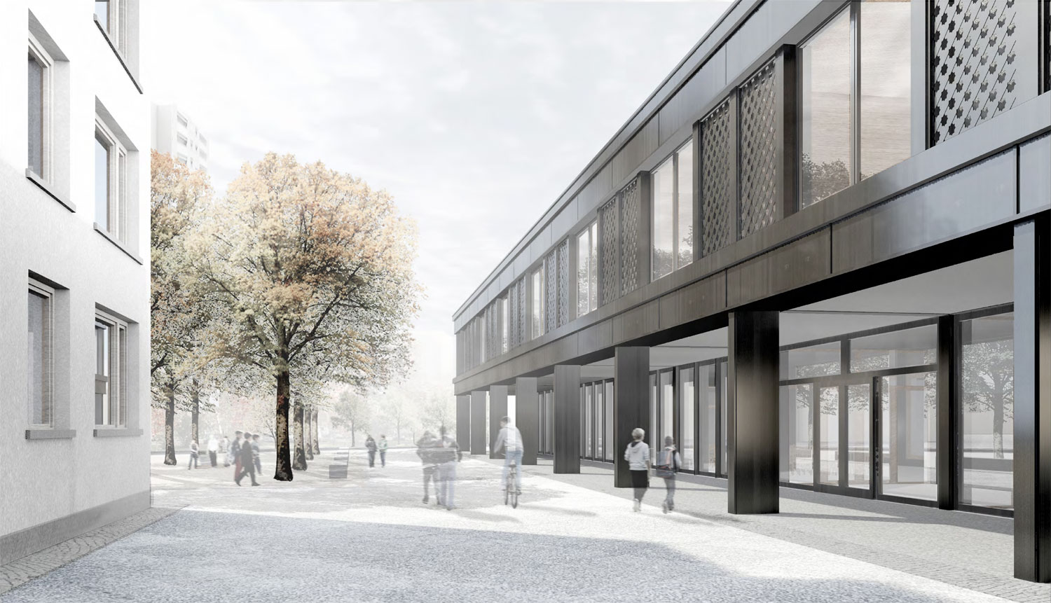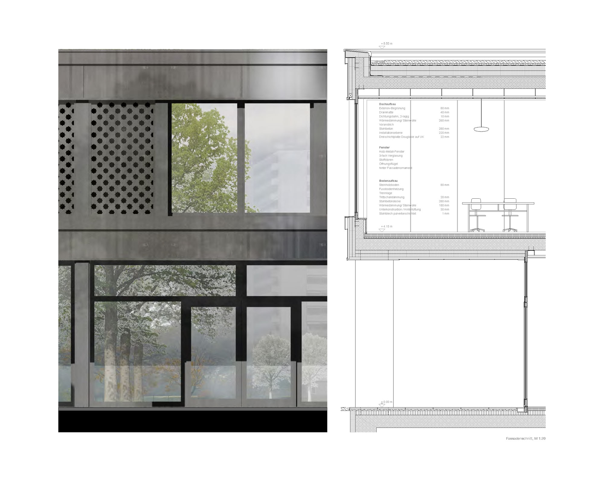 Der architektonische Ausdruck ist durch die horizontale Gliederung des Baukörpers bestimmt und spiegelt die innere Aufteilung der Geschosse wider. Auch die Fassade thematisiert den Übergang vom öffentlichen Stadtraum in das Innere: Neben den freistehenden Stützen der Zugangsbereiche bietet die gegliederte Blechfassade unterschiedliche Öffnungsgrade vom transparenten Fenster, über die ornamentierten Läden bis hin zum geschlossenen Fassadenpanel. Im Innern wird das Prinzip der verkleideten Konstruktion weitergeführt und ermöglicht die Erschliessungsbereiche von den Aufenthaltsräumen zu unterscheiden. Holz (Douglasie 3-schicht Platten), als Material des Ausbaus, wird unter Beachtung des Brandschutzes eingesetzt, um dem Nutzer haptische Qualitäten und die Erlebbarkeit der Materialien näher zu bringen.