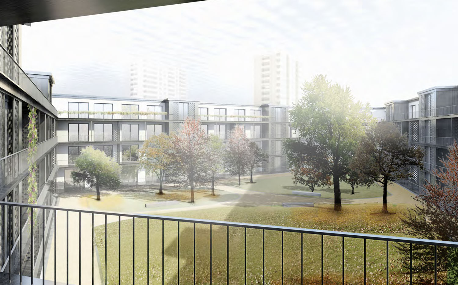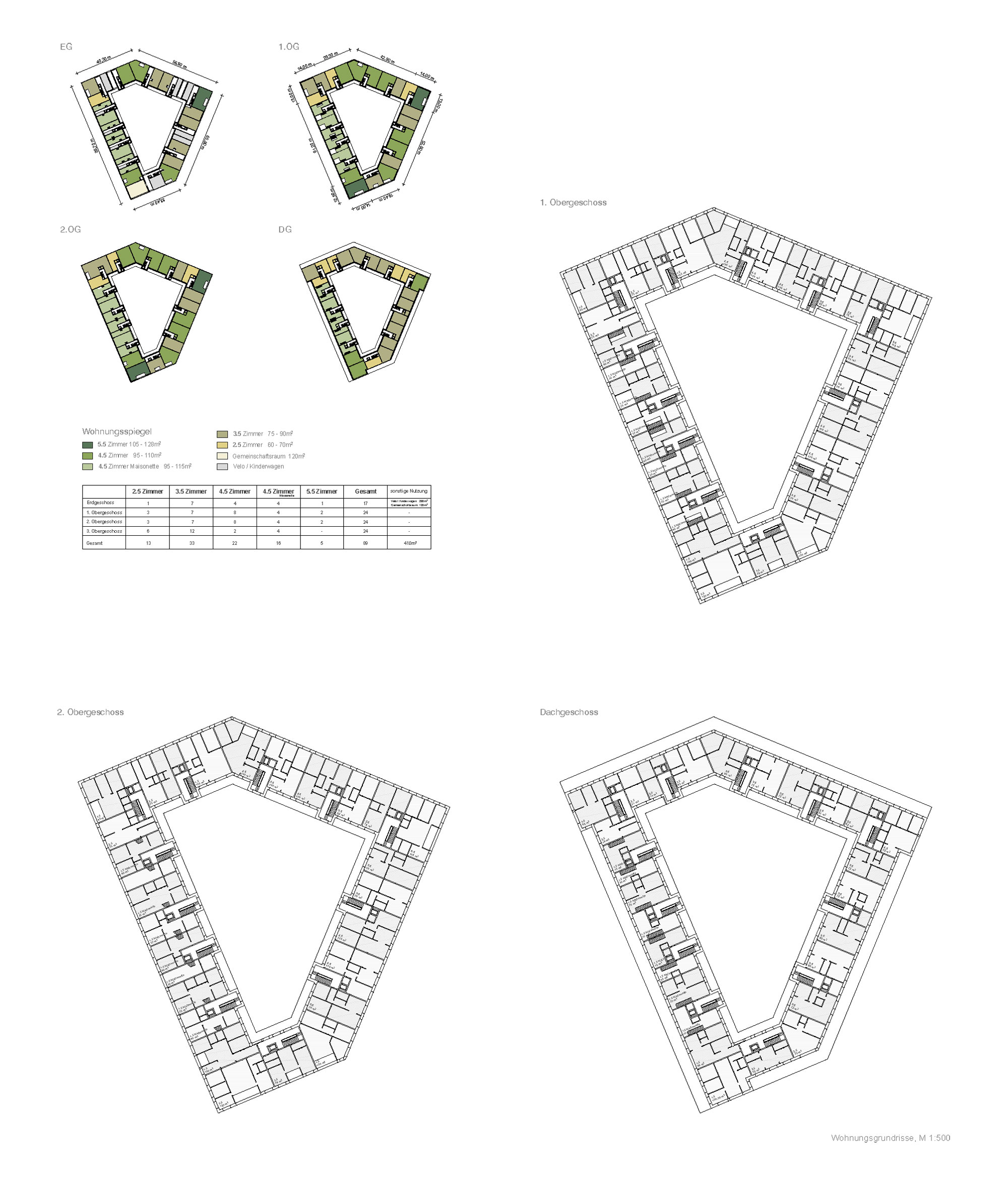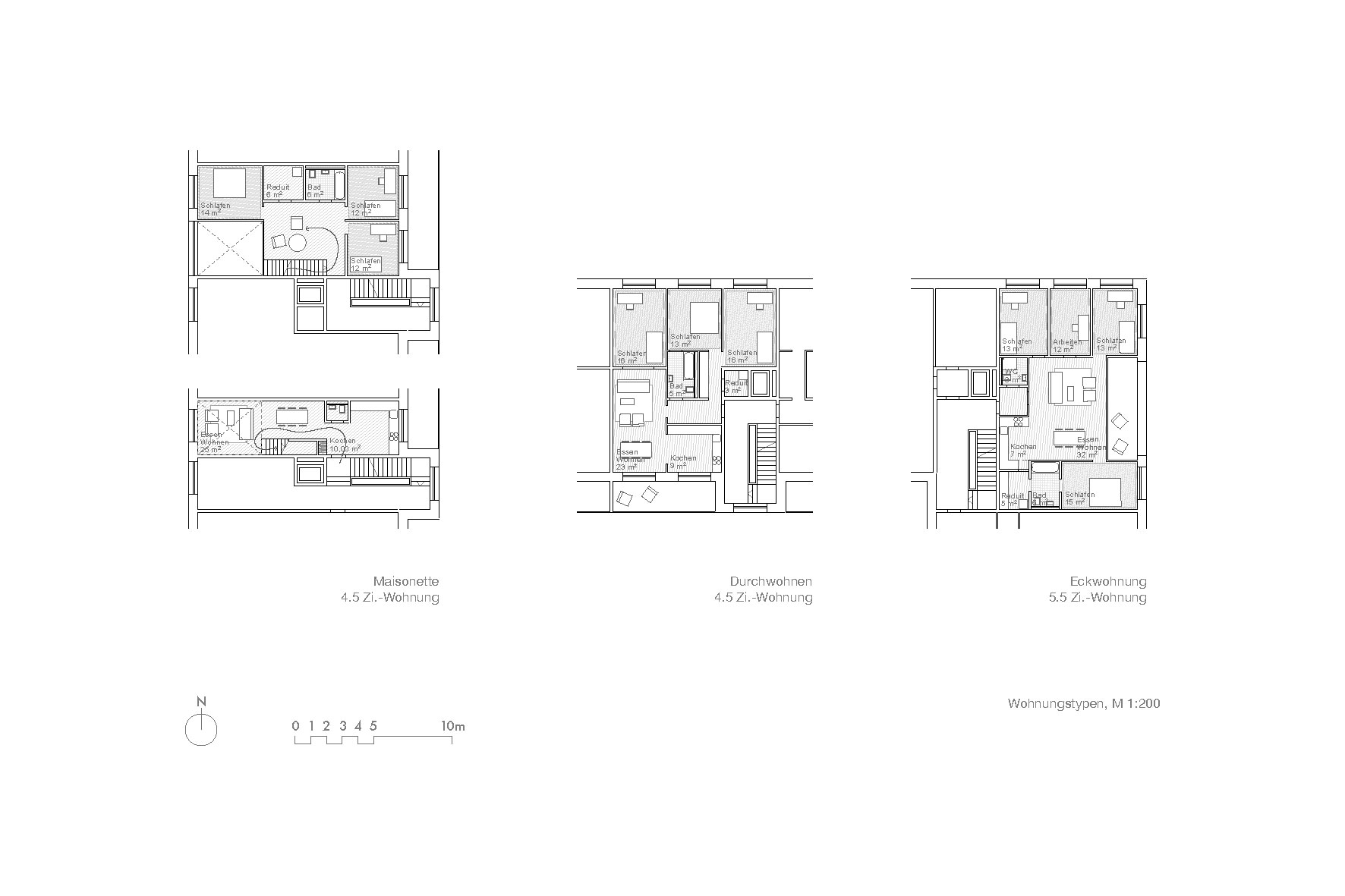 Zentrale Idee des Wohnungsbaus ist das städtische Wohnen am Hof. Für alle Bewohner ist sowohl der Wohnhof nach innen, als auch der Bezug zum urbanen Raum nach aussen erlebbar. Aus dieser städtebaulichen – architektonischen Grundanlage des Blocks leiten sich vielfältige Formen des modernen Wohnens ab: Erdgeschosseinheiten können als Hochparterrewohnungen organisiert werden und bekommen zum Hof private Terrassen. In den Hauptgeschossen befinden sich die durchgesteckten Wohnungen mit komfortablen Balkonen. Richtung Süden gibt es einen Anteil an Maisonette Wohnungen, die dem Anspruch der individuellen Hauseinheit im Block gerecht werden. Im dritten Obergeschoss öffnet sich das Attikageschoss mit dem weiten Blick ins Quartier. Die grossen Übereckwohnungen vervollständigen den vielfältigen Wohnungsmix. Architektonisch orientiert sich der Wohnungsbau an der Nachbarschaft und baut gegen aussen seine städtische Haltung auf. Zum Hof wird die Fassade aus der Logik der privaten Freiräume entwickelt: vorgelagerte Balkone und Terrassen schaffen in Ihrer Leichtigkeit einen spielerischen Übergang zum Grün des Hofes und erinnern wieder an die leichte Fassade des Schulhauses nebenan. Die Referenz der Baumgartnerhäuser wird in zeitgemässer Form übertragen und in der Konsequenz des geschlossenen Blockes – von innen nach aussen – zugespitzt.