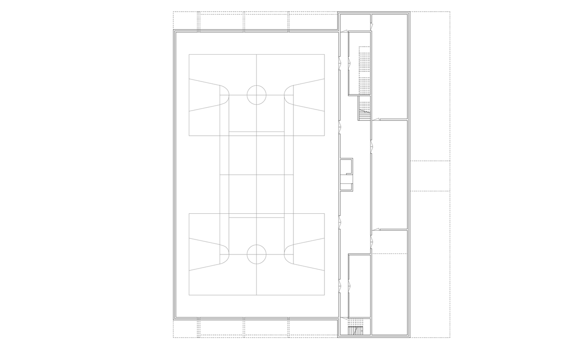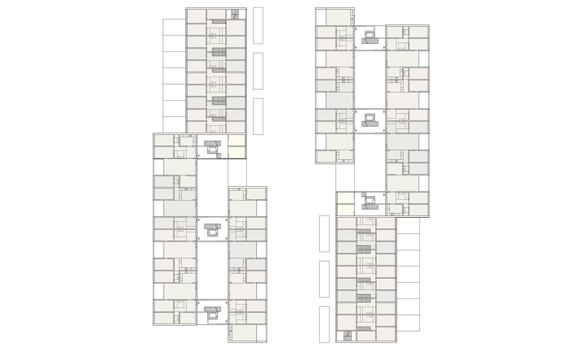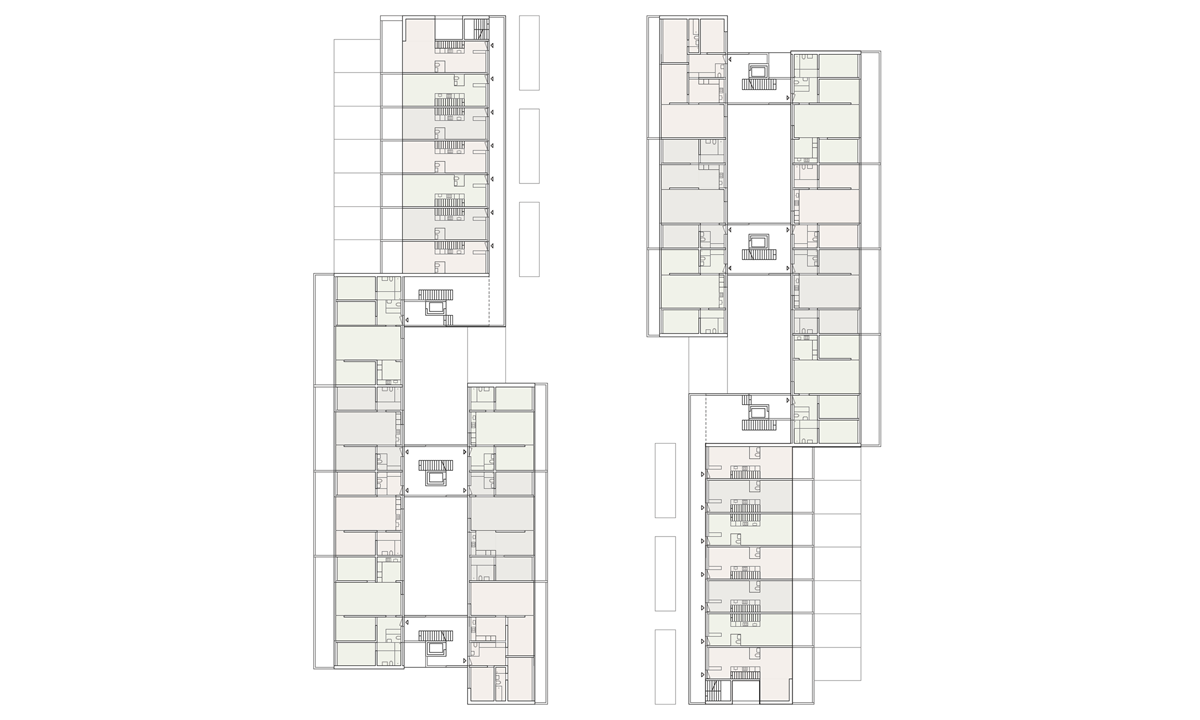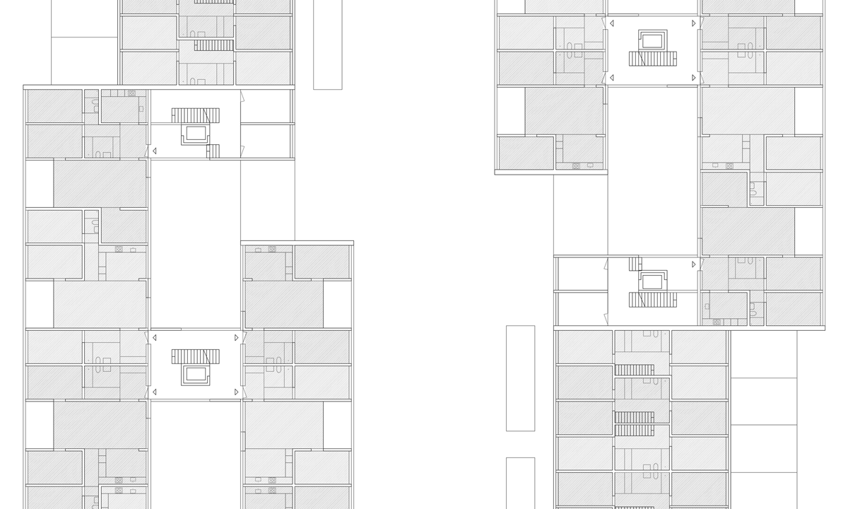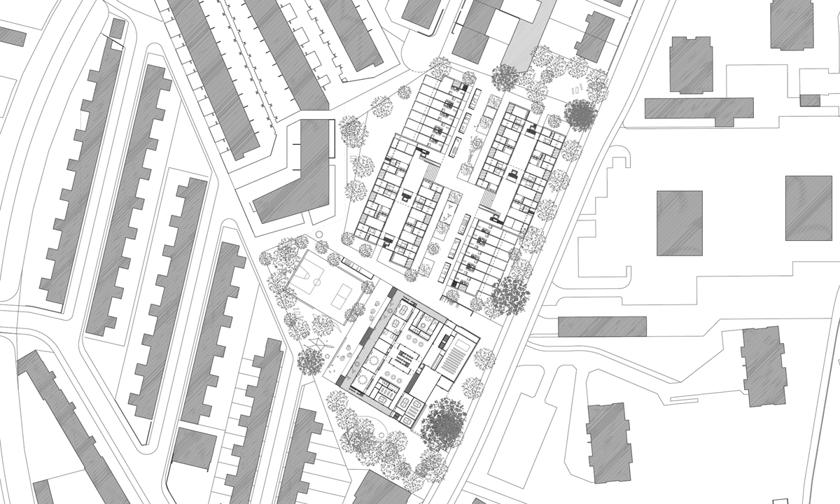 Das frei werdende Areal ermöglicht das Weiterbauen und Ergänzen der bestehenden Stadtstruktur. Als städtebauliche Fortsetzung der nordöstlichen, fragmentierten Blockrandbebauung ergänzt die Wohnüberbauung durch Ihre Geometrie und Massstäblichkeit die bestehenden Bauten. Durch die klare und konzentrierte Anordnung der Wohnüberbauung in dem vieleckigen Grundstück wird einerseits für das Schulhaus und dessen Umgebung im Süden des Areals ein grosszügiger Bereich freigespielt und andererseits polygonale Zwischenräume zu den übrigen Wohnstrukturen generiert, welche als verbindende und zugleich abstandhaltende Elemente funktionieren.