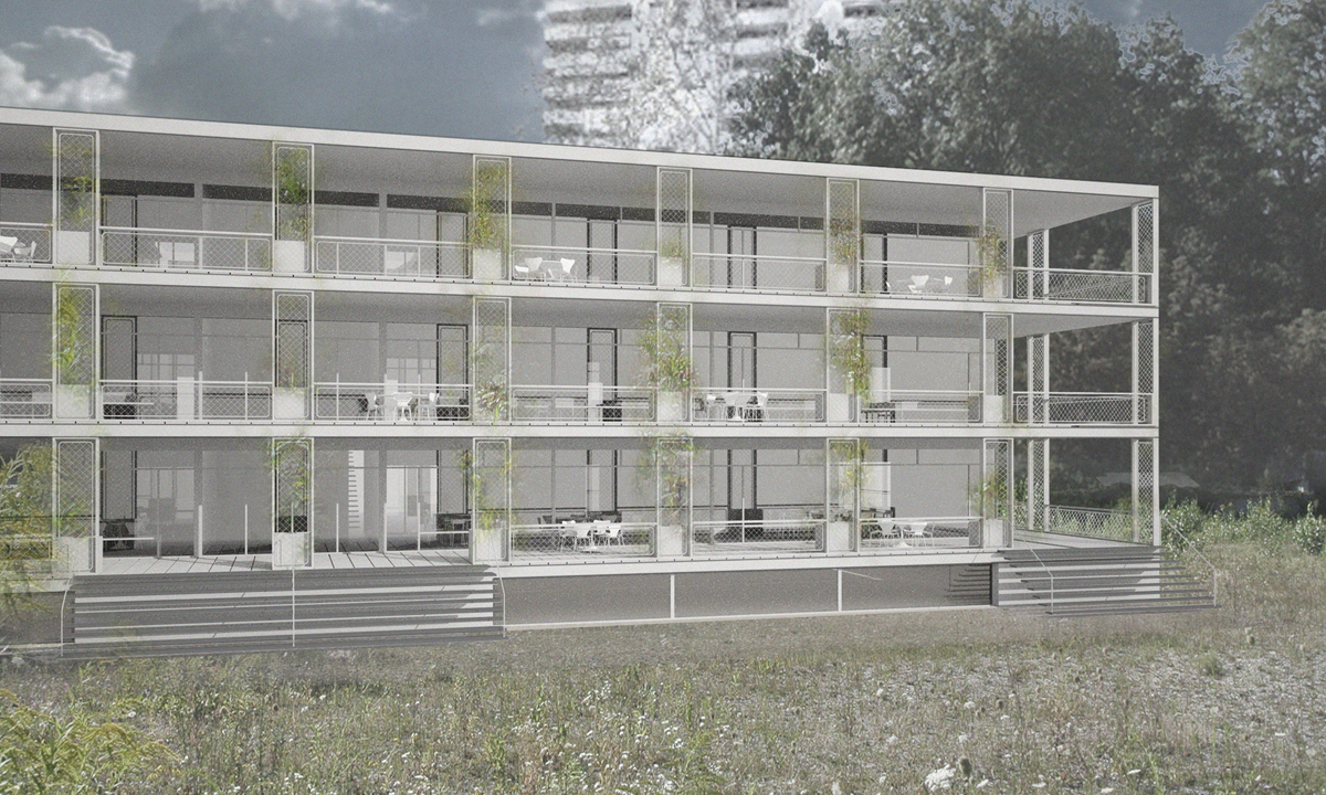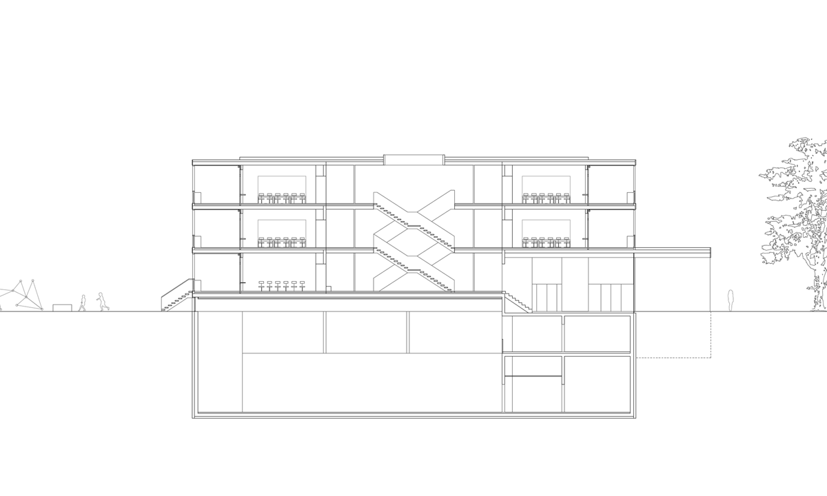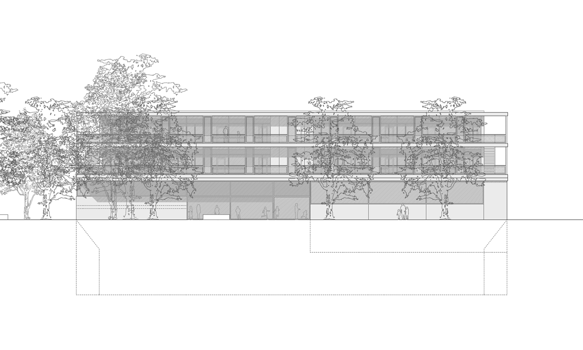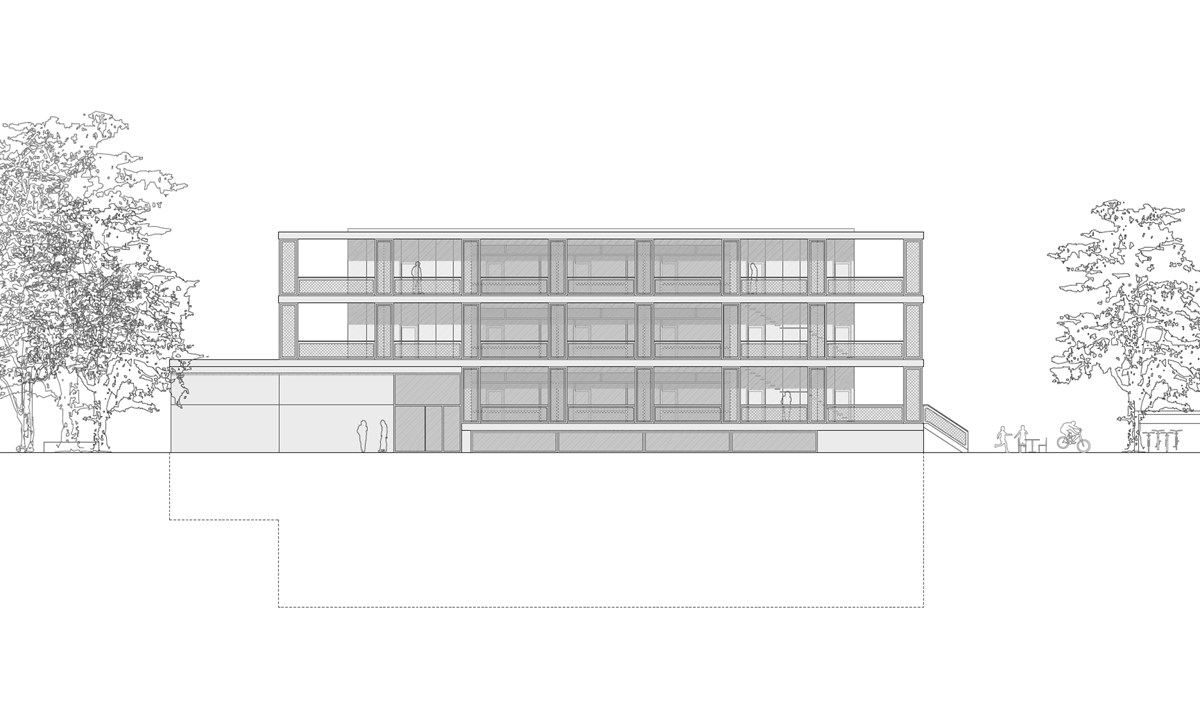 Das Schulhaus als solitärer Gebäudekörper ist zur Strasse leicht abgedreht und unterstreicht durch den frei werdenden Vorplatz dessen Bedeutung für das Quartier und die Bewohner. Schulhaus: Die flexibel bespielbare Multifunktionszone mit den Gruppenräumen soll frei gestaltet und möbliert, und den jeweiligen Bedürfnissen angepasst werden können. Von hier gelangen die Schülerinnen und Schüler in die Schulzimmer, welche alle über ein grosszügiges möblierbares Aussenschulzimmer verfügen. Die Offenheit und Leichtigkeit des Gebäudeinneren zeigt sich auch im äusseren Ausdruck durch die Filigranität und Feinheit der Bauteile. Die Verglasungen der Schulräume zu den Aussenschulzimmern vermittelt räumliche Grosszügigkeit und Transparenz. Elemente aus der Gartengestaltung sowie flexibel und individuell gestaltbare Begrünungen erzeugen eine angenehme Atmosphäre und bringen die Natur auch den oberen Geschossen direkt ins Schulzimmer.