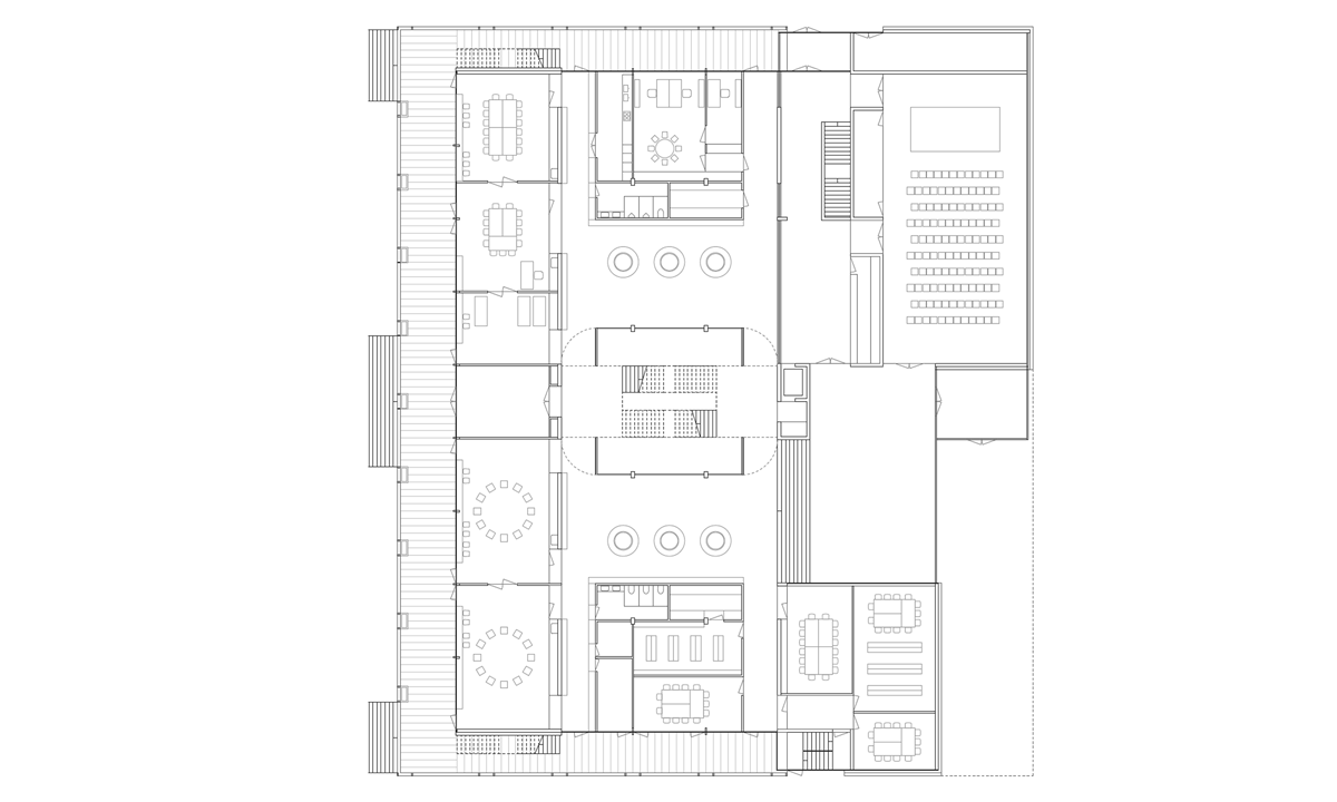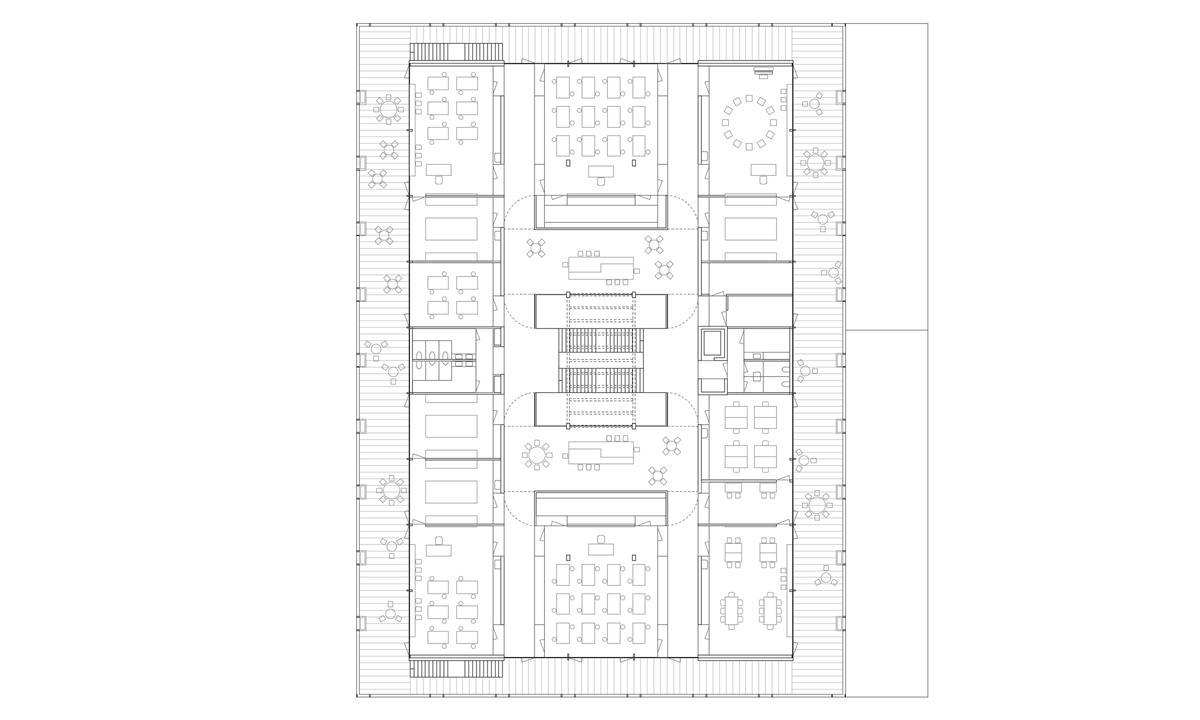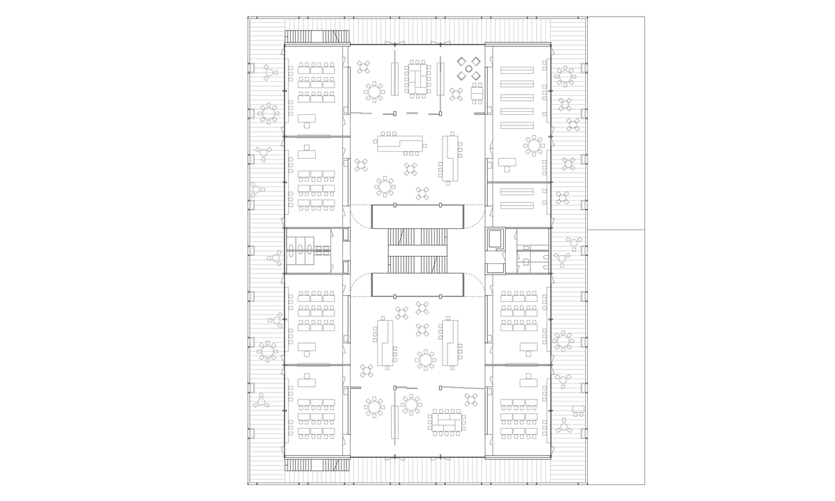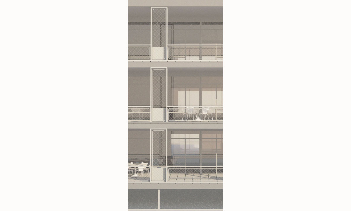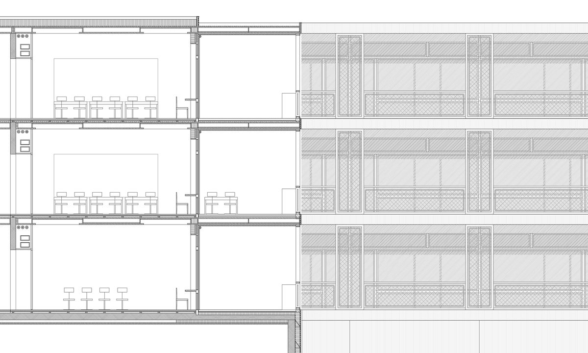 Das Schulhaus als solitärer Gebäudekörper ist zur Strasse leicht abgedreht und unterstreicht durch den frei werdenden Vorplatz dessen Bedeutung für das Quartier und die Bewohner. Schulhaus: Die flexibel bespielbare Multifunktionszone mit den Gruppenräumen soll frei gestaltet und möbliert, und den jeweiligen Bedürfnissen angepasst werden können. Von hier gelangen die Schülerinnen und Schüler in die Schulzimmer, welche alle über ein grosszügiges möblierbares Aussenschulzimmer verfügen. Die Offenheit und Leichtigkeit des Gebäudeinneren zeigt sich auch im äusseren Ausdruck durch die Filigranität und Feinheit der Bauteile. Die Verglasungen der Schulräume zu den Aussenschulzimmern vermittelt räumliche Grosszügigkeit und Transparenz. Elemente aus der Gartengestaltung sowie flexibel und individuell gestaltbare Begrünungen erzeugen eine angenehme Atmosphäre und bringen die Natur auch den oberen Geschossen direkt ins Schulzimmer.