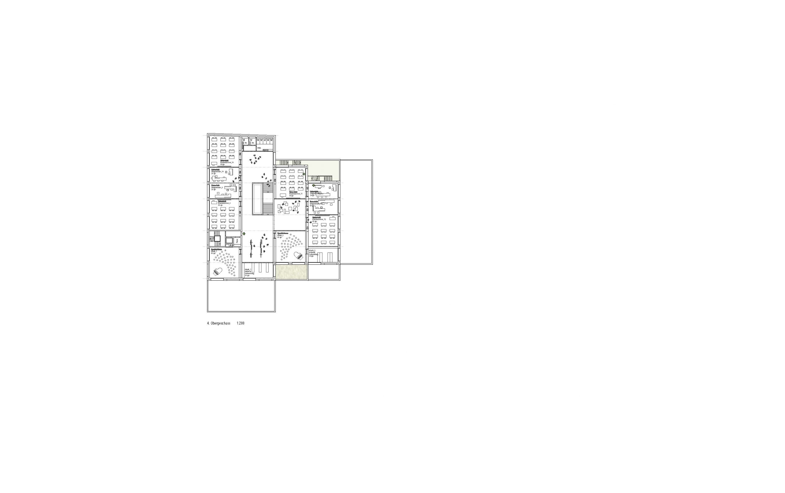 Der Randbereich zur südlichen Nachbarbebauung wird für einen vom restlichen Schülerstrom abgeschirmten Aussenraum genutzt. Abseits vom restlichen Schulbetrieb – dafür mit Quartierbezug – liegt die Schülerbibliothek ebenfalls im Erdgeschoss. Im Hauptgeschoss befinden sich das Förderzentrum, die Infrastrukturräume der Lehrerschaft und die Tagesbetreuung. Eine offene Treppenanlage verbindet die darüber liegenden Geschosse mit den Spezial- und Unterrichtsräumen. Die internen Wege scheinen grosszügig bemessen und bieten eine gute Orientierung im Schulalltag. Die feuerpolizeilichen Anforderungen machen jedoch einen zweiten gesicherten Fluchtweg notwendig. Der von den Verfassern vorgesehene Fluchtweg über die vorgelagerten Terrassen ist eine interessante Idee, wird jedoch so von der Feuerpolizei nicht akzeptiert, da er zu viele Richtungsänderungen aufweist.