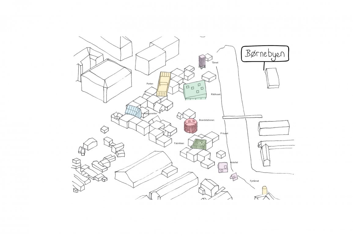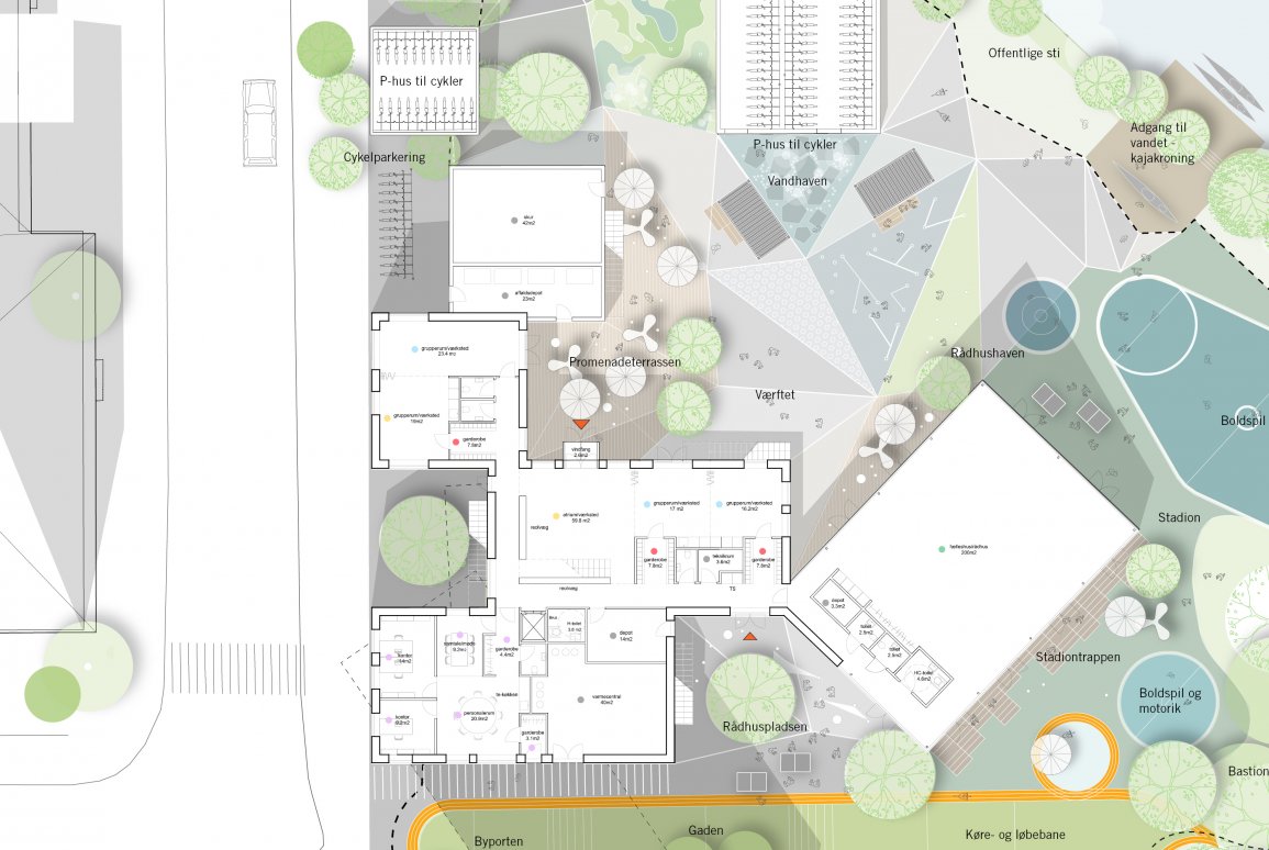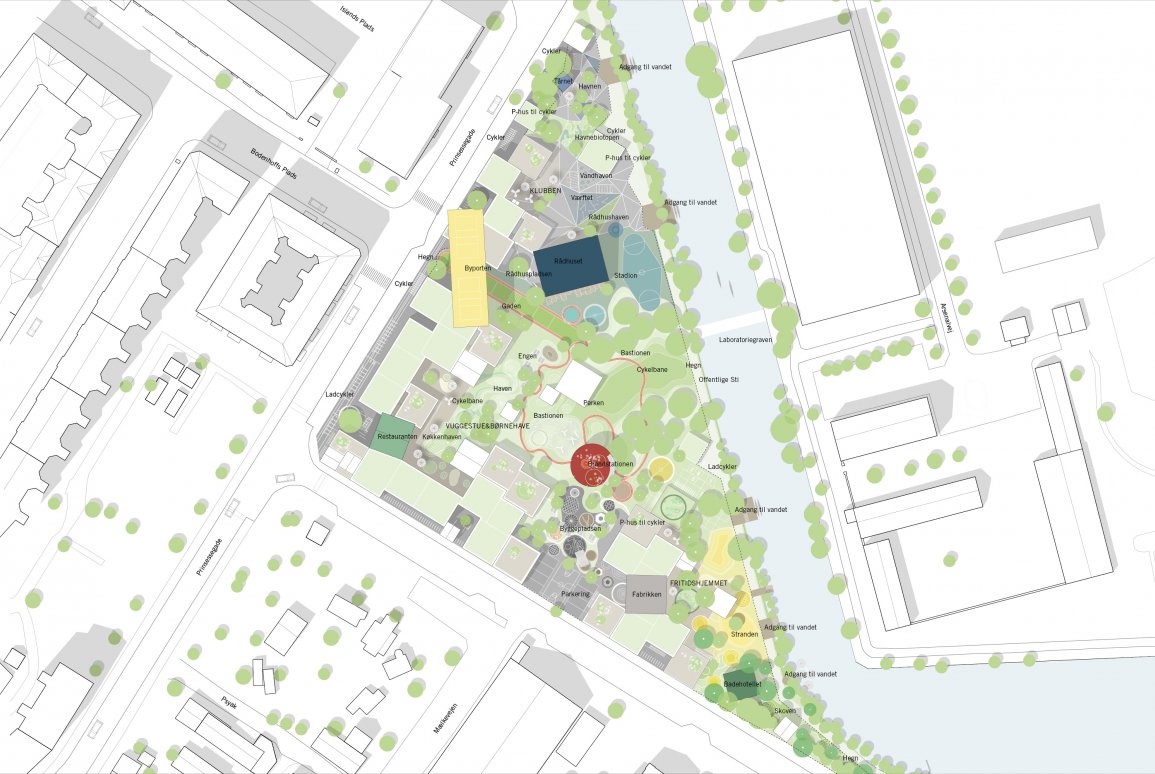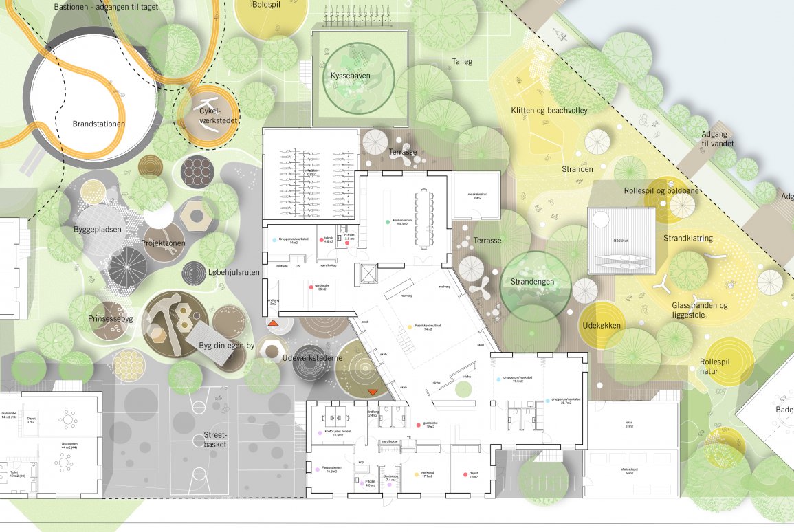 The Kids’ City is planned from a careful analysis of the site’s existing landscape, in order to emphasize and preserve as many of the present qualities as possible. The buildings are placed in such a way that the largest trees and most important landscape elements are preserved and incorporated into a large, green shared outside area – the heart of the Kids’ City. In addition to this, many new landscape elements, such as the city hall square and the beach, add diversity to the site’s existing qualities and allow many new outdoor activities and experiences.