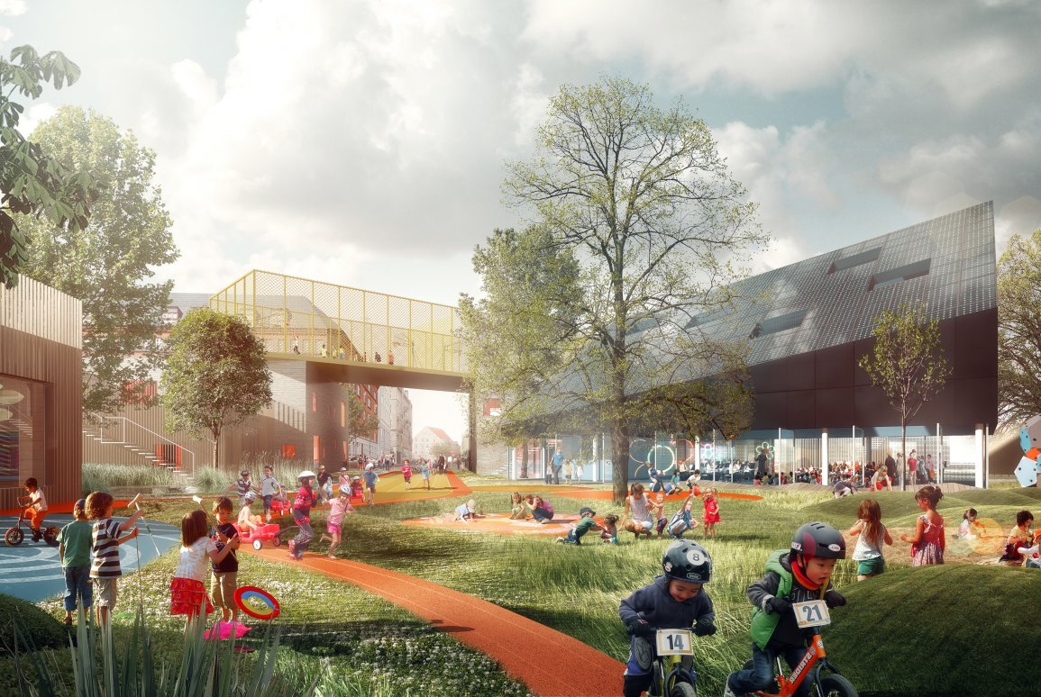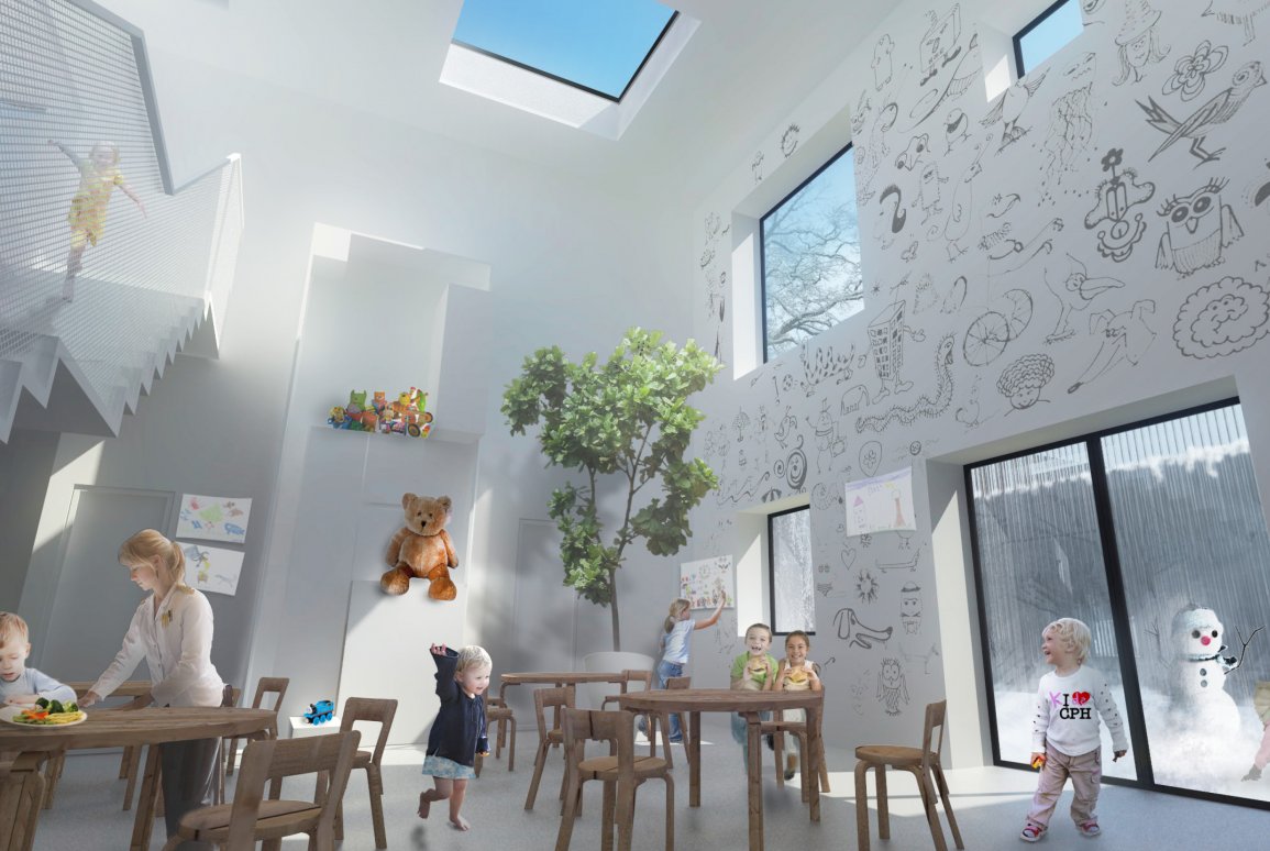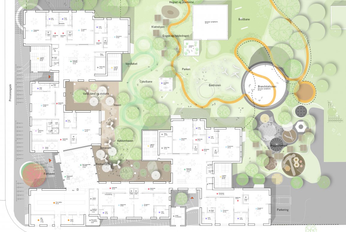 Copenhagen is growing! Projections show that by 2025, there will be up to 90.000 more inhabitants in Copenhagen than today. Of these 90.000 new inhabitants, 33.000 will be 18-29 years and a whopping 22.000 of these will be young people and children between 0 and 18 years! The site – a triangular plot in the Copenhagen borough of Christianshavn, wedged between the rigid urban block structure of Prinsessegade and the homegrown diversity of the Christiania Free Town – has been chosen as the frame of the good everyday life of 618 children and young people between age 0-18. This makes the project the largest daycare center in all of Denmark! It also presents a big challenge – how do we avoid creating a daycare factory when building an institution for so many users?