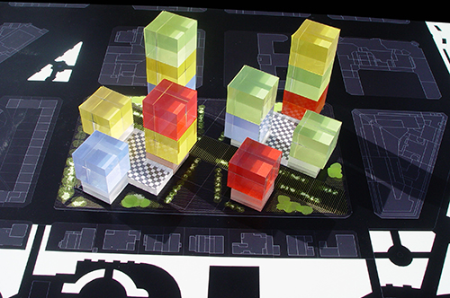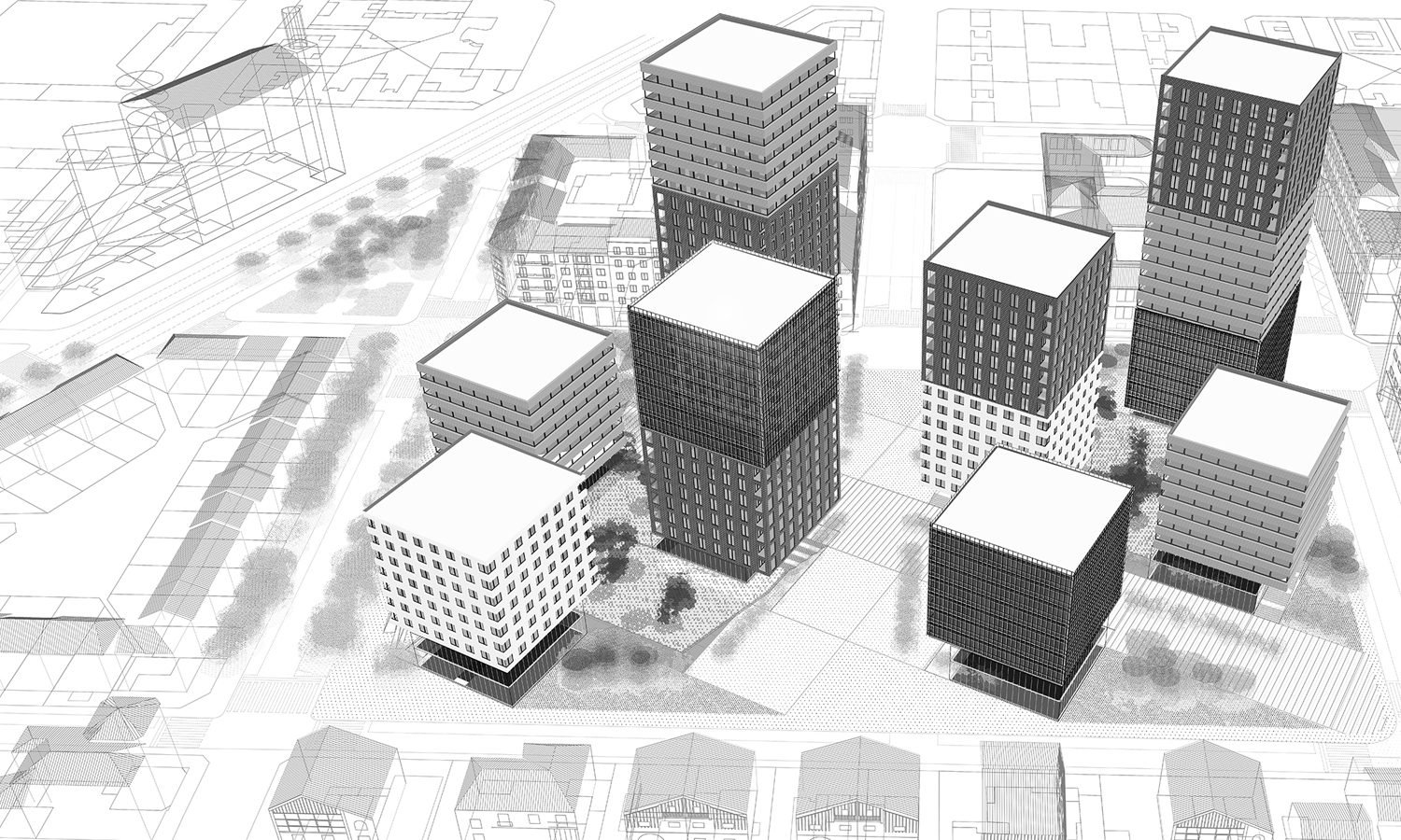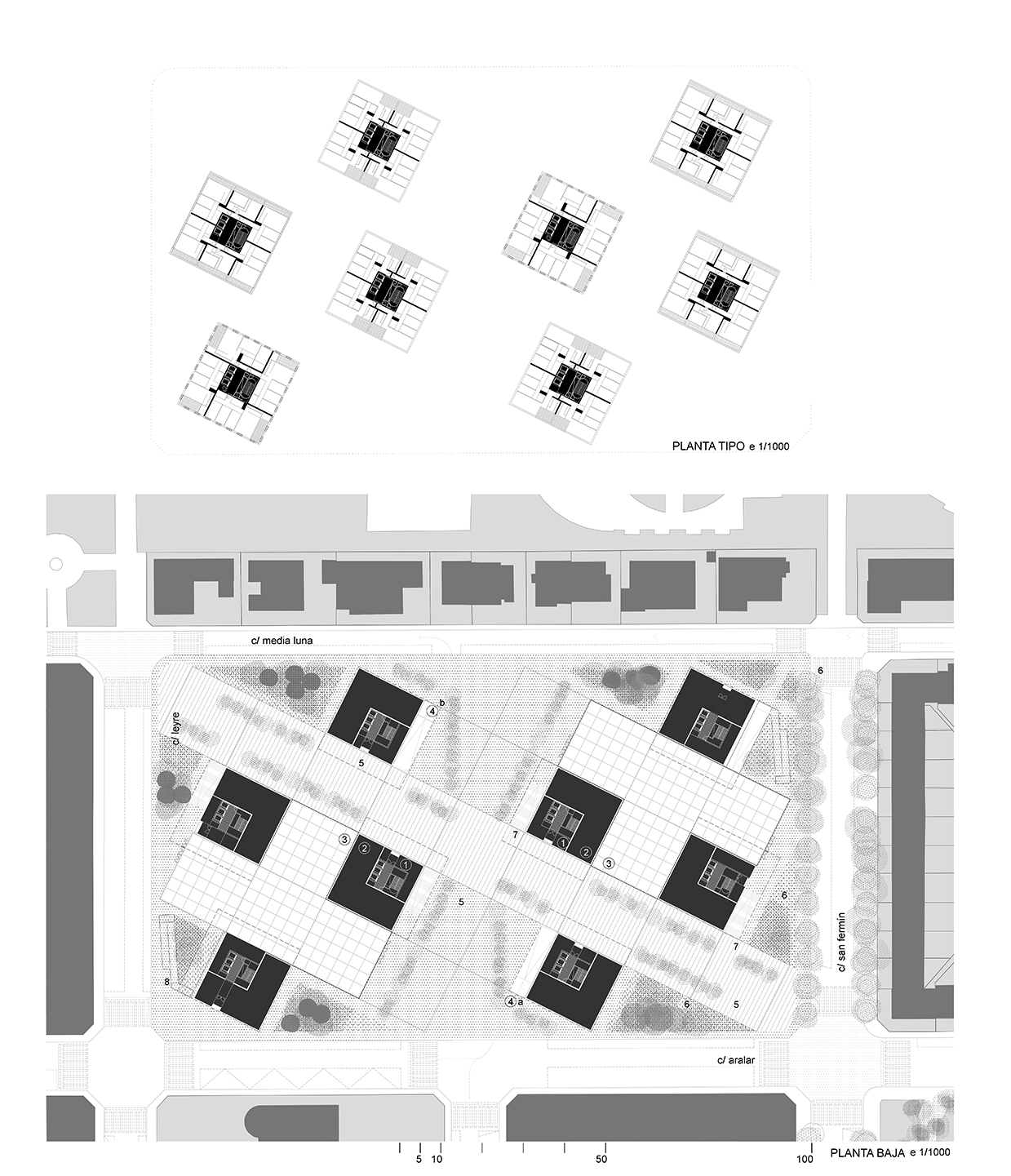 14 unidades_módulo base / 8 bloques_torre de 22,20 x 22,20 m. 2 agrupaciones. Se propone una ordenación abierta con bloques modulares que se apoyan sobre la malla definida. Los módulos base son volúmenes cúbicos (7 plantas) que apoyados sobre el zócalo vuelan en dos de sus caras en un movimiento aparentemente aleatorio, que ordena las relaciones y refuerza las direcciones principales. Cada bloque_torre se conforma a partir de 1, 2 o 3 módulos en un movimiento ascendente hacia el centro y el oeste del área. De manera que en los perímetros norte-este-sur sólo se componen de un módulo, en respeto las preexisetnciasde menor altura. Los 8 bloques torre además de la diagonal San Bartolomé-Baja Navarra, respetan libre el eje de los Teobaldos. La disposición de bloques_torre se completa con dos volúmenes intersticiales a las torres. Se conforman dos zócalos conjuntos que dan frente continuo al bulevar peatonal diagonal en este nuevo trazado urbano. Este zócalo elevado es accesible desde el bulevar diagonal y desde las triangulaciones ajardinadas de los extremos. Un jardín elevado al que vuelcan las plantas altas de terciario y dotacional. Los vuelos de los bloques-torre sobre el bulevar diagonal, la ubicación de accesos a los distintos usos, y los nuevos itinerarios refuerzan el protagonismo del bulevar entre la calle Leyre y la calle San Fermín, entre la Media Luna y el avenida Baja Navarra. La disposición de los bloques se retira de las alienaciones de vialidad oficial ofreciendo triángulos verdes y arbolados en el perímetro. Un escenario de transición entre la cuadrícula del ensanche y las singularidades de su borde.