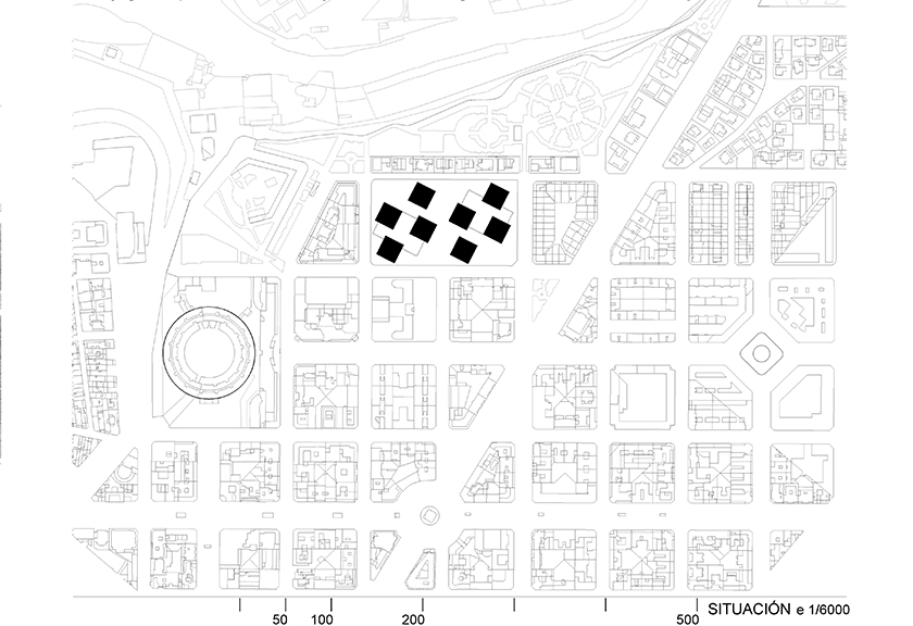 Unos límites heterogéneos: las viviendas unifamilares hacia el NE, una línea de adosados al SE ,manzanas de alturas variables al NO y SO, las parcelas escolares al O… Y, muy próximos, la secuencia de espacios libres que enlazan la plaza de toros, el baluarte de San Bartolomé y el parque de la Media Luna. Las vistas hacia las riberas del Arga y el paisaje lejano entre la gran masa arbolada que domina la terraza-mirador del parque. Y por otro lado la Iglesia de San Francisco Javier y el triángulo arbolado que ofrece la avenida de Baja Navarra con su trazado diagonal a la trama de ensanche. Y el eje de la calle de los Teobaldos, que intersecta en las Merindades con Carlos III,eje principal del ensanche. La propuesta recoge todas estas influencias, sus conexiones, las visuales y la volumetría edificada de los perímetros y ofrece una solución abierta. El objetivo es abrir nuevos itinerarios, facilitar las conexiones en el borde la trama, y adecuar los espacios libres resultantes en su relación tanto con la edificación existente como con los nuevos vólumnes propuestos y generar una continuidad urbana desde los espacios libres de la cornisa hacia las avenidas interiores.