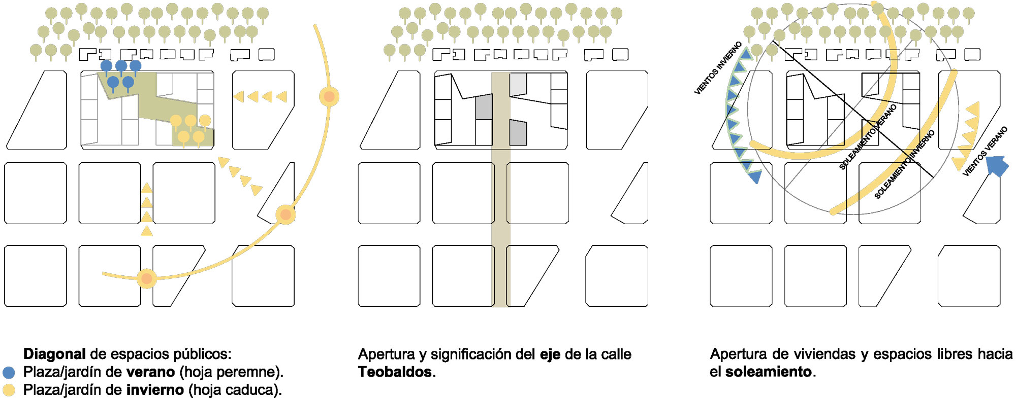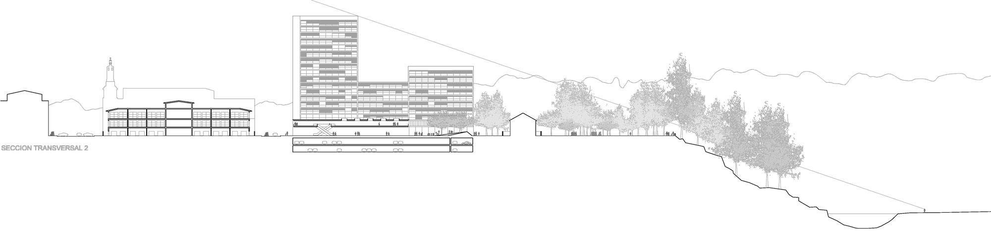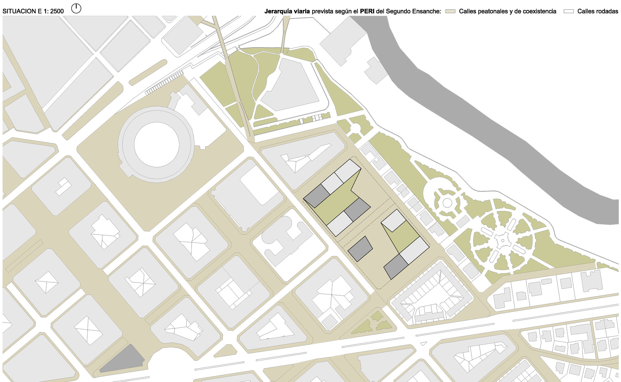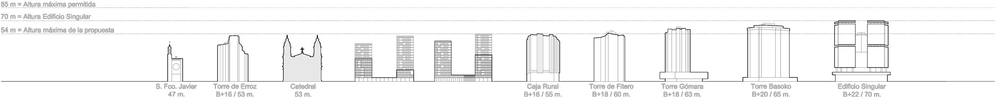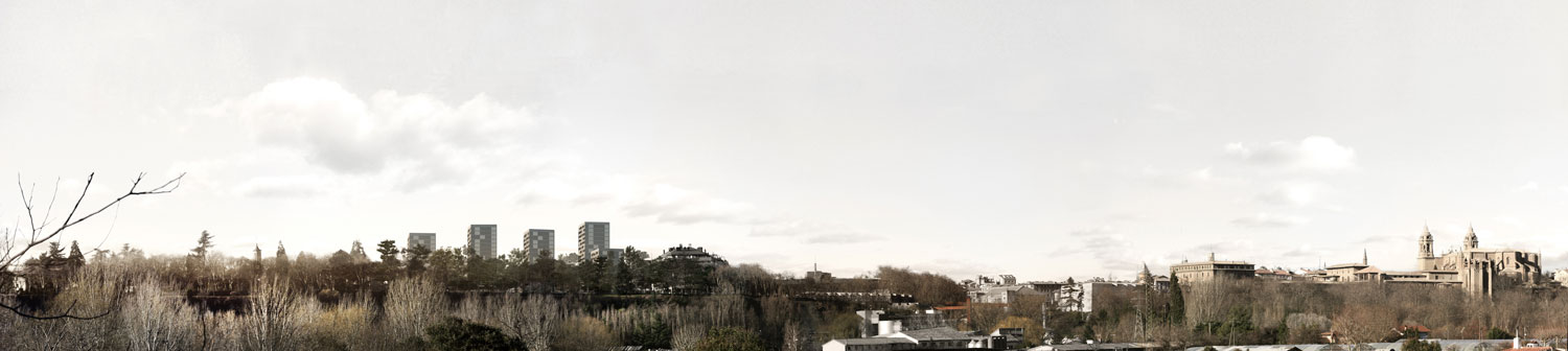 Partiendo de esta premisa, el diseño propuesto refuerza y enlaza los recorridos peatonales existentes y los futuros previstos en el PERI del Ensanche tanto como descubre nuevas conexiones que abren la ciudad hacia el parque. Una diagonal de espacios públicos, perpendicular a la Avenida de la Baja Navarra descubre un nuevo camino peatonal abierto al sur, desde la citada avenida hasta el paseo de la Media Luna, a través de la cual se pretende articular un espacio público de calidad que refuerce la condición de nueva centralidad del lugar, apoyada en una adecuada orientación y en las dotaciones propuestas, que ayudarán a definir un lugar de encuentro atractivo para el conjunto de los ciudadanos. El proyecto, sensible con el entorno inmediato de la parcela y también con la escala comarcal, establece un gradiente de alturas decreciente en su aproximación a la calle de la Medialuna (de residencial unifamiliar), y al borde de la meseta en el que se sitúa el parque del mismo nombre, con el objetivo respetar el carácter peatonal y de baja densidad de la calle, y de incorporar de una manera sutil y pautada la silueta de sus torres al perfil de la cornisa norte de la ciudad.