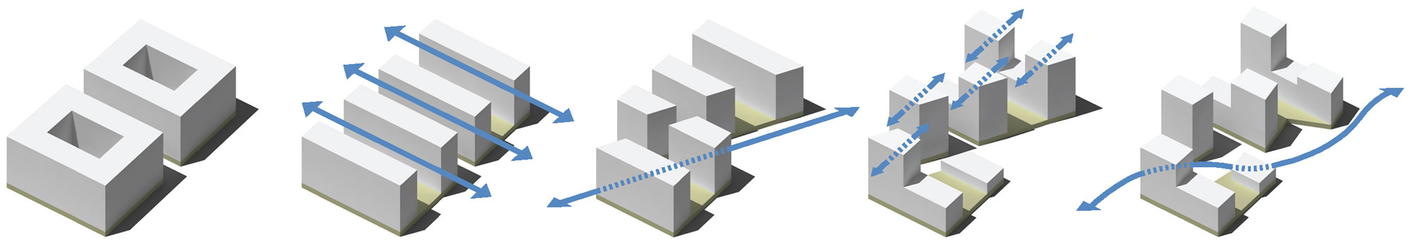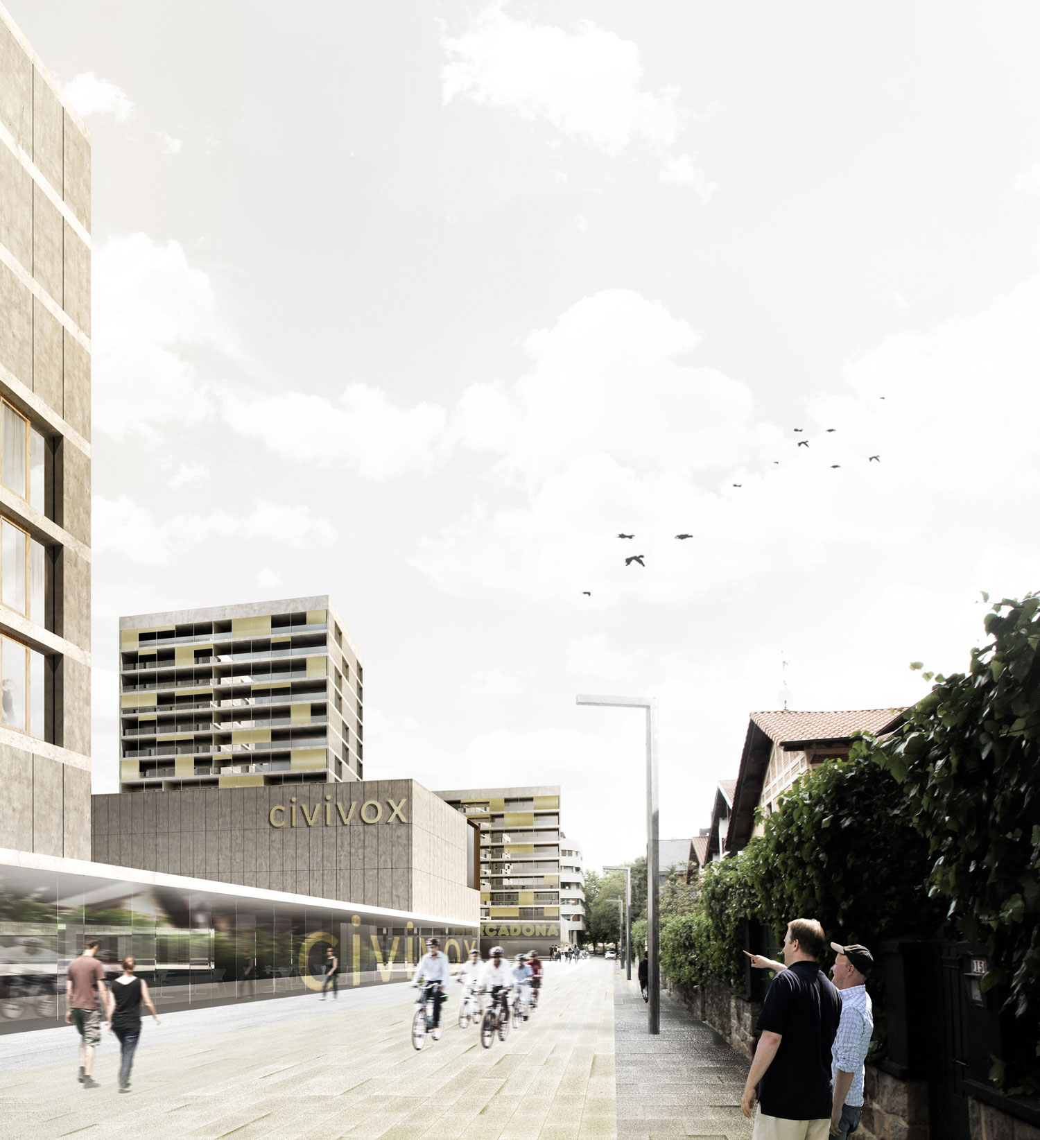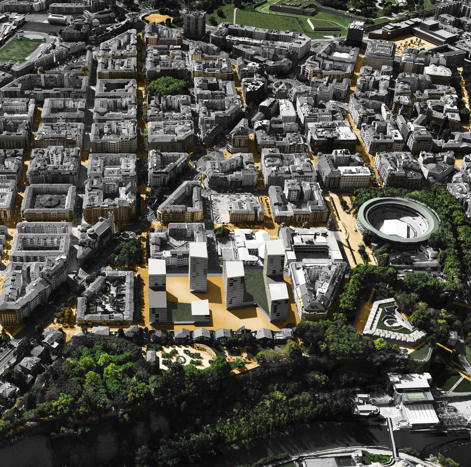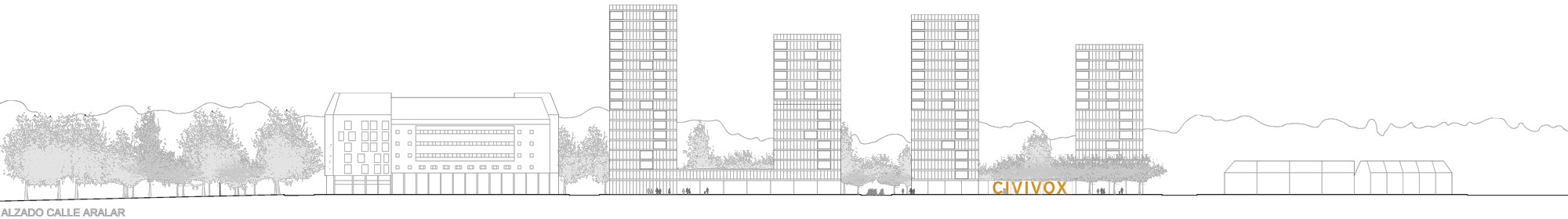 Partiendo de esta premisa, el diseño propuesto refuerza y enlaza los recorridos peatonales existentes y los futuros previstos en el PERI del Ensanche tanto como descubre nuevas conexiones que abren la ciudad hacia el parque. Una diagonal de espacios públicos, perpendicular a la Avenida de la Baja Navarra descubre un nuevo camino peatonal abierto al sur, desde la citada avenida hasta el paseo de la Media Luna, a través de la cual se pretende articular un espacio público de calidad que refuerce la condición de nueva centralidad del lugar, apoyada en una adecuada orientación y en las dotaciones propuestas, que ayudarán a definir un lugar de encuentro atractivo para el conjunto de los ciudadanos. El proyecto, sensible con el entorno inmediato de la parcela y también con la escala comarcal, establece un gradiente de alturas decreciente en su aproximación a la calle de la Medialuna (de residencial unifamiliar), y al borde de la meseta en el que se sitúa el parque del mismo nombre, con el objetivo respetar el carácter peatonal y de baja densidad de la calle, y de incorporar de una manera sutil y pautada la silueta de sus torres al perfil de la cornisa norte de la ciudad.
