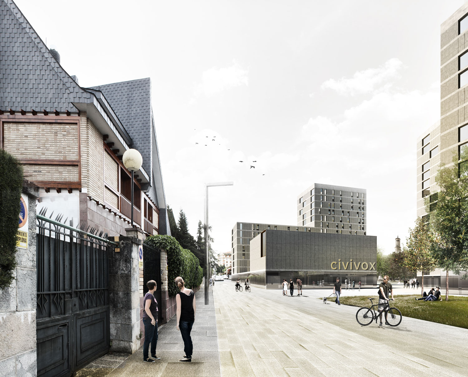 El proyecto de ordenación del ámbito del PSIS de Salesianos propone intervenir dentro de la ciudad consolidada, en el caracterizado borde noreste de la meseta sobre la que se asienta Pamplona, en el llamado “segundo ensanche”, con el objetivo de sustituir el uso docente del Centro Educativo Salesianos en favor de un programa de espacio público, viviendas, comercio y centro cívico que recupere dicho ámbito para la actividad urbana. Se pretende una ciudad razonablemente densa en tanto que densidad implica eficiencia y urbanidad. Una densidad que convierte la ciudad en más sostenible, frente a los modelos de dispersión que el tiempo ha revelado como poco eficientes. El proyecto estimula, asimismo, la singularidad de los eventos urbanos, la diversidad dentro la ciudad uniforme frente a los estándares de origen decimonónico que rigen el trazado pamplonés. Mas allá de la consideración de “la manzana del ensanche” como un elemento más o menos autónomo y actualizable que pueda venir a completar la expansión de la ciudad consolidada en este ámbito a través de la repetición acrítica del patrón preestablecido, la propuesta explora la condición de “límite de la ciudad” del lugar, y busca una solución sensible y permeable, que refuerce la relación entre la ciudad y el magnífico perímetro de espacios libres y recorridos peatonales que caracterizan el borde de la meseta sobre la cuenca de Pamplona.