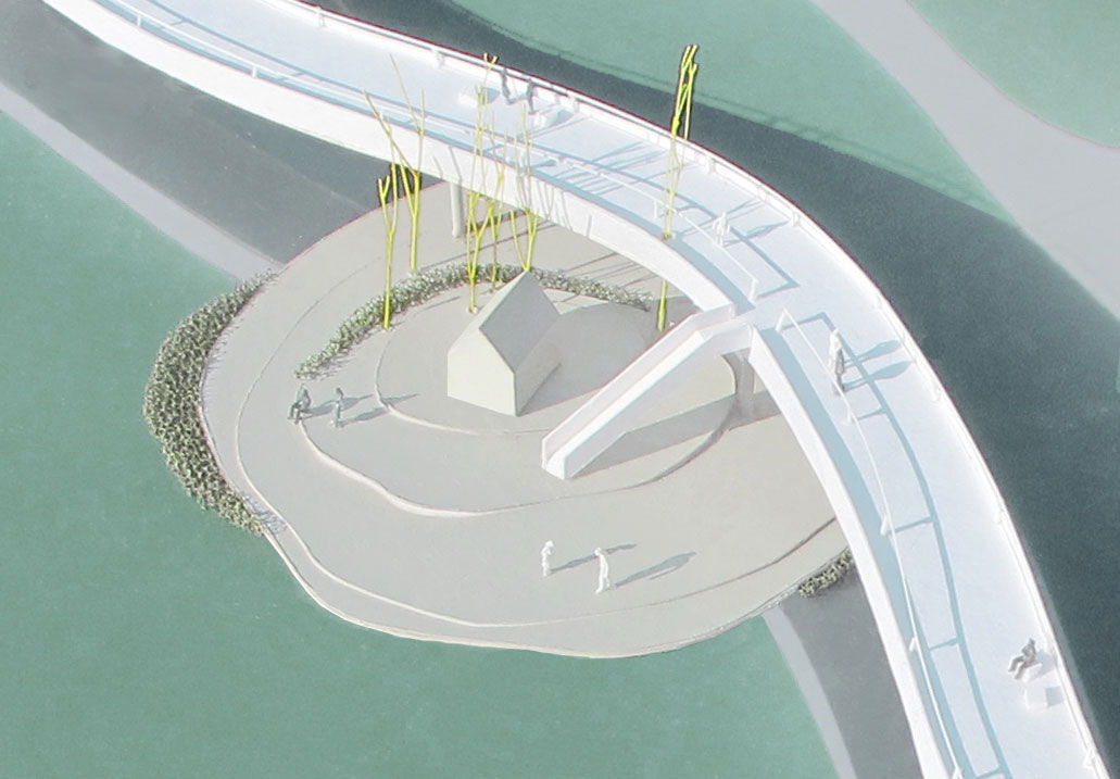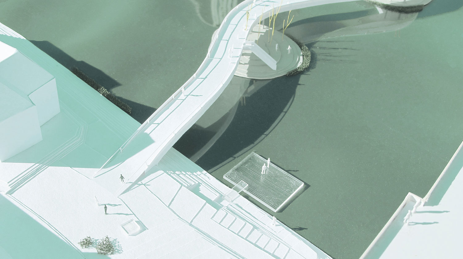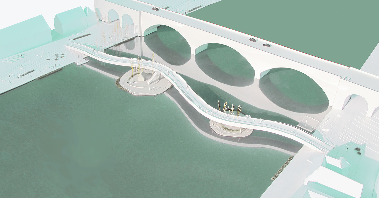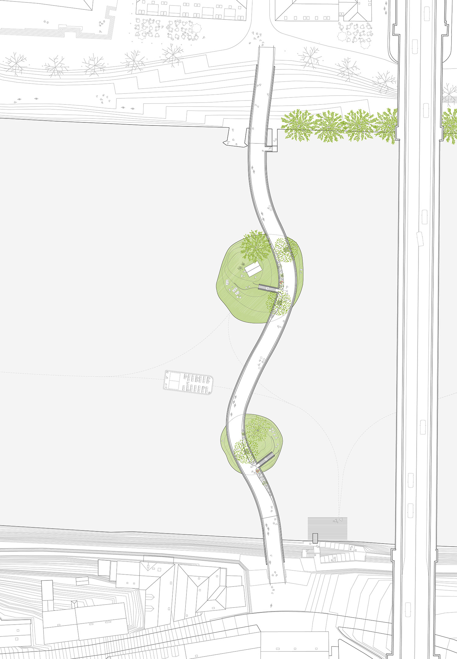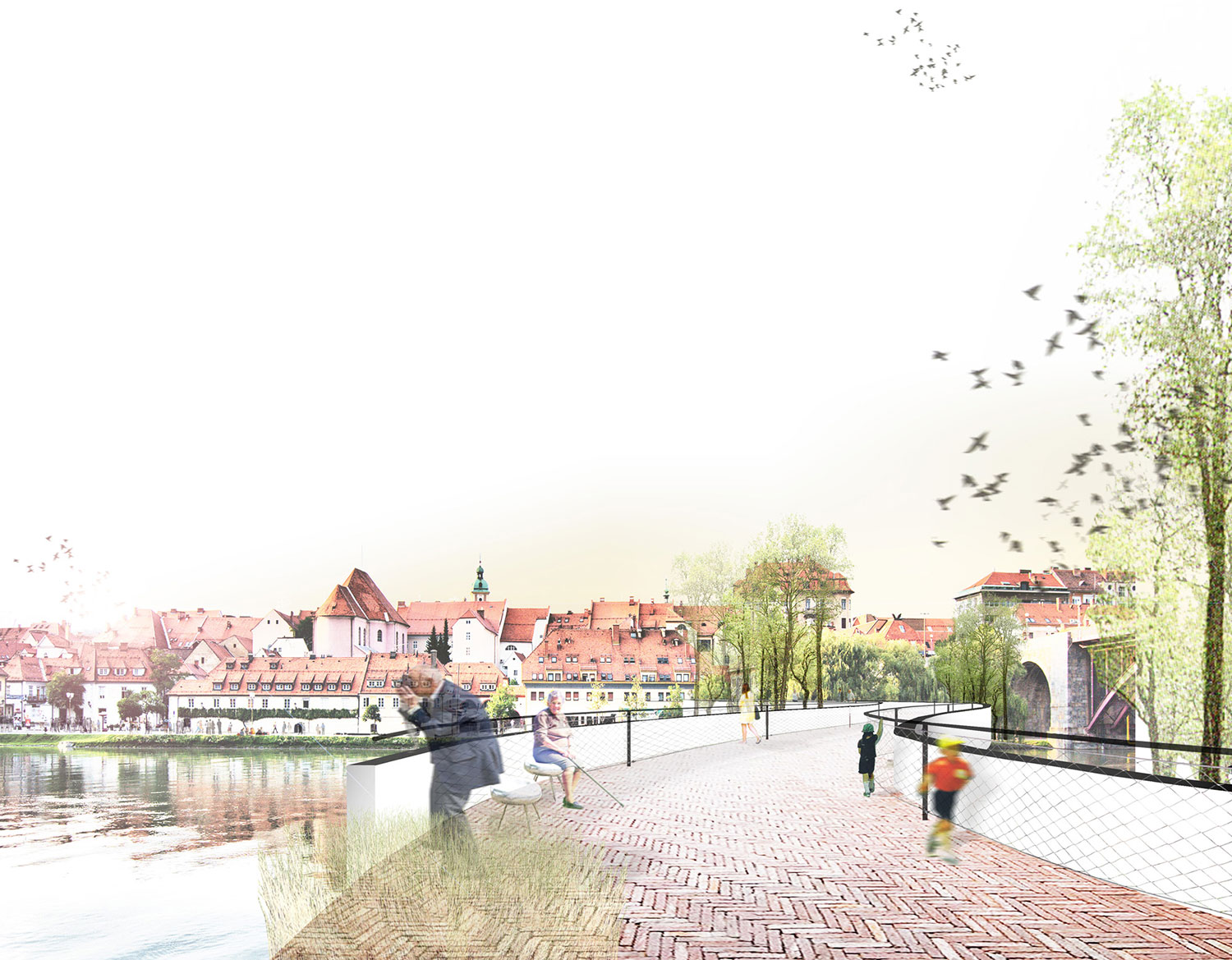 Las márgenes del río Drava serán producto de una futura remodelación en forma de corredor verde. El nexo de unión entre los barrios de Lent y Tabor es ahora un antiguo puente monopolizado por la circulación viaria. Se hace necesario un camino para la gente. Los coches van en línea recta, la gente no. La idea de paseo, de camino tradicional se une a la de extensión de los parques de las márgenes: que el verde invada el río. A pie o en bicicleta se puede seguir un recorrido que propone además la parada, el descanso a mitad de camino. El parque ha pasado al rio en forma de islas, los pilares de soporte del puente son ahora un lugar para quedarse. Así el camino de la gente, con su forma sinuosa, se desarrolla a la sombra del camino de los coches: se separa para convertirse literalmente en su reflejo. En reflejo de la ciudad se convierte también la escultura de una casa impracticable en una de las islas, ironía de las formas tradicionales que invaden el entorno. El puente, por definición una construcción que debe permitir el paso a través de un accidente geográfico, intenta esta vez convertirse en estancia más que en paso.