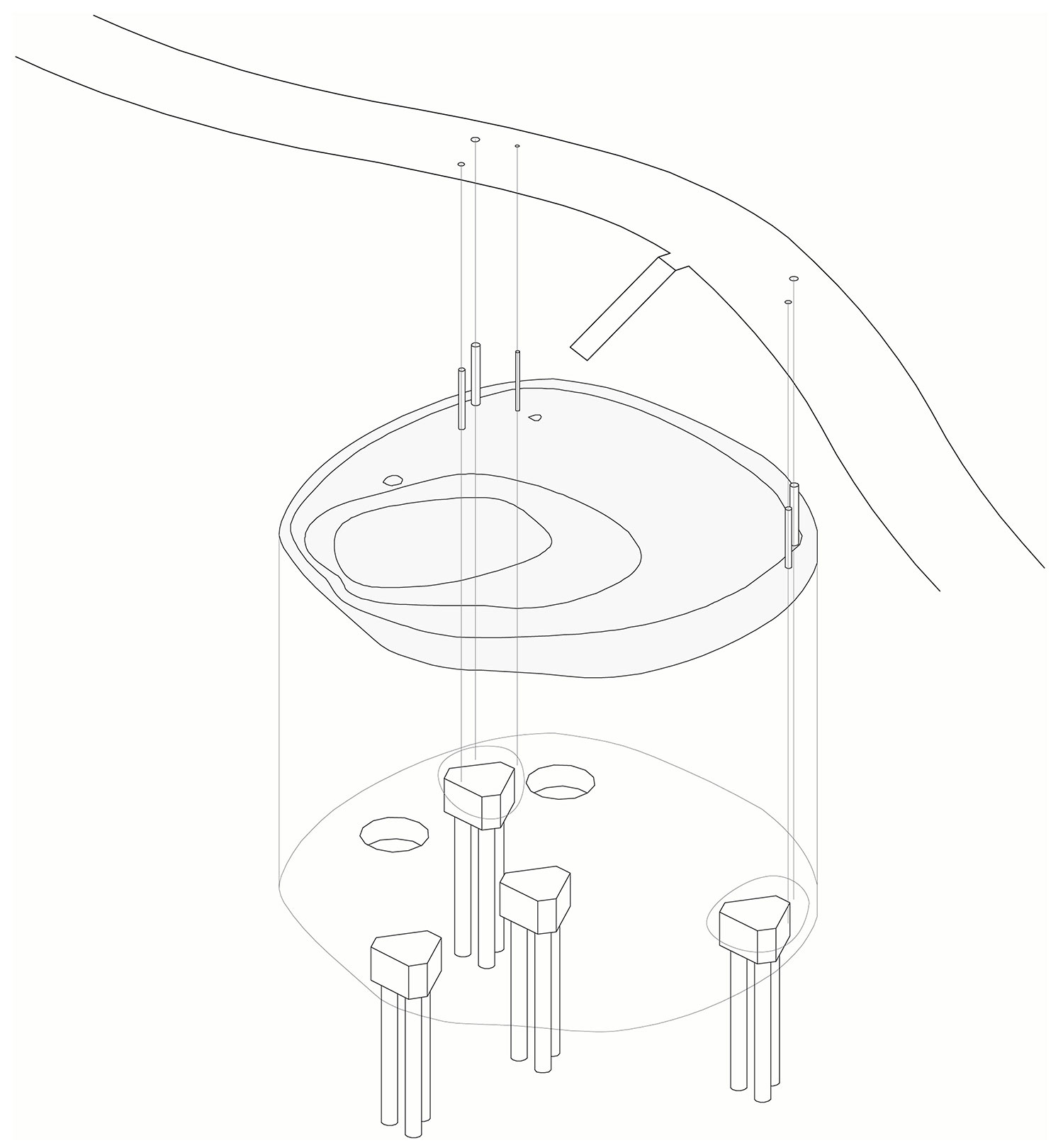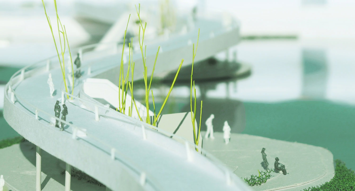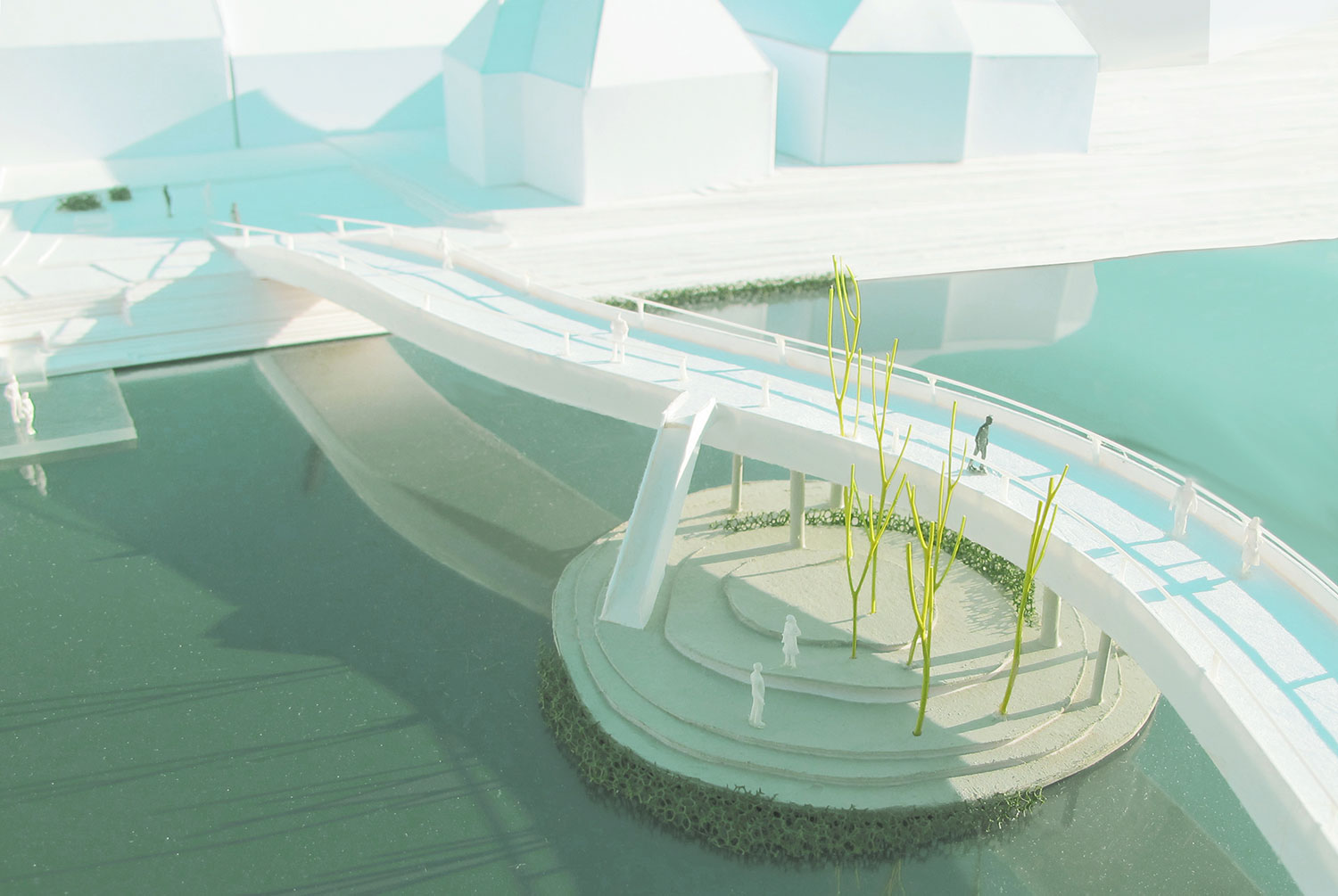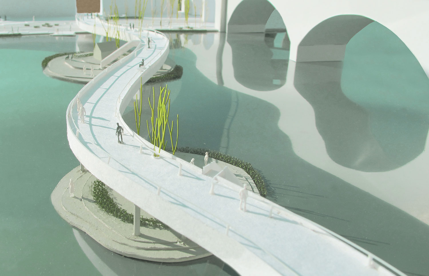 Las márgenes del río Drava serán producto de una futura remodelación en forma de corredor verde. El nexo de unión entre los barrios de Lent y Tabor es ahora un antiguo puente monopolizado por la circulación viaria. Se hace necesario un camino para la gente. Los coches van en línea recta, la gente no. La idea de paseo, de camino tradicional se une a la de extensión de los parques de las márgenes: que el verde invada el río. A pie o en bicicleta se puede seguir un recorrido que propone además la parada, el descanso a mitad de camino. El parque ha pasado al rio en forma de islas, los pilares de soporte del puente son ahora un lugar para quedarse. Así el camino de la gente, con su forma sinuosa, se desarrolla a la sombra del camino de los coches: se separa para convertirse literalmente en su reflejo. En reflejo de la ciudad se convierte también la escultura de una casa impracticable en una de las islas, ironía de las formas tradicionales que invaden el entorno. El puente, por definición una construcción que debe permitir el paso a través de un accidente geográfico, intenta esta vez convertirse en estancia más que en paso.