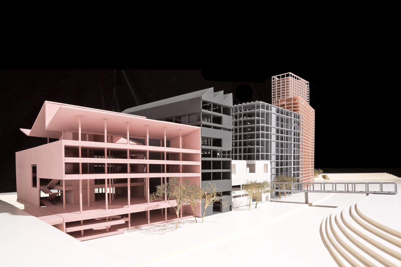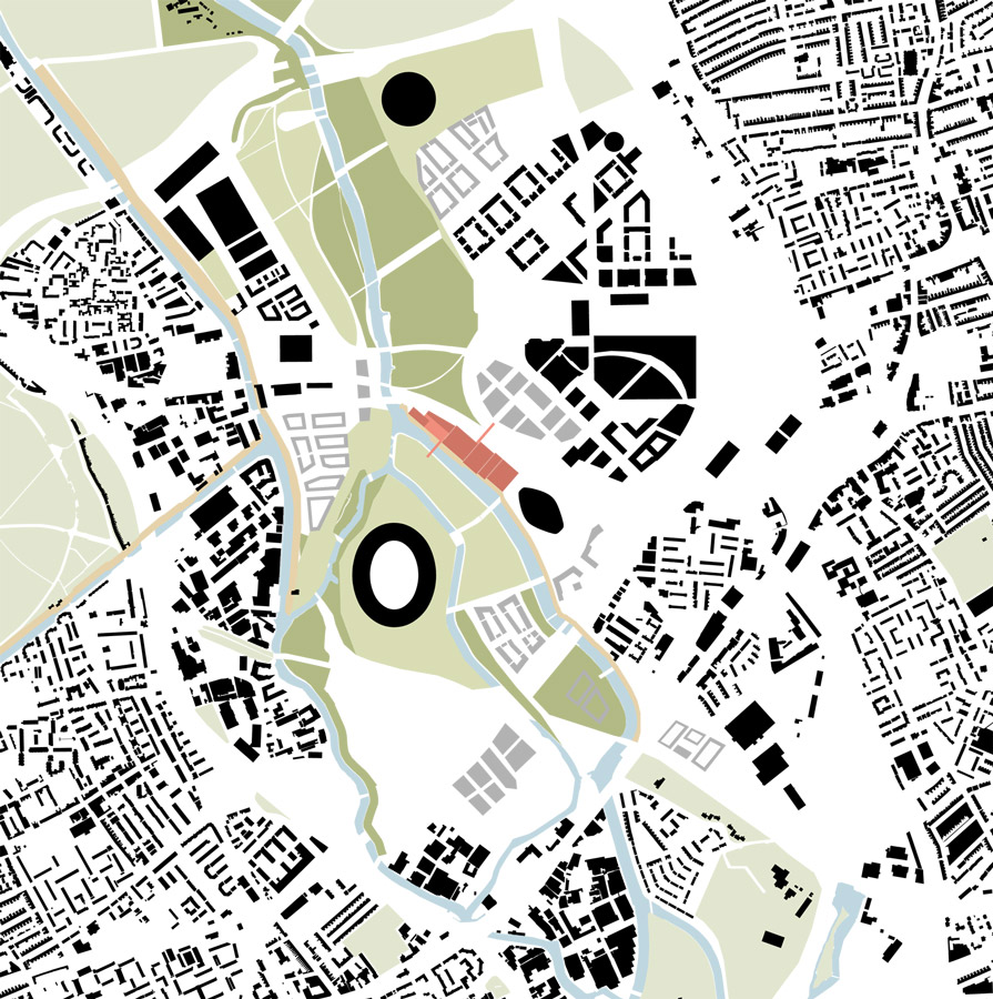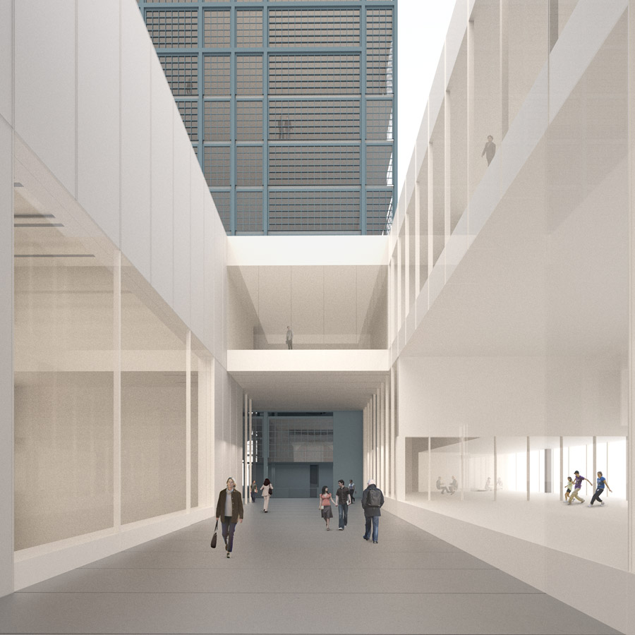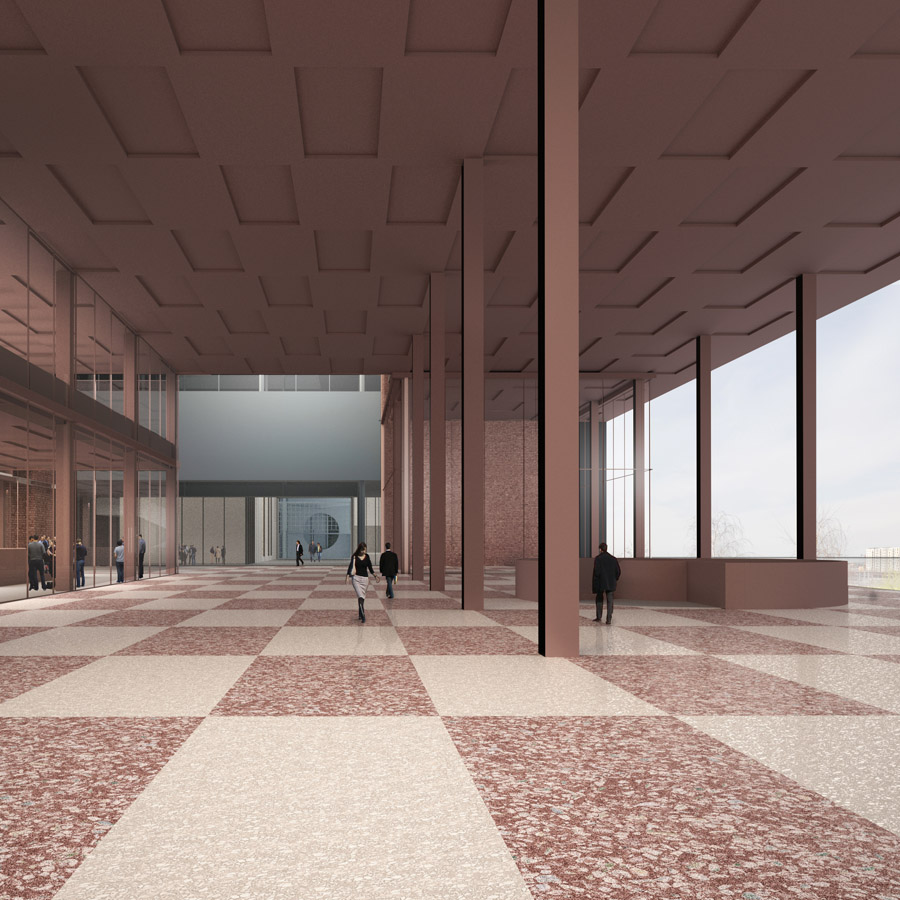 The Lea Valley has historically been defined by the interplay between nature and industry and the landscape around the ‘island’ site is a scene of competing infrastructures and multiple ground planes. Two new bridges therefore play a fundamental role in our proposal by connecting the wider context to a dominant singular plane – a common ground – that runs throughout the site providing access routes for visitors, commuters and residents. The proposal encourages the institutions to harness the productive creativity of East London with spaces that foster experimentation and interaction. Although the volume and materiality of each building is driven by its own architectural idea, they each share a party wall which unifies the programmatic diversity of the complex and maximises footprints. To assist the merging of public space with institutional activity, the organisation and internal courtyard spaces of the buildings generates a rich variety of interconnected public and semi-public spaces.