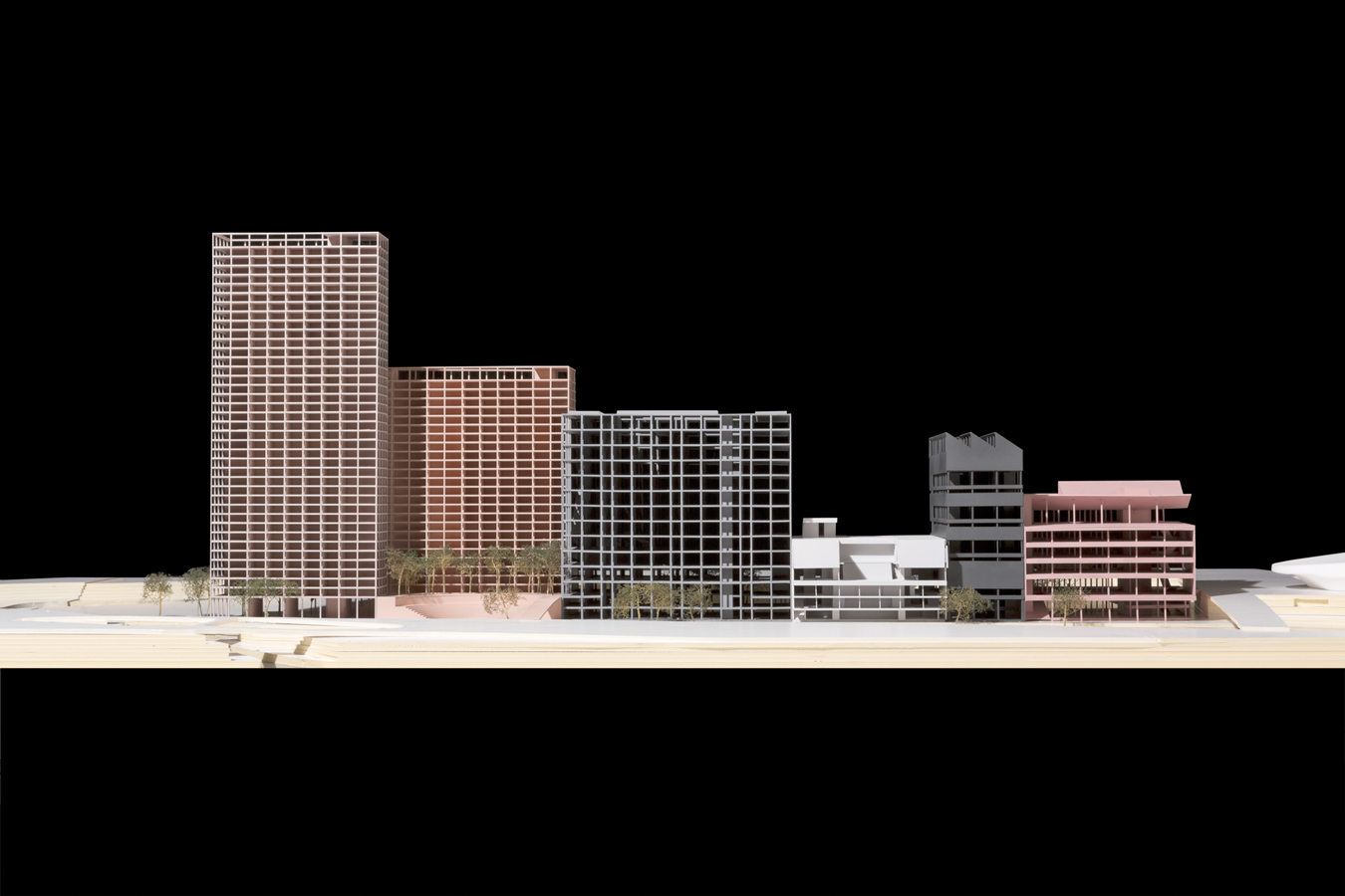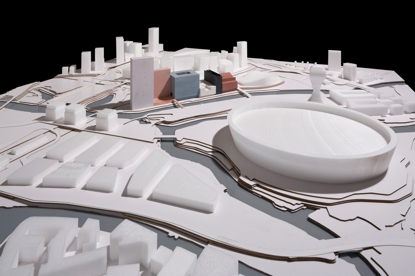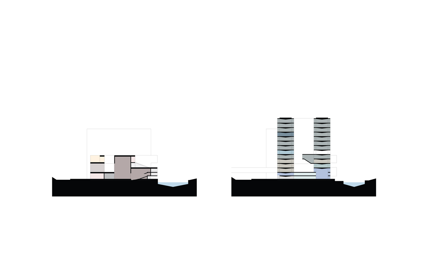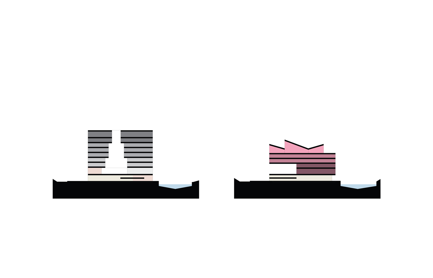 The Lea Valley has historically been defined by the interplay between nature and industry and the landscape around the ‘island’ site is a scene of competing infrastructures and multiple ground planes. Two new bridges therefore play a fundamental role in our proposal by connecting the wider context to a dominant singular plane – a common ground – that runs throughout the site providing access routes for visitors, commuters and residents. The proposal encourages the institutions to harness the productive creativity of East London with spaces that foster experimentation and interaction. Although the volume and materiality of each building is driven by its own architectural idea, they each share a party wall which unifies the programmatic diversity of the complex and maximises footprints. To assist the merging of public space with institutional activity, the organisation and internal courtyard spaces of the buildings generates a rich variety of interconnected public and semi-public spaces.