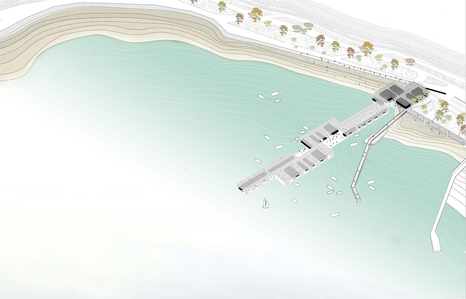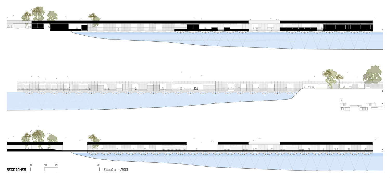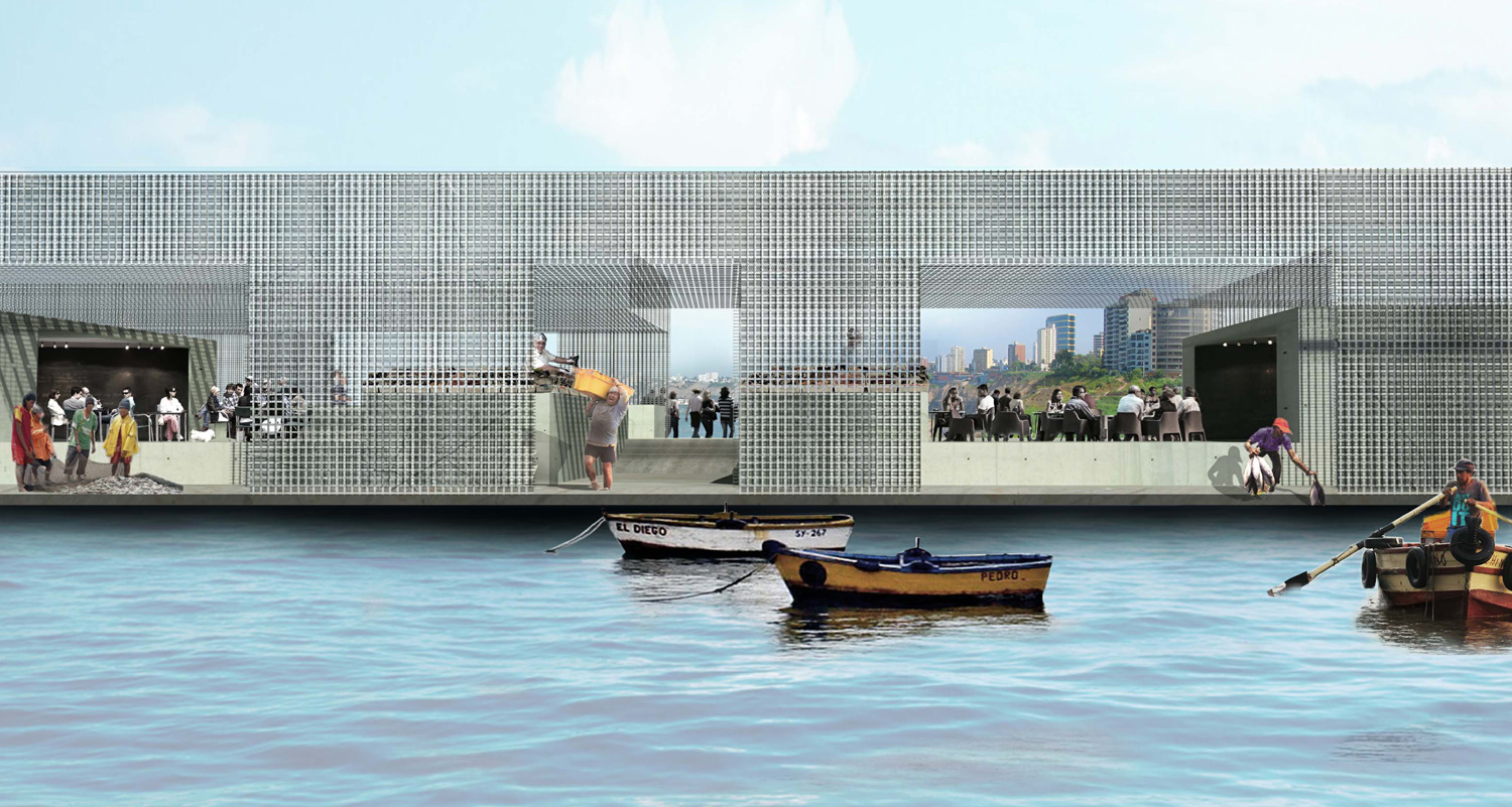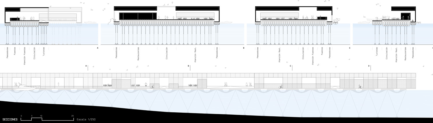 Proponemos la reordenación y ampliación de la Playa de Pescadores insertando un nuevo muelle con un programa de uso que sirva de conexión entre el malecón y la playa; intensificando la relación entre mar y ciudad. Renunciamos a la arquitectura monumental; potenciamos una arquitectura sin exteriores donde las fachadas pierdan su condición de frontera al ser simultáneamente superficies activas de relaciones visuales. La circulación propuesta permite dar forma al espacio, una gran calle con sombra por la que se distribuyen turistas, pescadores y restaurantes generando un campo de movimientos de los diferentes usuarios a través de restaurantes, puestos de mariscos y pescadores, zonas de ocio y descanso así como áreas para la descarga de productos del mar. Surge así un gran espacio enlazado a través de un suelo continuo que va conectando tres cotas diferentes, el malecón, la playa y la cota del nuevo muelle, permitiendo así relaciones de máxima proximidad, del mar a la mesa.