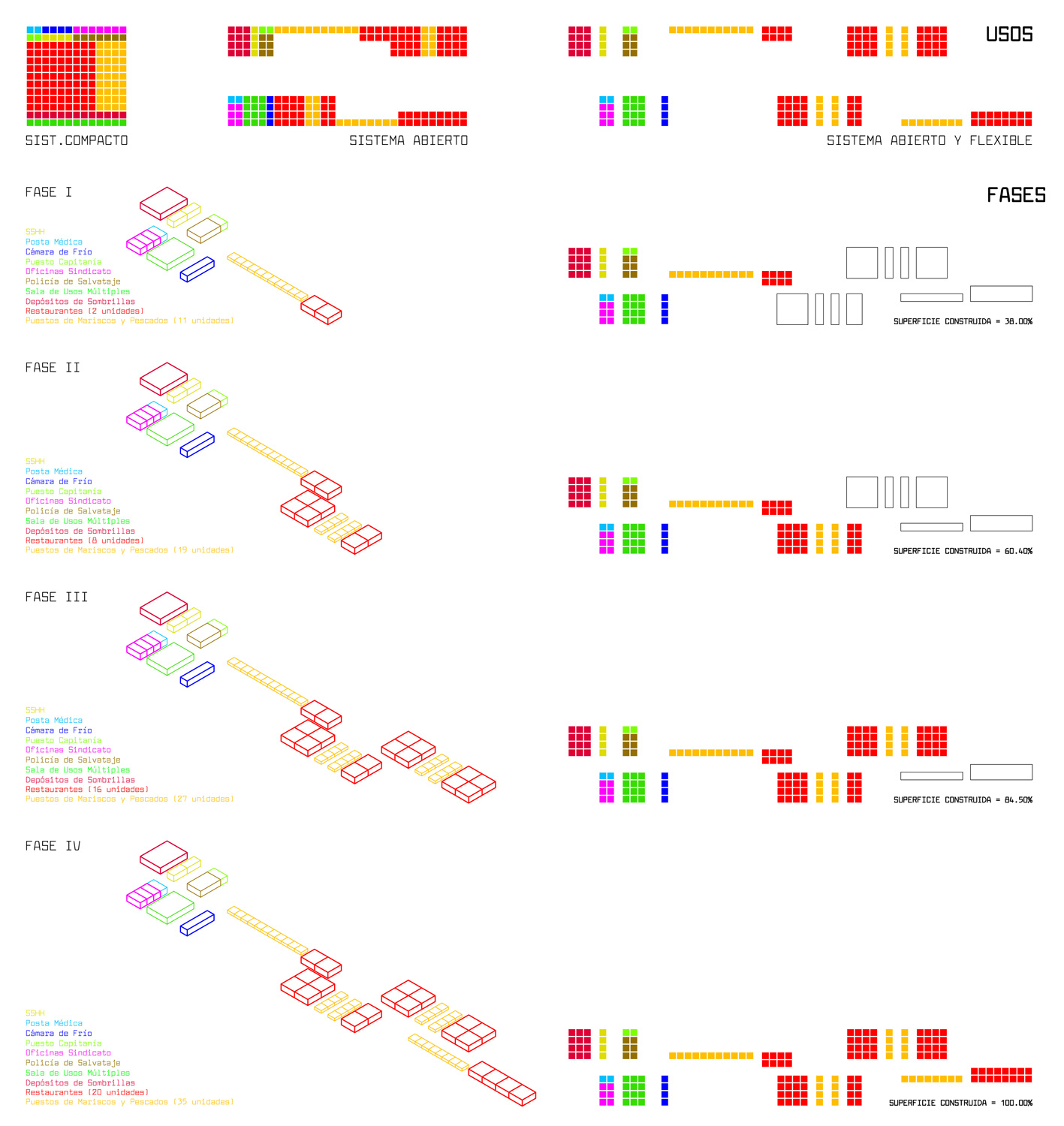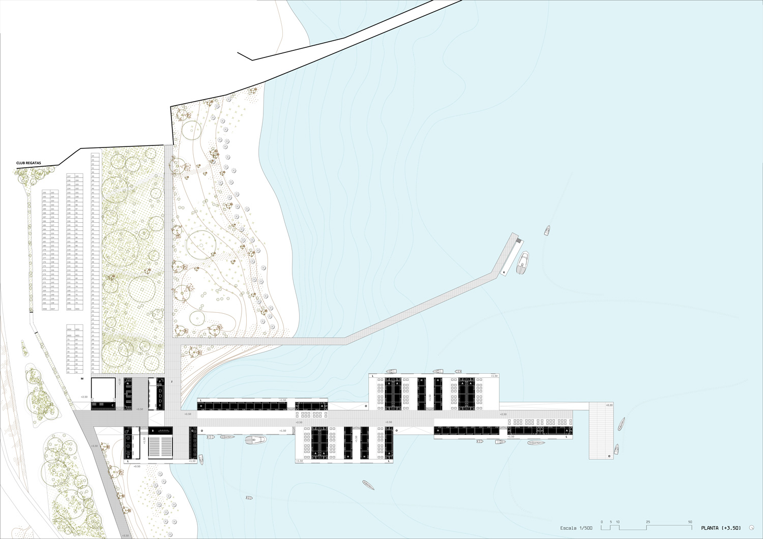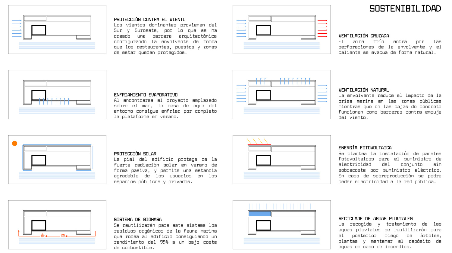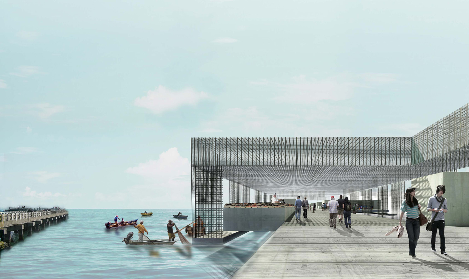 Proponemos la reordenación y ampliación de la Playa de Pescadores insertando un nuevo muelle con un programa de uso que sirva de conexión entre el malecón y la playa; intensificando la relación entre mar y ciudad. Renunciamos a la arquitectura monumental; potenciamos una arquitectura sin exteriores donde las fachadas pierdan su condición de frontera al ser simultáneamente superficies activas de relaciones visuales. La circulación propuesta permite dar forma al espacio, una gran calle con sombra por la que se distribuyen turistas, pescadores y restaurantes generando un campo de movimientos de los diferentes usuarios a través de restaurantes, puestos de mariscos y pescadores, zonas de ocio y descanso así como áreas para la descarga de productos del mar. Surge así un gran espacio enlazado a través de un suelo continuo que va conectando tres cotas diferentes, el malecón, la playa y la cota del nuevo muelle, permitiendo así relaciones de máxima proximidad, del mar a la mesa.