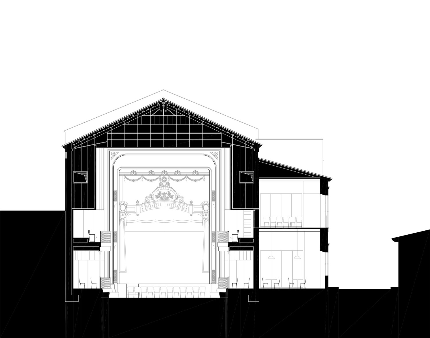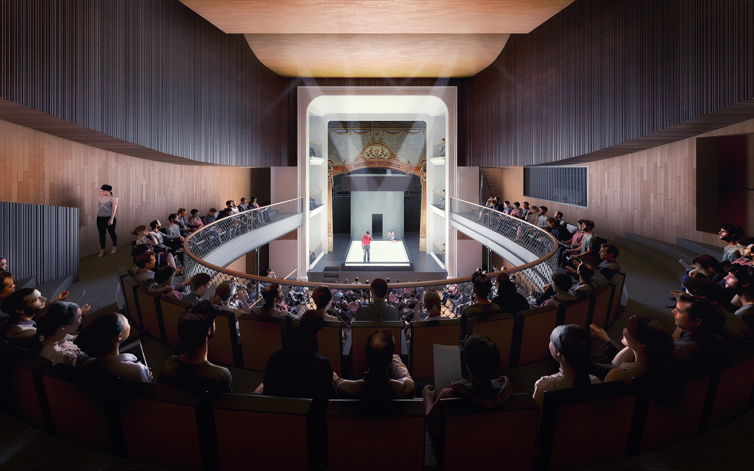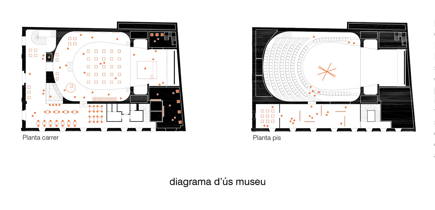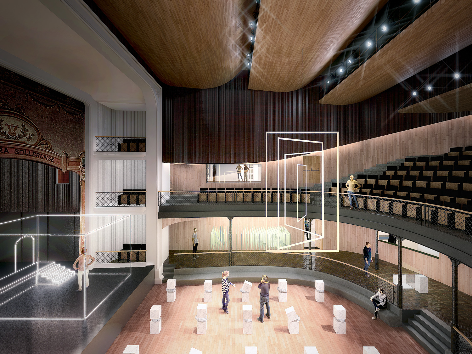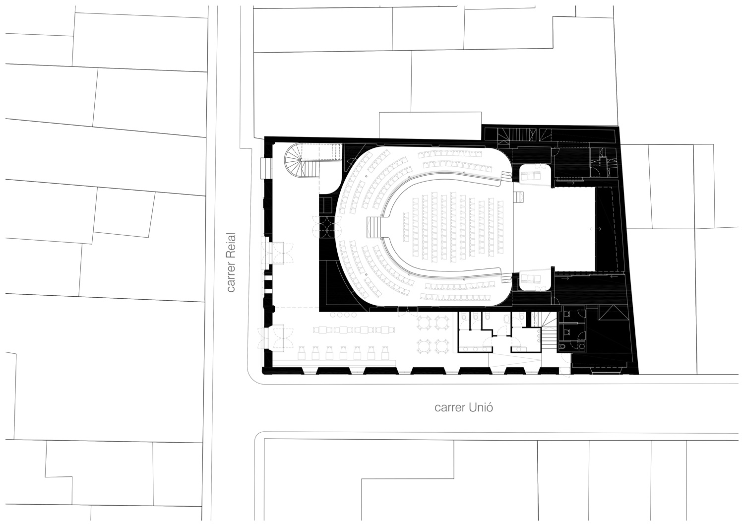 Les actuacions es centren a l’interior de l’edifici, mentre que a l’exterior es realitzaran treballs de restauració de façanes i finestres. A la planta baixa del c. Unió, per donar accés a l’escenari, s’amplia una obertura seguint el llenguatge de la façana. L’interior de l’edifici es transforma i adequa a les noves necessitats multifuncionals gracies a la integració de la nova caixa “box-in-box”. Aquesta caixa acabada, principalment, amb panells acústics de fusta marca el punt de trobada entre l’edifici existent i la integració d’un nou element vertebrador dins l’edifici. Aquesta nova caixa conté tots els elements patrimonials restaurats: el frontis i teló de l’escenari, les columnes de fossa i les baranes que determinen la forma de ferradura de l’espai de la sala principal. Els elements patrimonials existents rememoren els d’una sala de la tipologia d’opereta italiana amb amfiteatre i llotges. Per aquest motiu, per tal de emfatitzar els elements a conservar s’opta pel disseny de la sala principal inspirat en l’estructura tradicional d’una opereta italiana i es reforça el concepte de forma de ferradura de l’espai interior (a més aquesta forma millora el comportament acústic de la sala).