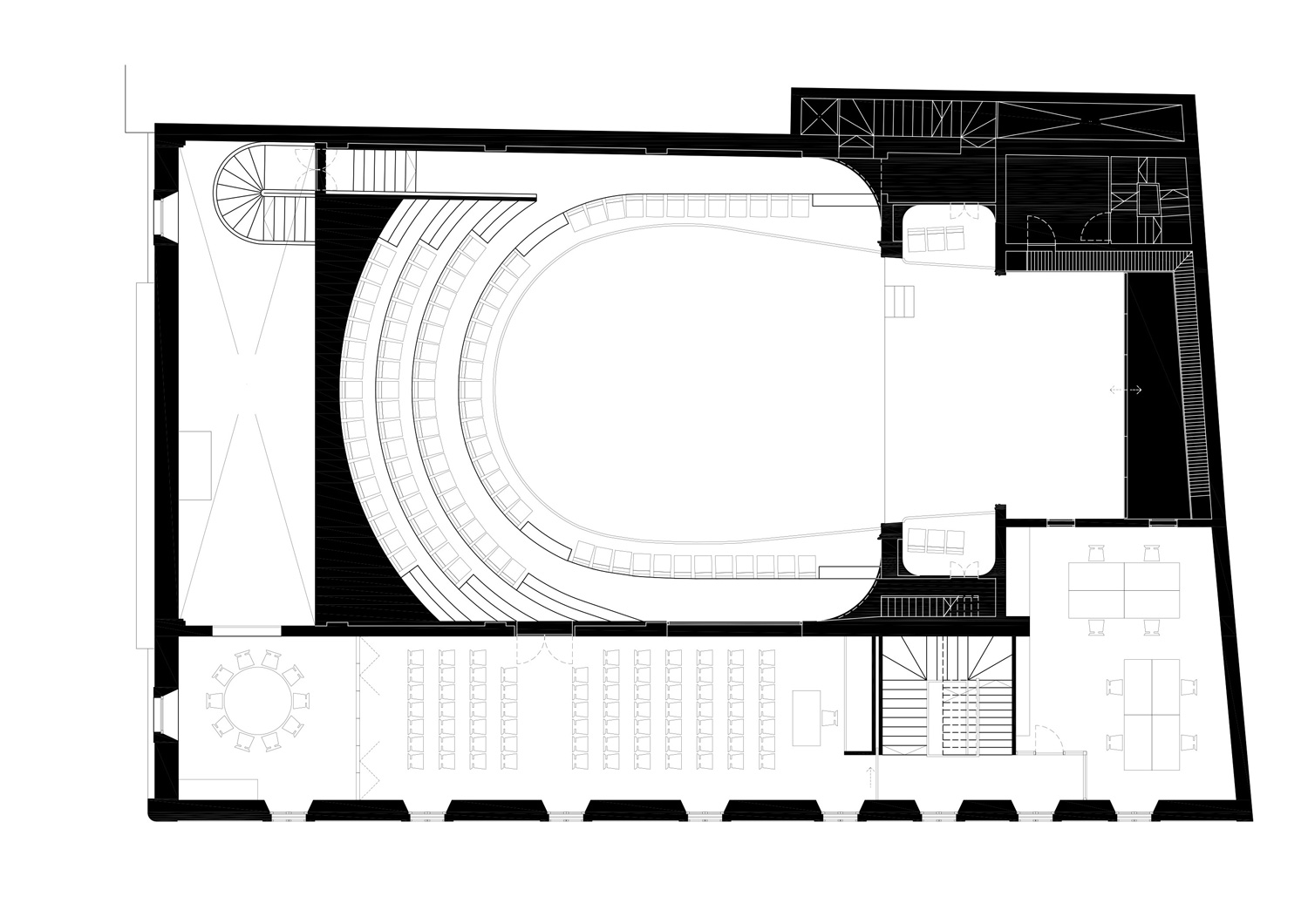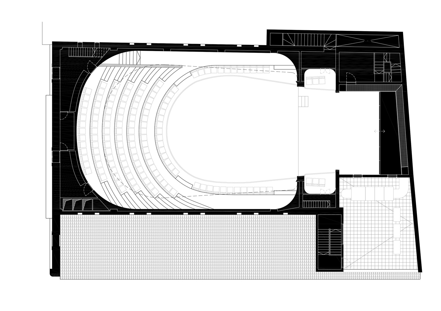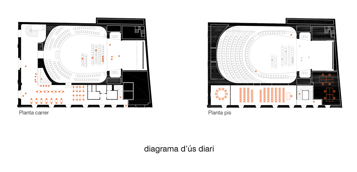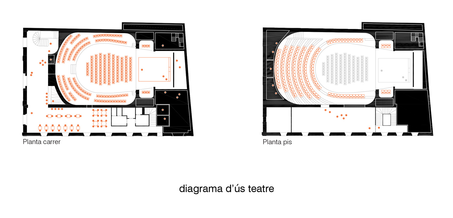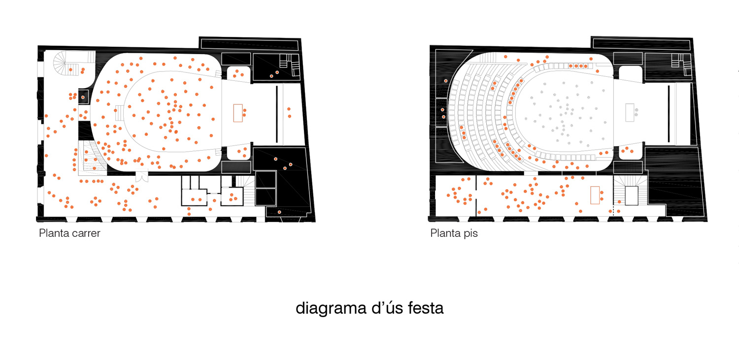 Els materials d’acabat i la forma de la sala principal estan dissenyats tant pel confort acústic dins la sala principal com per a que el soroll no escapi fora de la sala. Amb el sistema de “box-in-box” aquesta nova caixa incorpora tots els elements tècnics (acústica, so, llum, projeccions i escenografia) necessaris per a la realització d’obres de teatre professionals, cinema, concerts, congressos, festes o exposicions. Al voltant de la nova caixa es reformen els espais existents per tal de funcionar en conjunt o independentment i poder acollir diferents tipus d’activitats dins l’edifici. Per tal d’assegurar l’accessibilitat i la supressió de barreres arquitectòniques, a la planta baixa es conserven la major part dels nivells existents, d’aquesta manera es possibilita un recorregut accessible en planta baixa accedint des del c. Unió. En cas necessari, l’escenari també és accessible a través del sidestage esquerra. Degut a les limitacions de l’edifici existent i a les activitats que es duran a terme a la planta primera, s’opta per incorporar una plataforma elevadora a l’escala existent per tal d’assegurar l’accessibilitat a la planta primera.